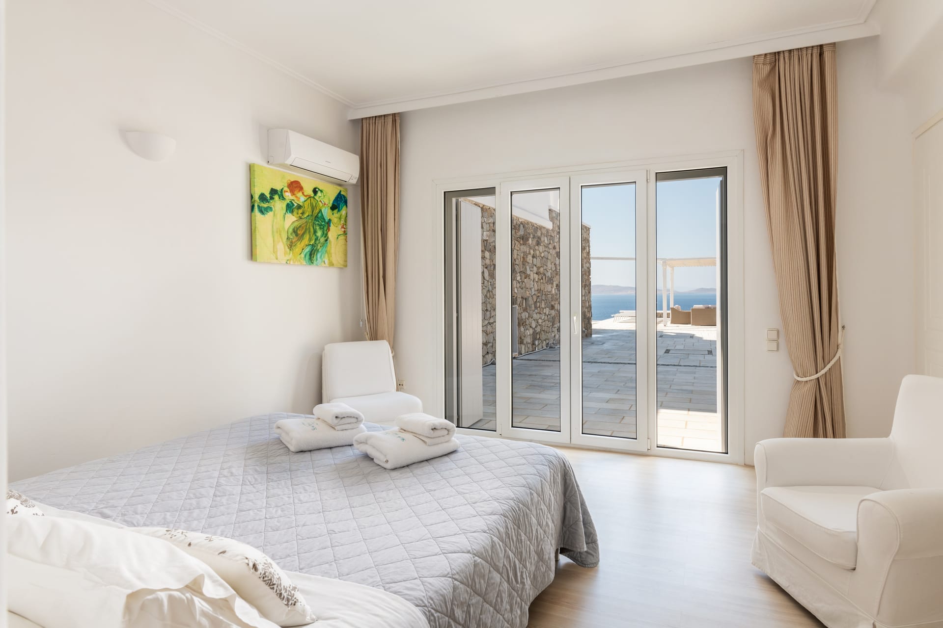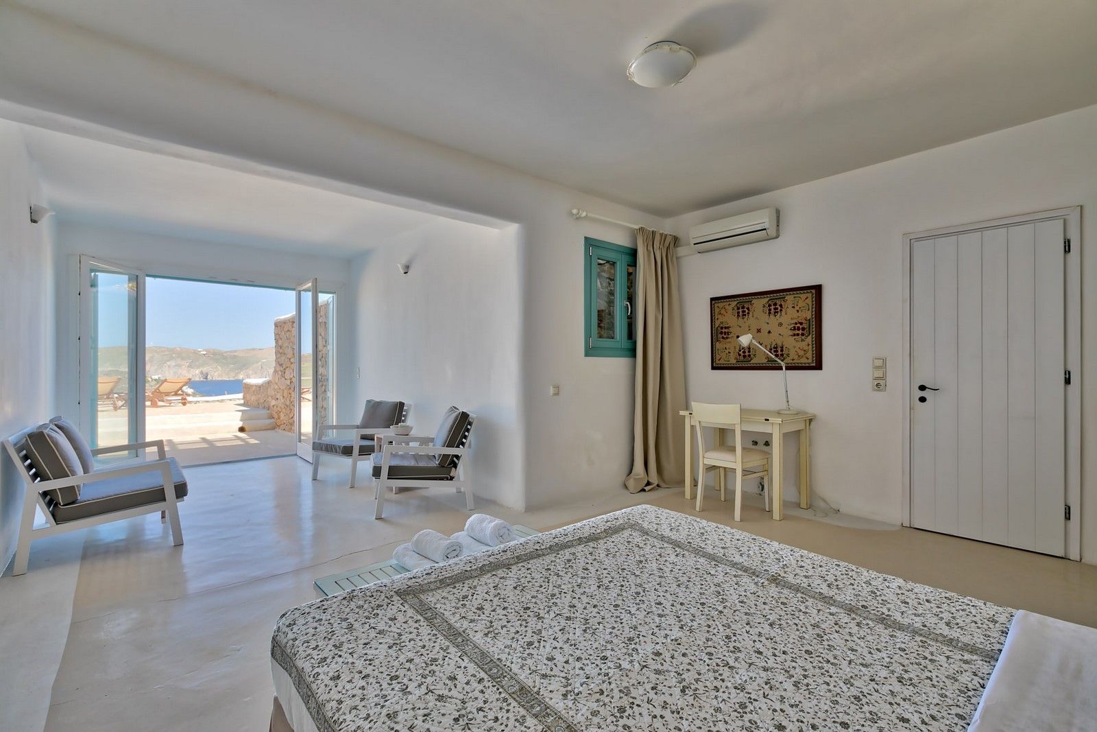 A master bedroom with King size bed, En-suite bathroom with shower, safe, Air conditioning, Access to private terrace, Sea view