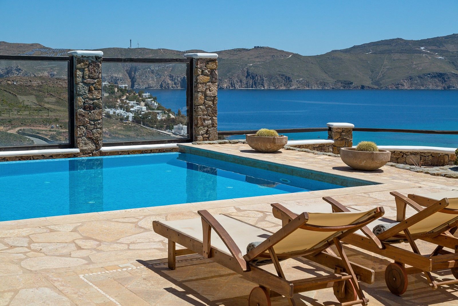 The living room is decorated with elegant and modern white furniture. The fully equipped kitchen and formal dining area feature large windows and balconies overlooking the pool and the sea, offering a panoramic view of the Aegean even while indoors. One master bedroom with TV, safe and en suite bathroom and one double bedroom with separate bathroom are located on the ground floor. The upper floor features a master bedroom with TV and safe and 2 similar bedrooms, all having their own en suite bathrooms and private terraces.