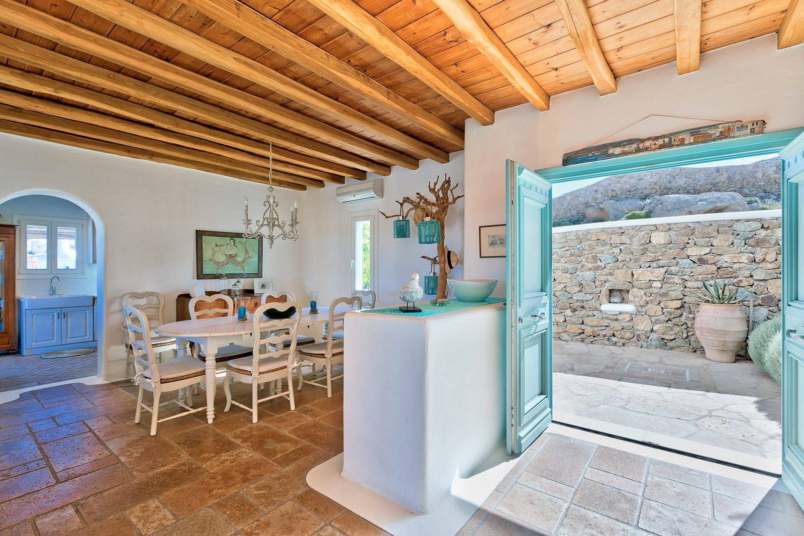 It is located just 4 km away from the Town, 5 km from the airport and 1.5km from Ornos.