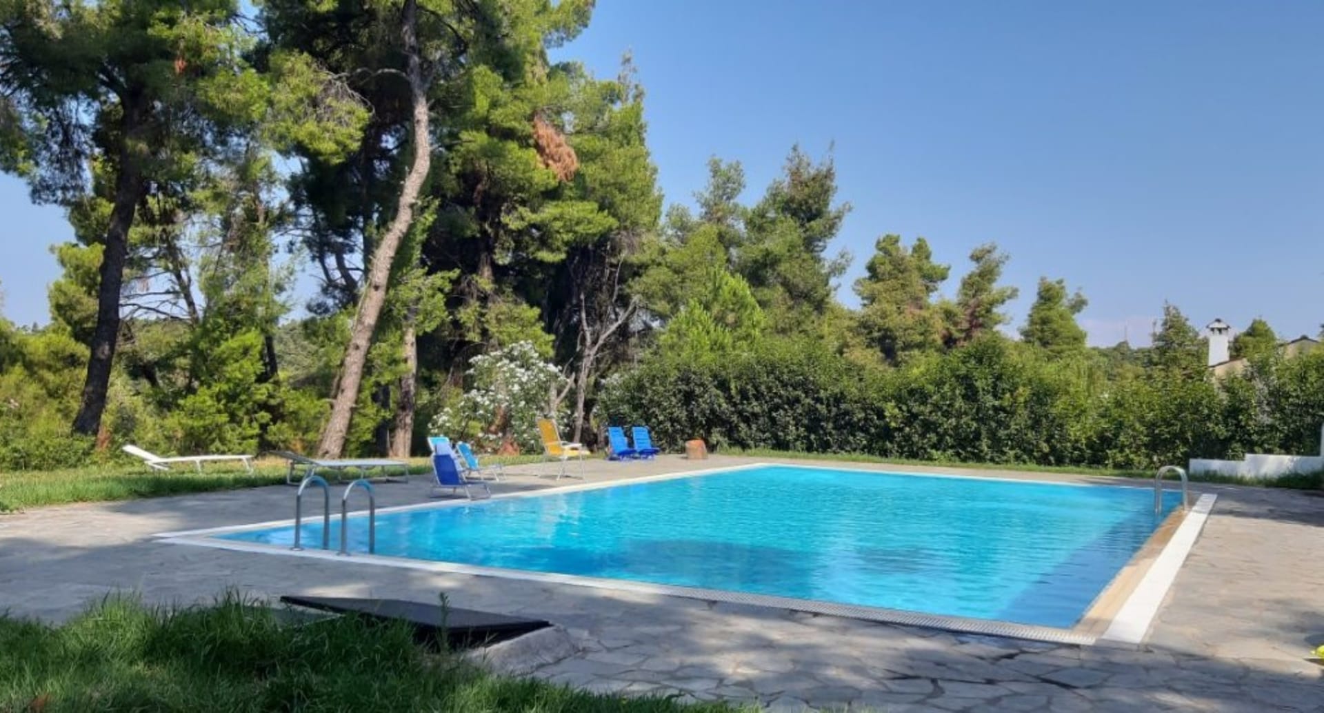 The pinewood forest around brings a pleasant breeze on warm summer days and the footpath starting from the villa's garden leads you the shared pool of the complex.