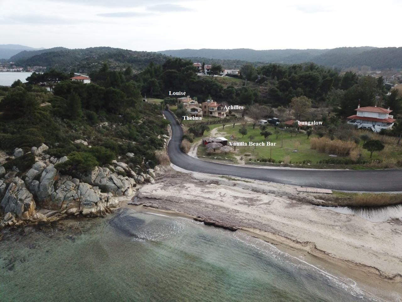 Ormos Panagias, the nearest village, is ideally situated to the east side of Sithonia. It is a small fishermen's village, with fish taverns, a bar, bakery and mini market. Some of the best beaches of Halkidiki are located at a close distance (Vourvourou, Kalamitsi etc.), and the town of Nikiti, a highly touristic one, is less than 10 kilometers away and is worth a visit for a wider range of restaurants and large supermarkets.