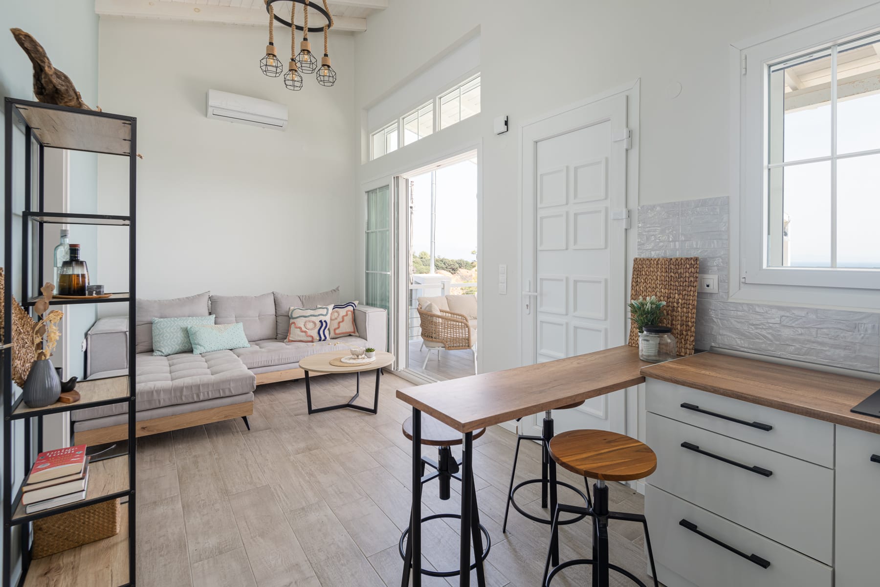 Upon entering, guests are greeted by a warm and inviting ambiance. The living area features comfortable furnishings,a TV, and an A/C unit, inviting guests to unwind and soak in the serene atmosphere. Large windows flood the space with natural light, framing stunning vistas of the sea that stretch out before you.