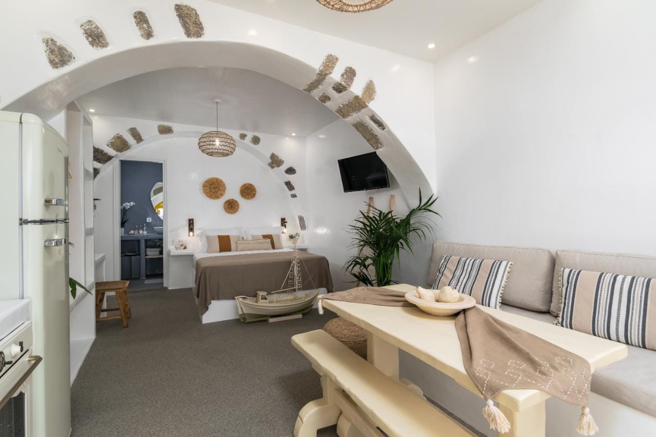 The living room is so luminous and features two sofas, an A/C unit, coffee tables and a smart TV, while the huge stone-made fireplace which is placed here makes it even cozier. Attached to the living room, there is a fully equipped kitchen, with a dining table and all the essential electrical appliances, a dishwasher, a washing machine and a filter coffee machine.