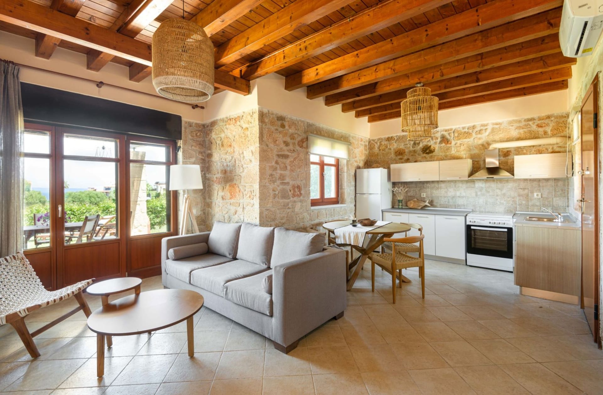 Rastoni Retreat 3 is a newly 2-bedroom house: on the ground floor guests can find the open plan kitchen and living room with direct access to the front patio.