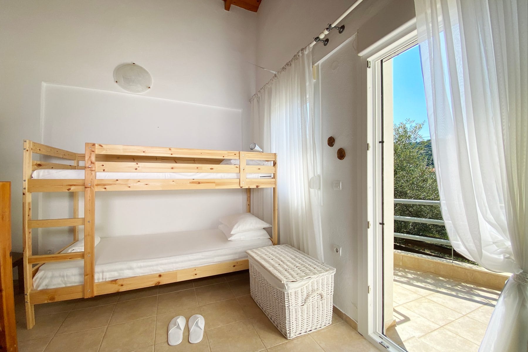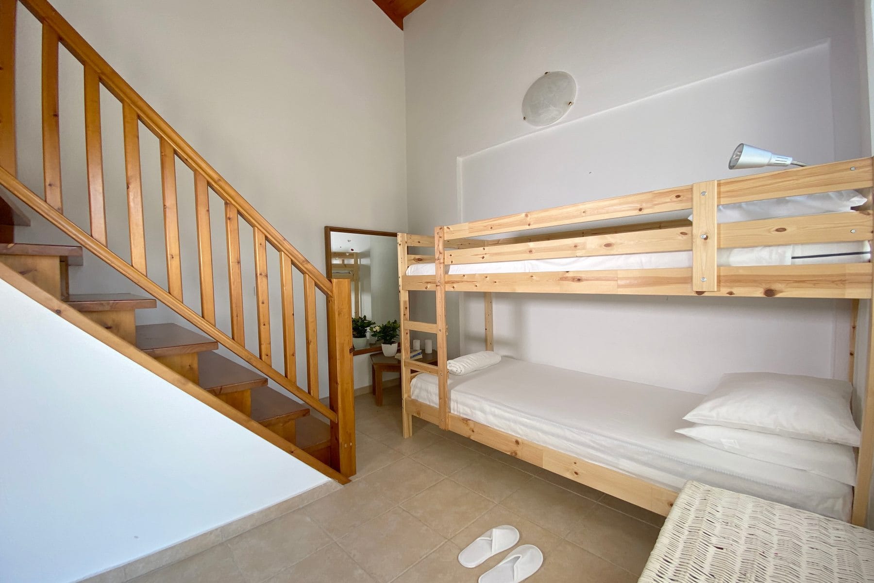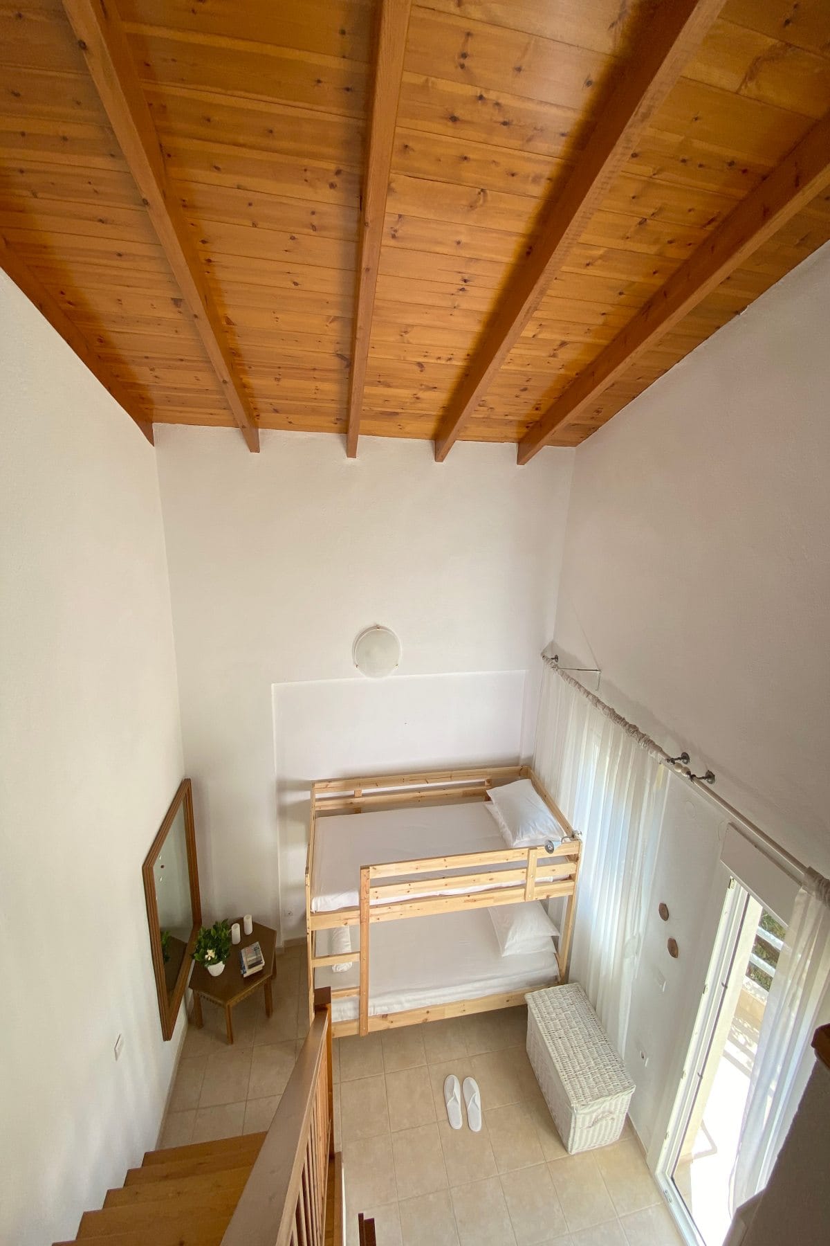 The first floor features a bedroom with a double bed, another bedroom with a bunk bed, where these two bedrooms are connected by a staircase, and there is also an A/C unit,TV and a balcony. Additionally, there is a bathroom with a shower.