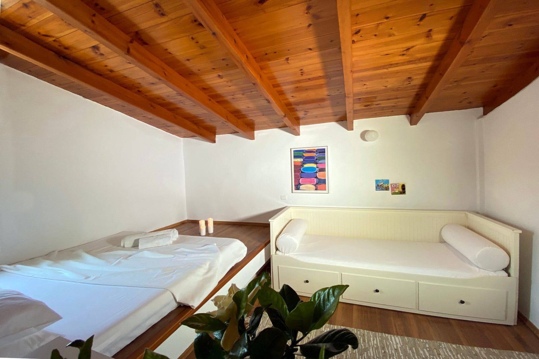 On the second floor, a modern attic awaits you. This area is thoughtfully designed, featuring a comfortable double bed and an additional single bed, offering flexibility for sleeping arrangements.There is also an A/C unit.