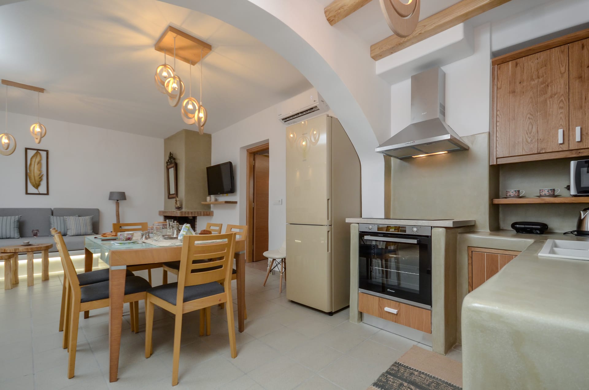The fully equipped kitchen includes a stovetop, refrigerator, oven, and kitchenware, plus a BBQ for outdoor dining. Additional amenities: washing machine, flat-screen TV with streaming services, and a terrace with garden views.