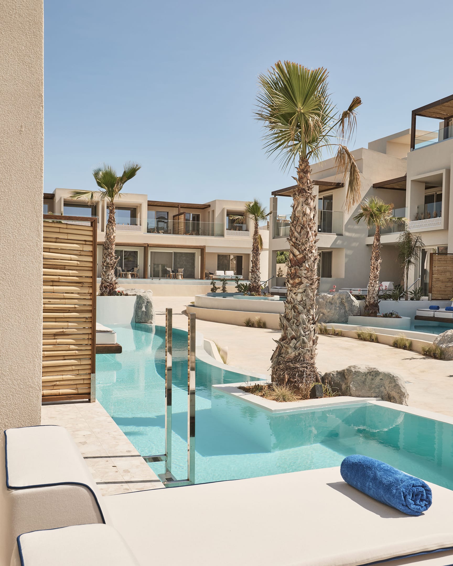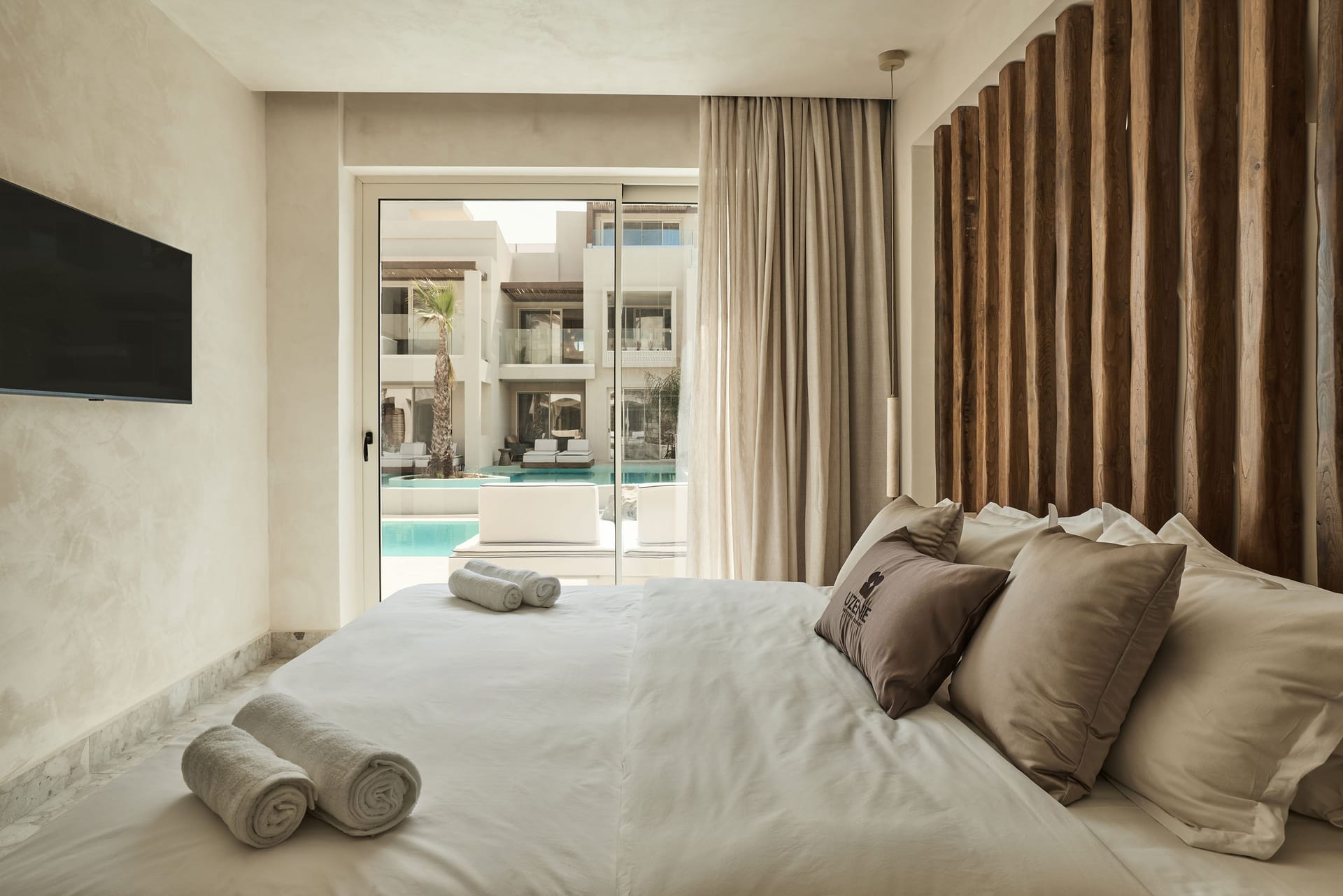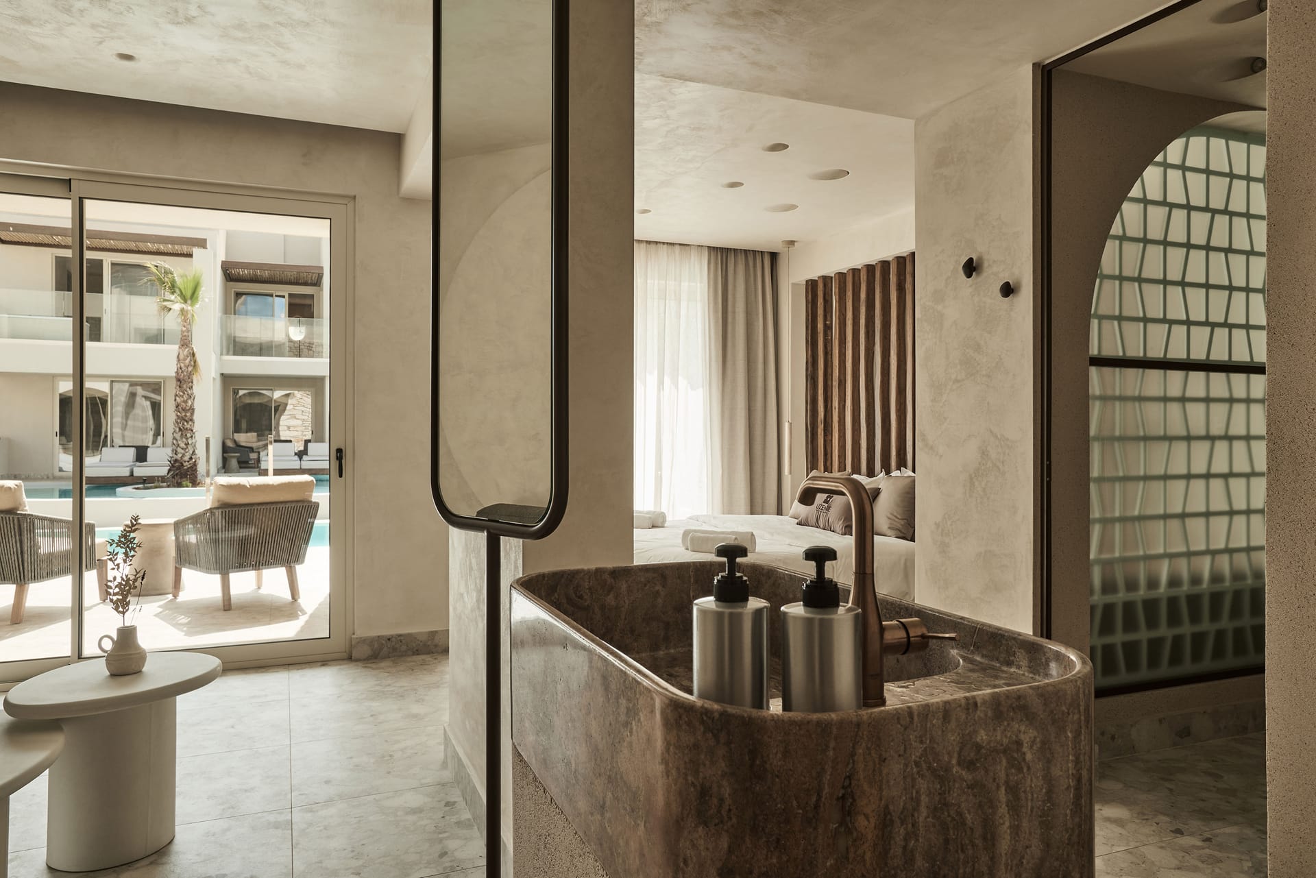 The Tranquil Suite offers a serene escape with modern design and earthy tones, creating an atmosphere of pure relaxation. This open-plan suite features a King Size bed with premium COCO-MAT© sleep system & high-quality linens, along with a sofa bed, ideal for up to 3 guests. Experience ultimate convenience with the Smart Hotel Room System, allowing you to personalize lighting and air-conditioning to suit your preferences. Step onto your private terrace and enjoy exclusive access to your own Pool, surrounded by natural elements that enhance the peaceful ambiance.