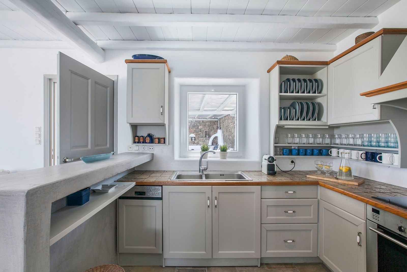 The flexible sleeping arrangements make it a breeze for parents with children, couples or friends. The purity of the white walls inside and out lends the structure a dream-like, ethereal feeling with modern yet minimalist furniture and finishes throughout. Arches and double-pane windows and patio doors grace the villa and let welcome sunshine in, while enjoying a warm awakening.