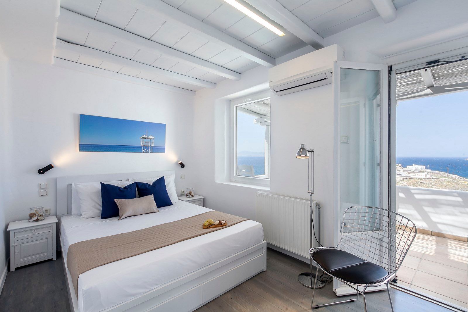 Ornos beach is only a five-minute drive from the villa…lovely! Lovelier so is the fact that after a fun-filled day out exploring the island, one can take an evening dip in the pool and rest on the inviting plush sun-beds. Villa Claire offers beautiful exterior landscaping complete with breathtaking pool resting at the crest of the Villa’s grounds, unobstructed sea views, shaded dining area as well as wooden deck with lounge areas. Yours to spoil your senses!