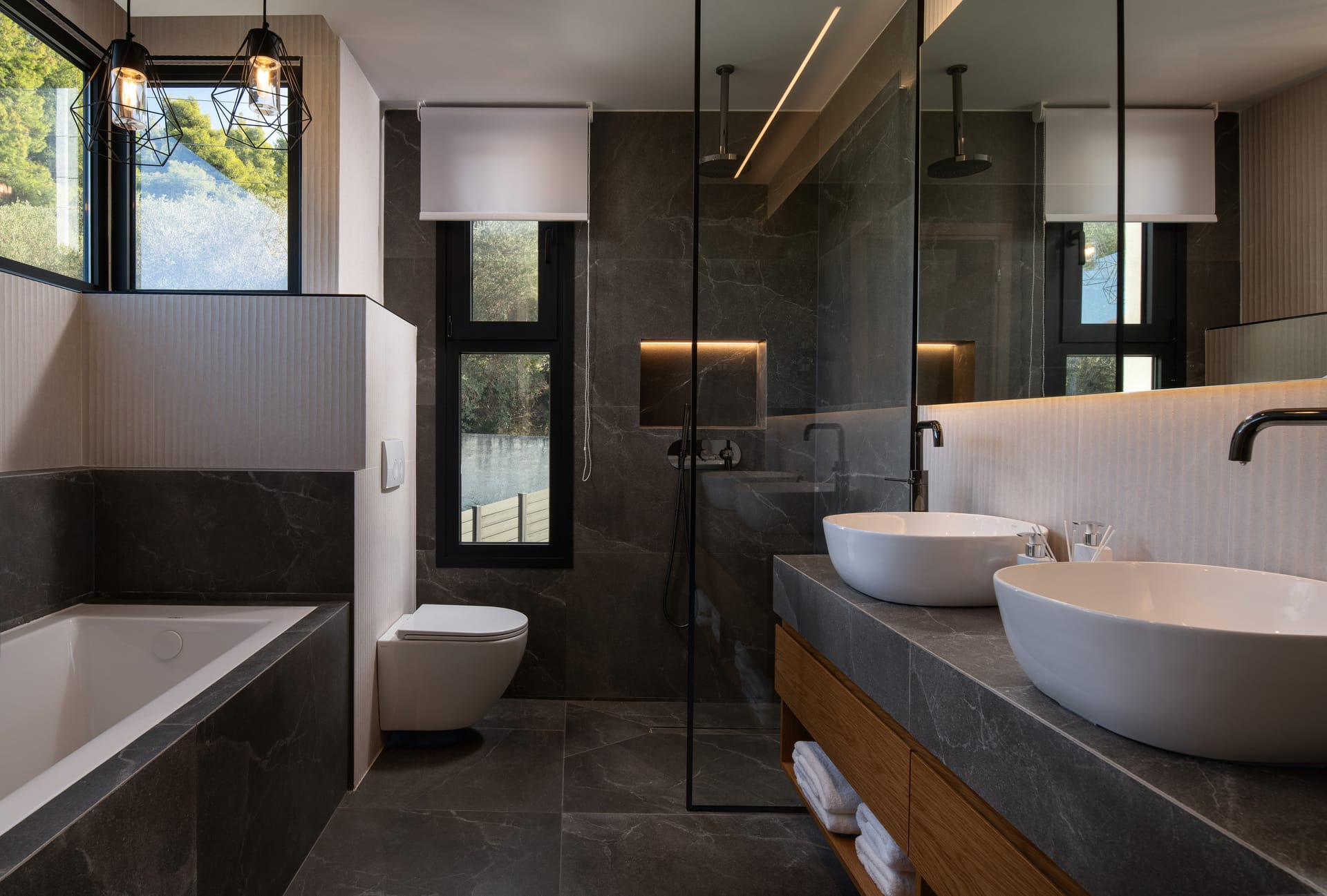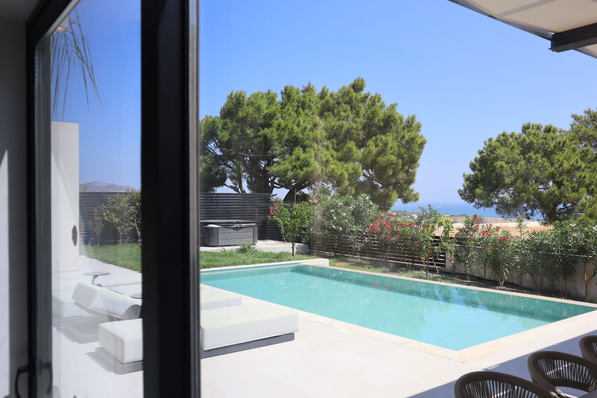 The villa is formed in 3 levels, the lower level consists of a living room, 3 bedrooms, 3 bathrooms, and has direct access to the garden. On the ground floor (pool level) there is a fully equipped with modern appliances open-spaced kitchen, dining area, guests’ WC, living room and outdoor, pergola covered dining area. The master bedroom is located on the first floor, with amazing sea view and access to an outdoor sitting area. Villa Sunshine also has 2 independent guest-houses on the lower level, both of them with direct access to the garden.