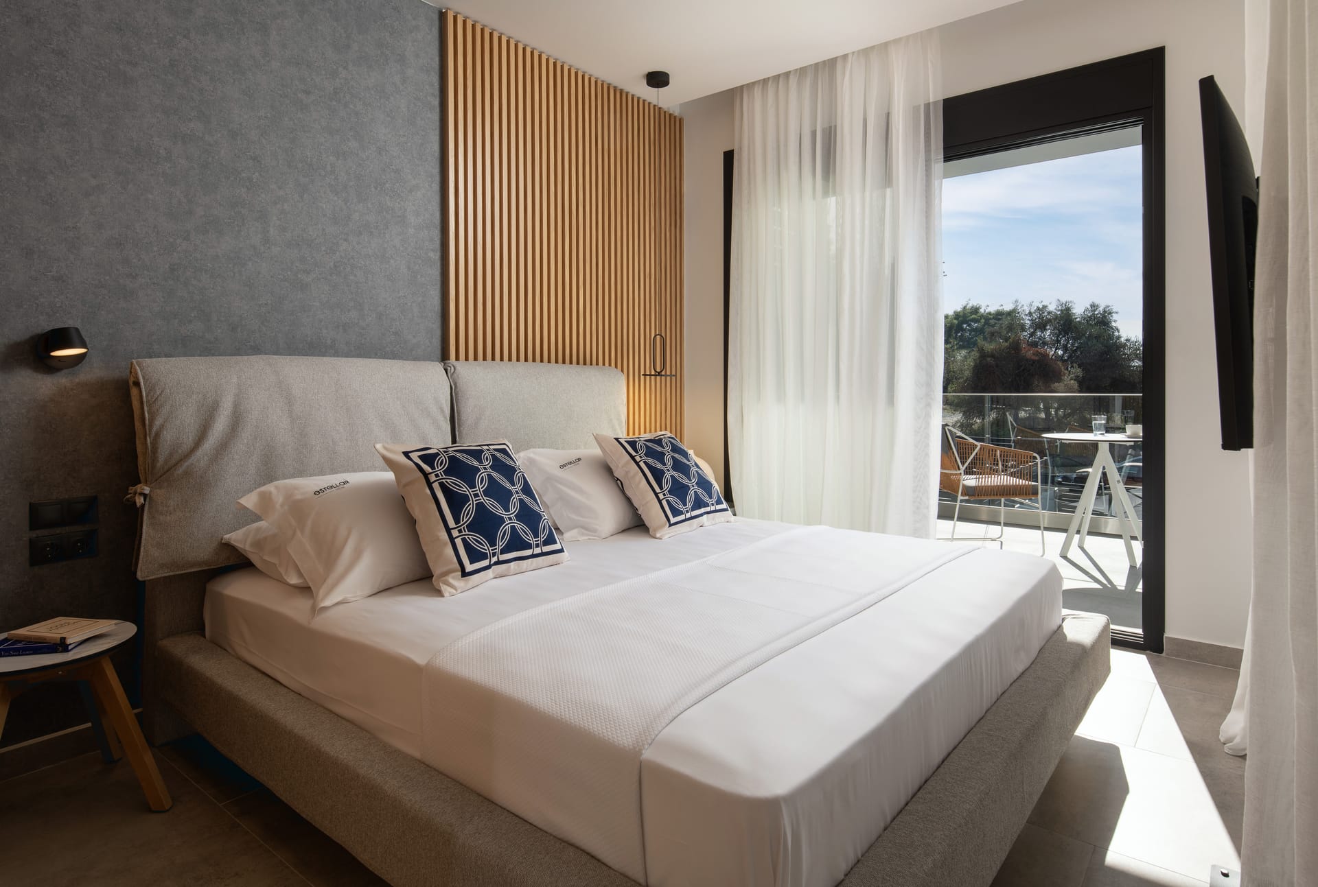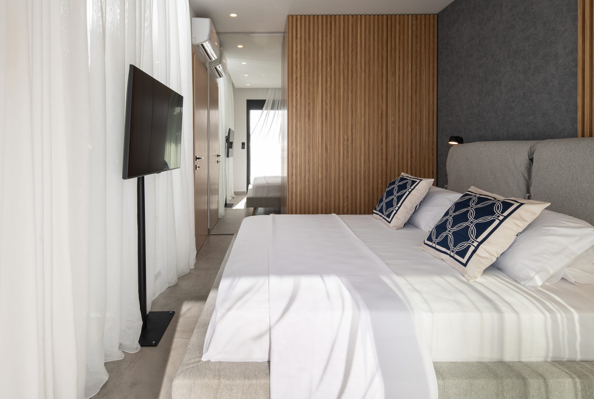 - Master bedroom with double bed, en-suite bathroom, window with sea view, balcony, roof fan, TV and A/C.