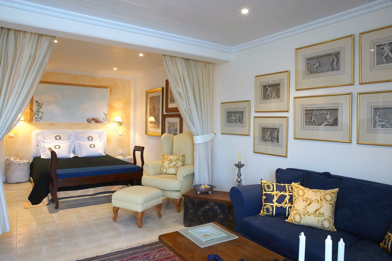 2nd bedroom (1st level): One bedroom with a King size bed, a private marble bathroom with bathtub and shower, an open plan sitting room and a dining area with a kitchenette; a card playing corner furnished with beautiful antique pieces and an authentic English card table. Only a drop away from the morning pool splash.