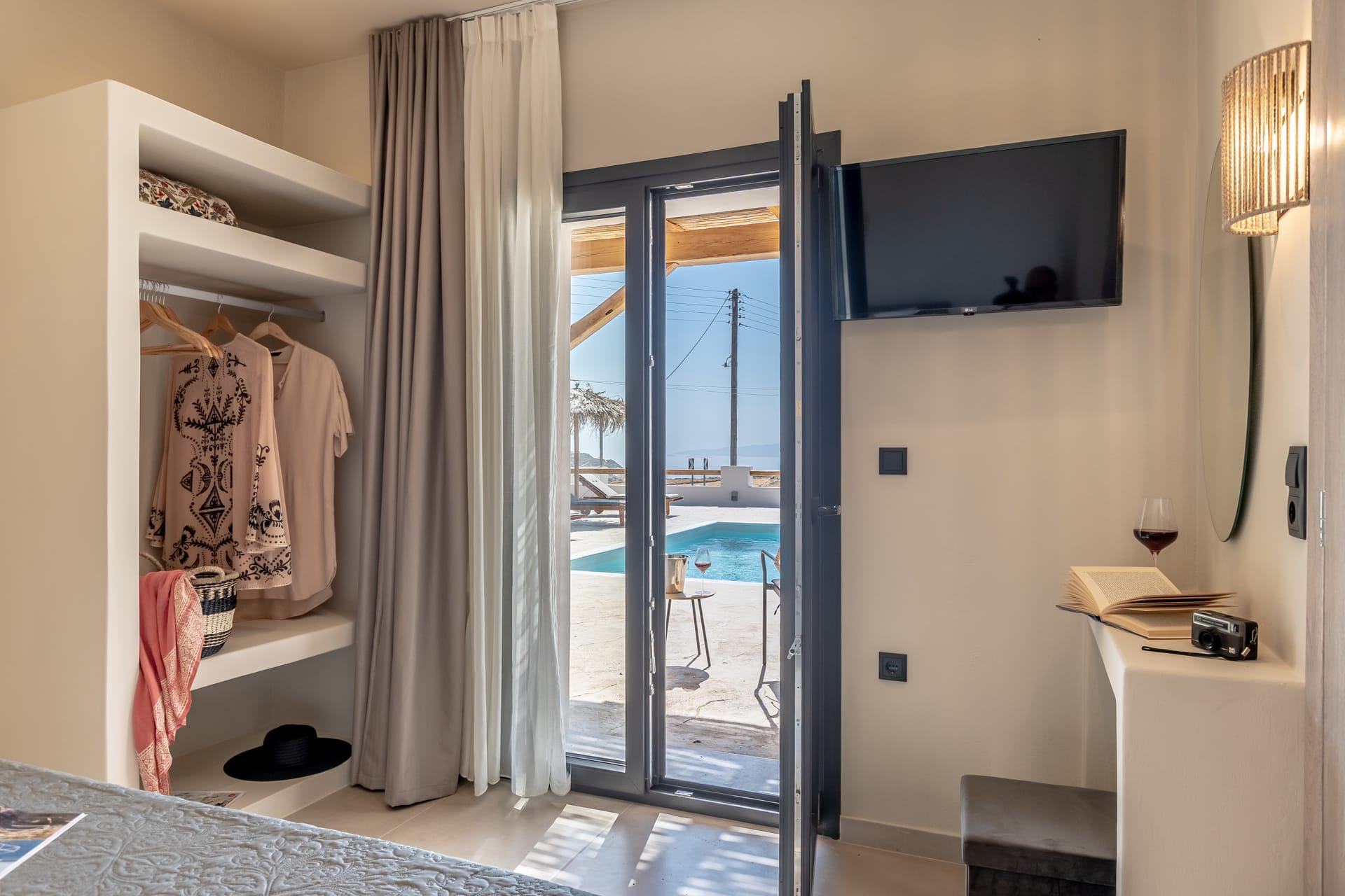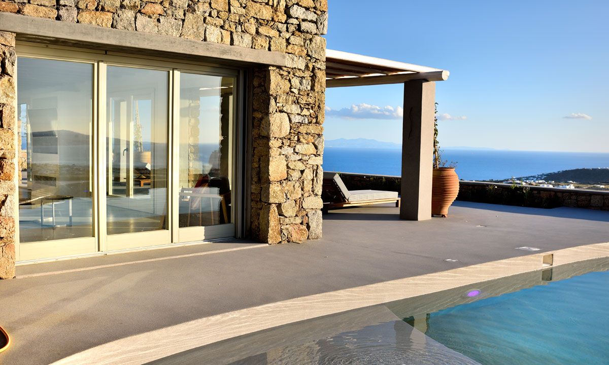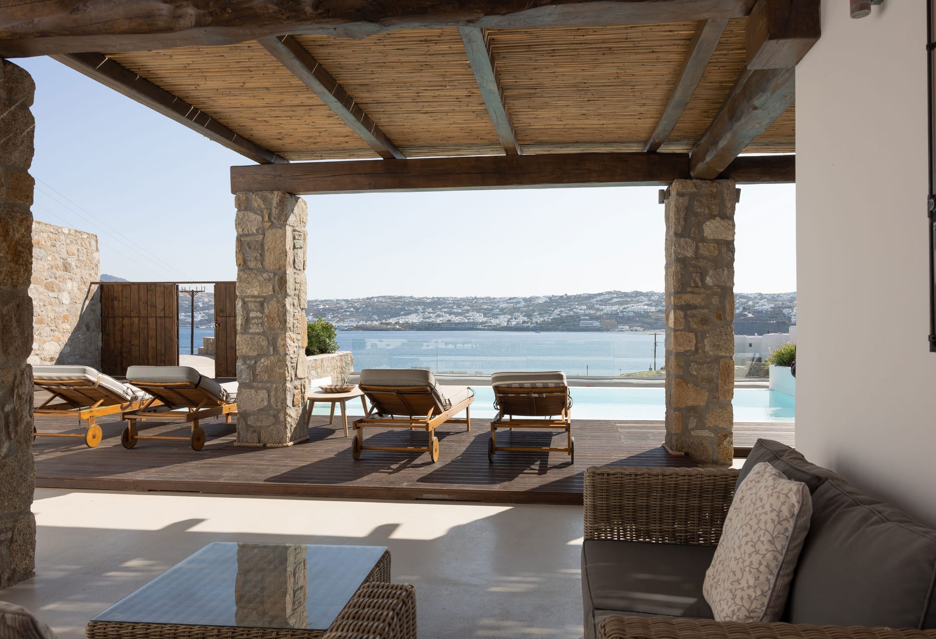 Indoors, guests enjoy spacious living areas, a fully equipped kitchen, and elegant bedrooms that blend Cycladic architecture with modern comforts. Outdoors, the private swimming pool, sun loungers, and shaded veranda provide the ideal setting for relaxing moments under the warm Aegean sun.