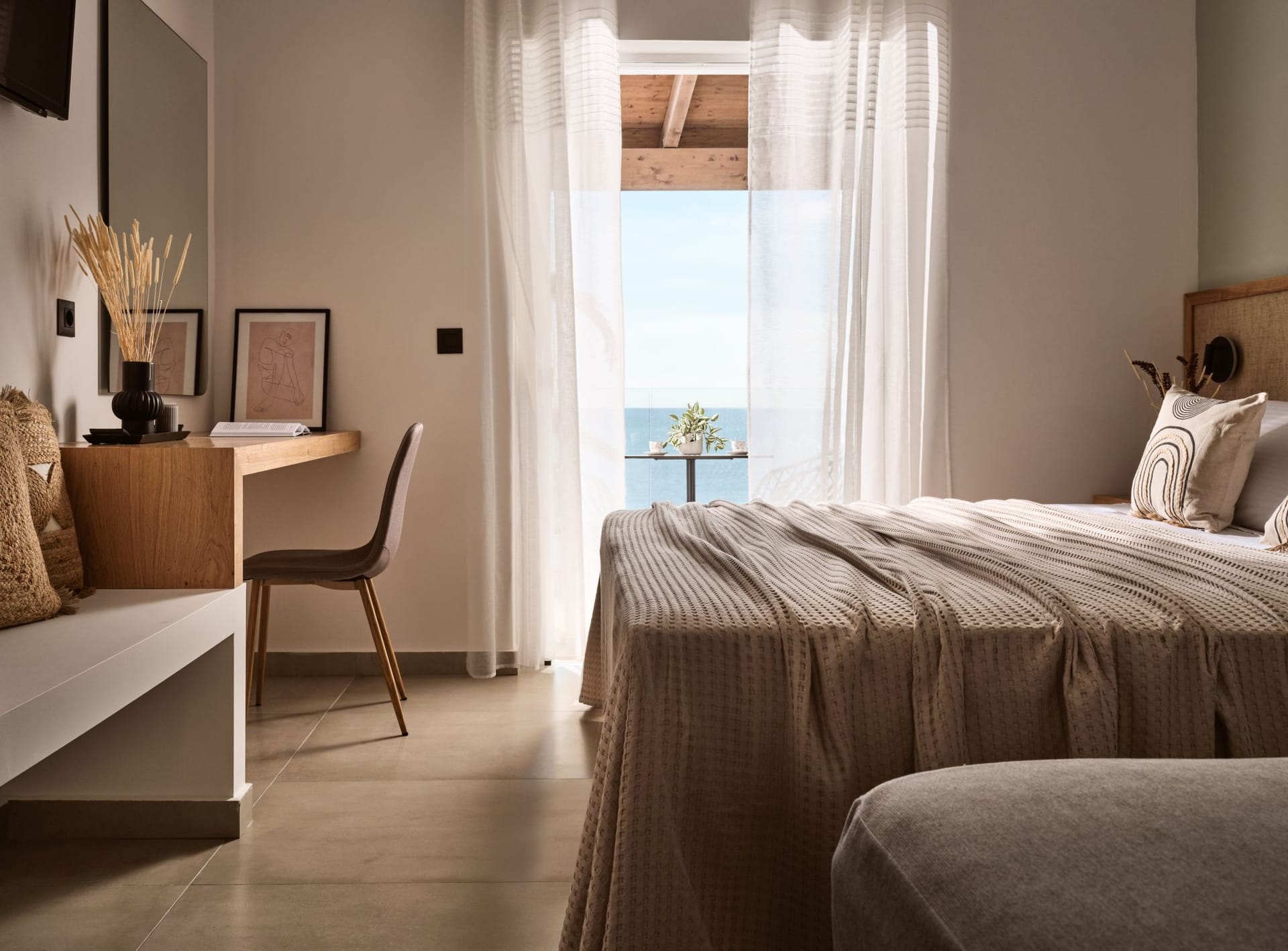 The Deluxe Sea View Rooms are located on all three levels (ground floor, first floor, second floor) and can accommodate up to 2 guests. The studios feature 2 single beds, that can be combined into a double bed if you wish. There is also a fully renovated bathroom with a shower and a balcony with a view of the sea.