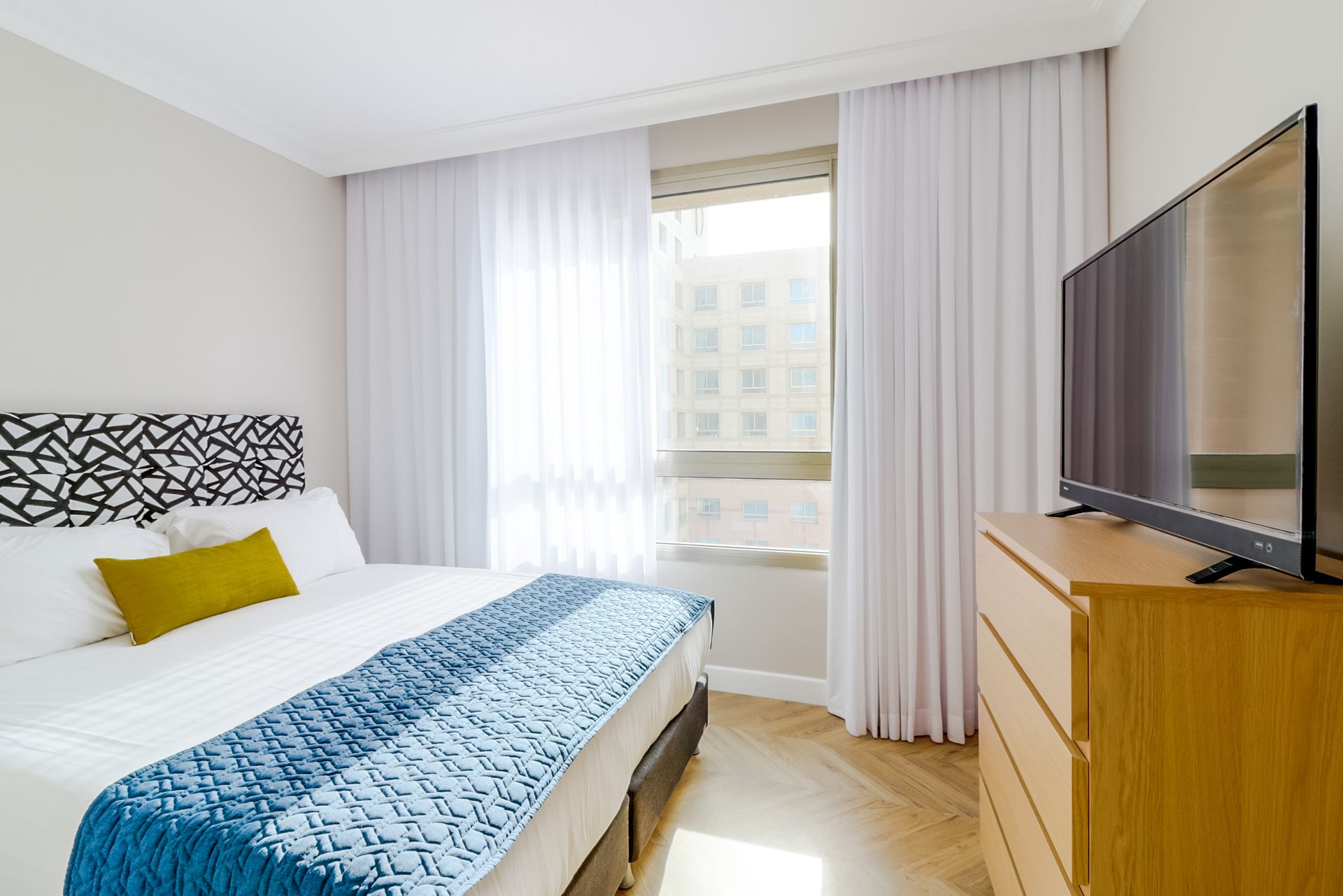 Each bedroom features an ultra-large bed, while the living room sofa easily converts into a bed for two. Experience the utmost comfort with hotel-standard premium linen, plush pillows, and cozy comforters throughout your stay.