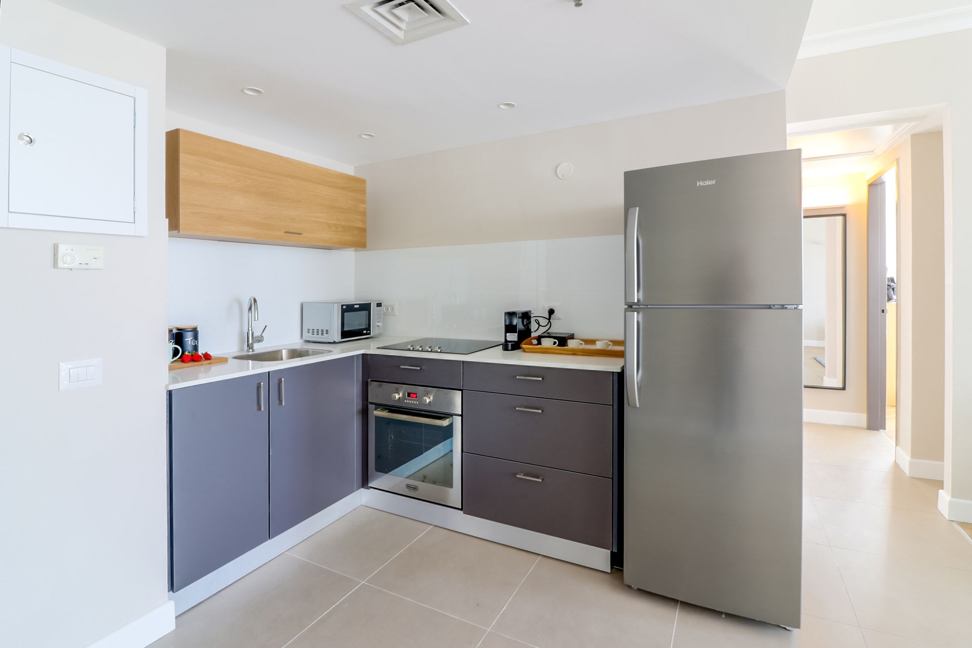 The modern bathrooms are stocked with fresh towels, a hairdryer, and luxurious L'Occitane en Provence toiletries, replenished as needed. The fully functional kitchen is equipped with all the essentials for preparing and serving delicious meals.