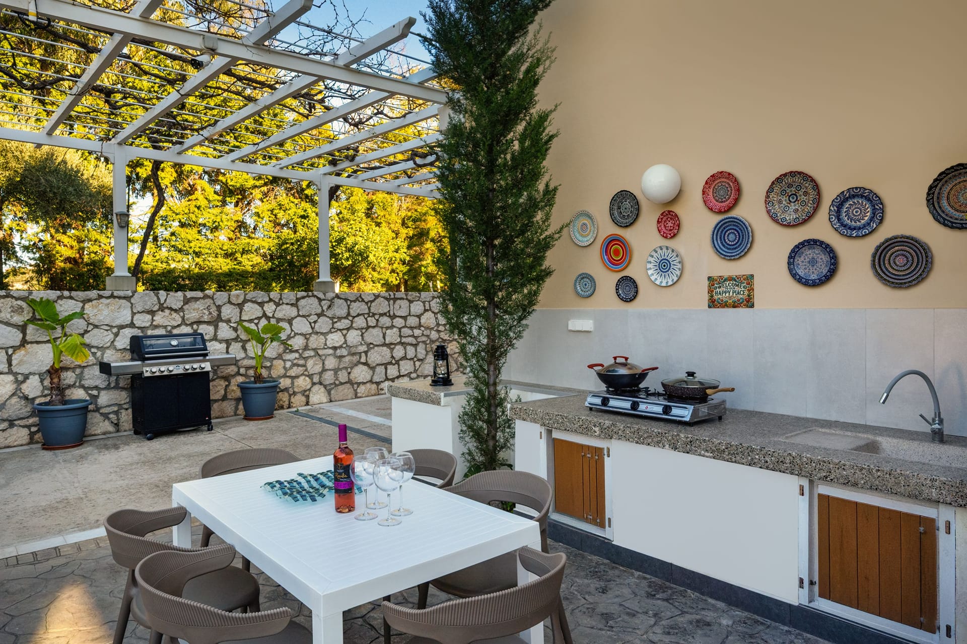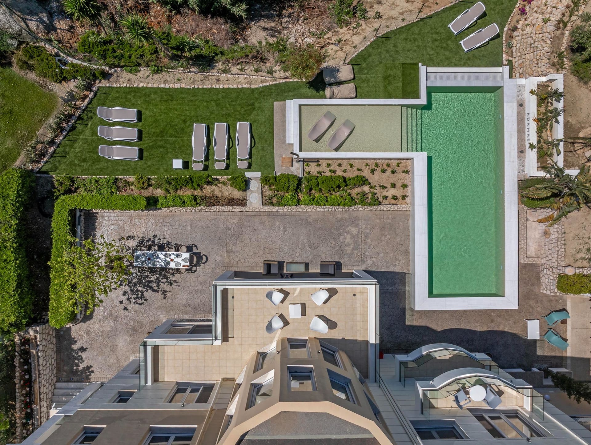 The villa’s outdoor area features a large swimming pool for adults and a smaller pool for children, surrounded by sunbeds and elegant outdoor furniture. A shaded pergola offers a serene spot for lounging or dining al fresco, and the gas BBQ enhances the outdoor living experience.