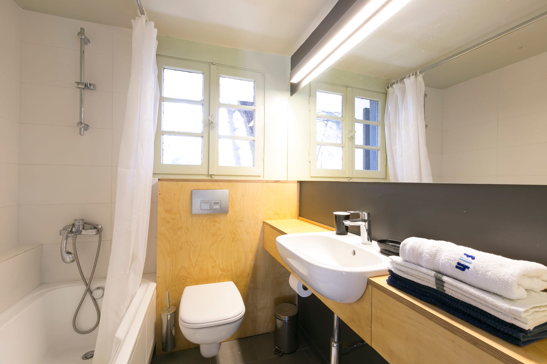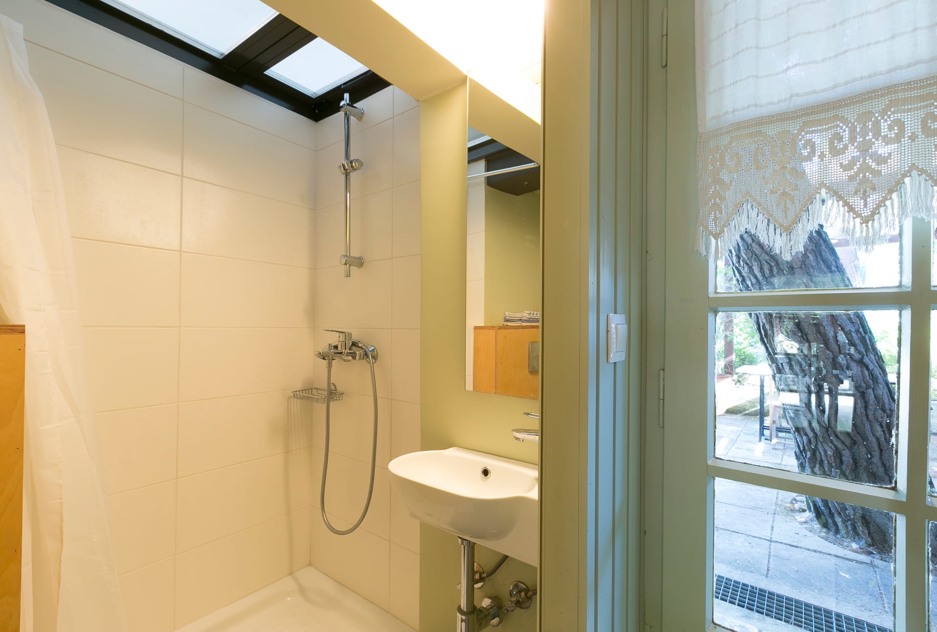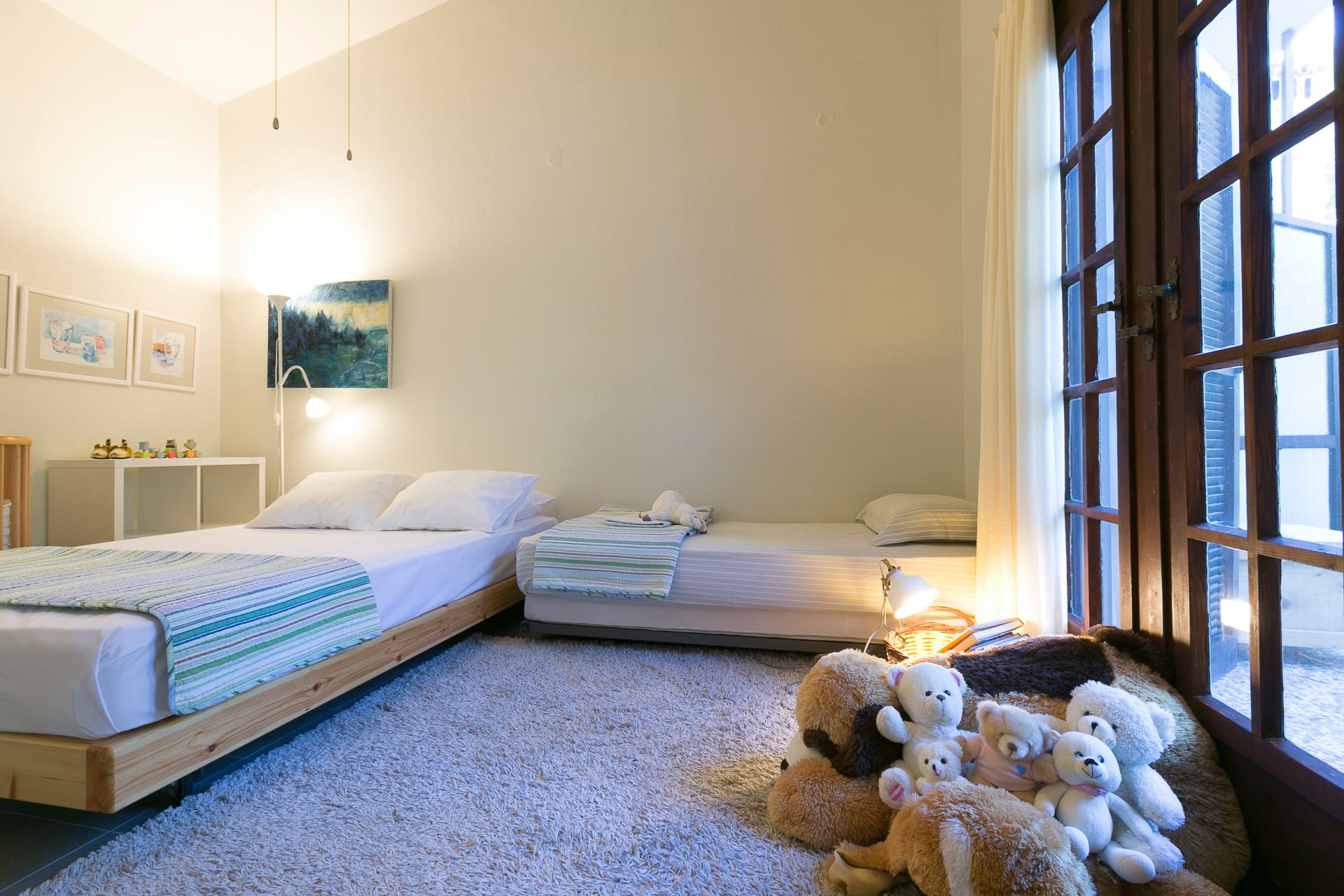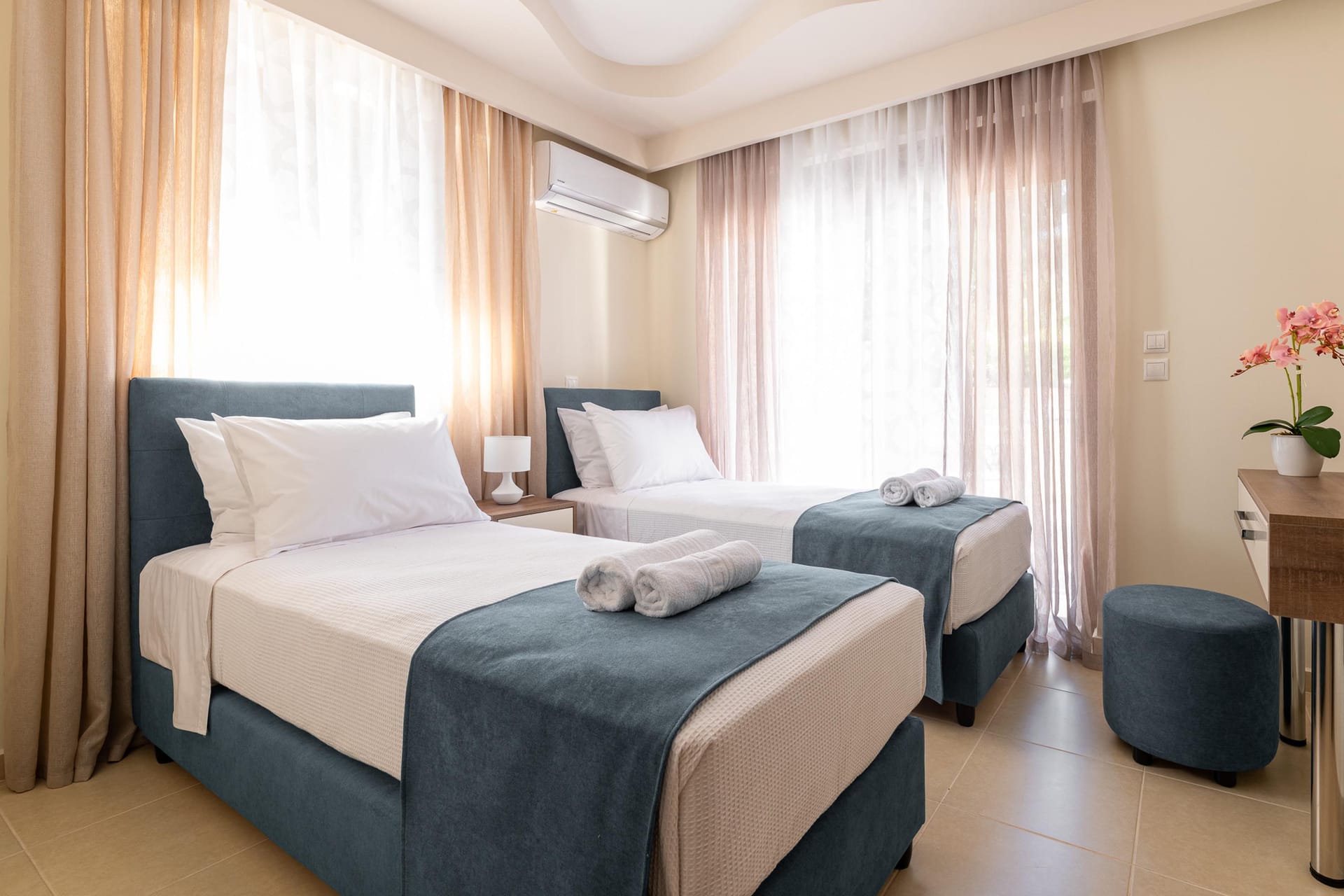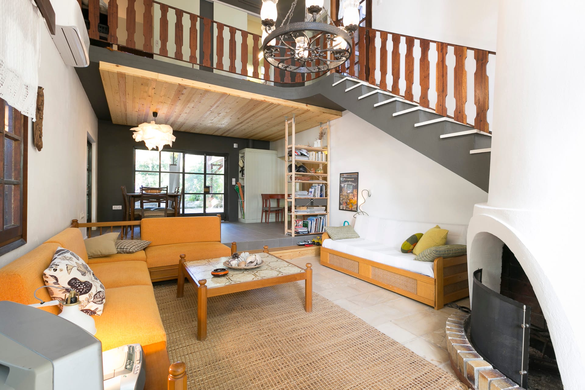 On the first floor, you’ll find 3 fully air-conditioned bedrooms. Two of the bedrooms have double beds, while the third room features twin beds. There is also a bathroom with a bathtub for your convenience. The open-plan kitchen is fully equipped for preparing meals, and the comfortable living area includes a sofa and additional seating areas. A double sofa bed is also available for extra guests.