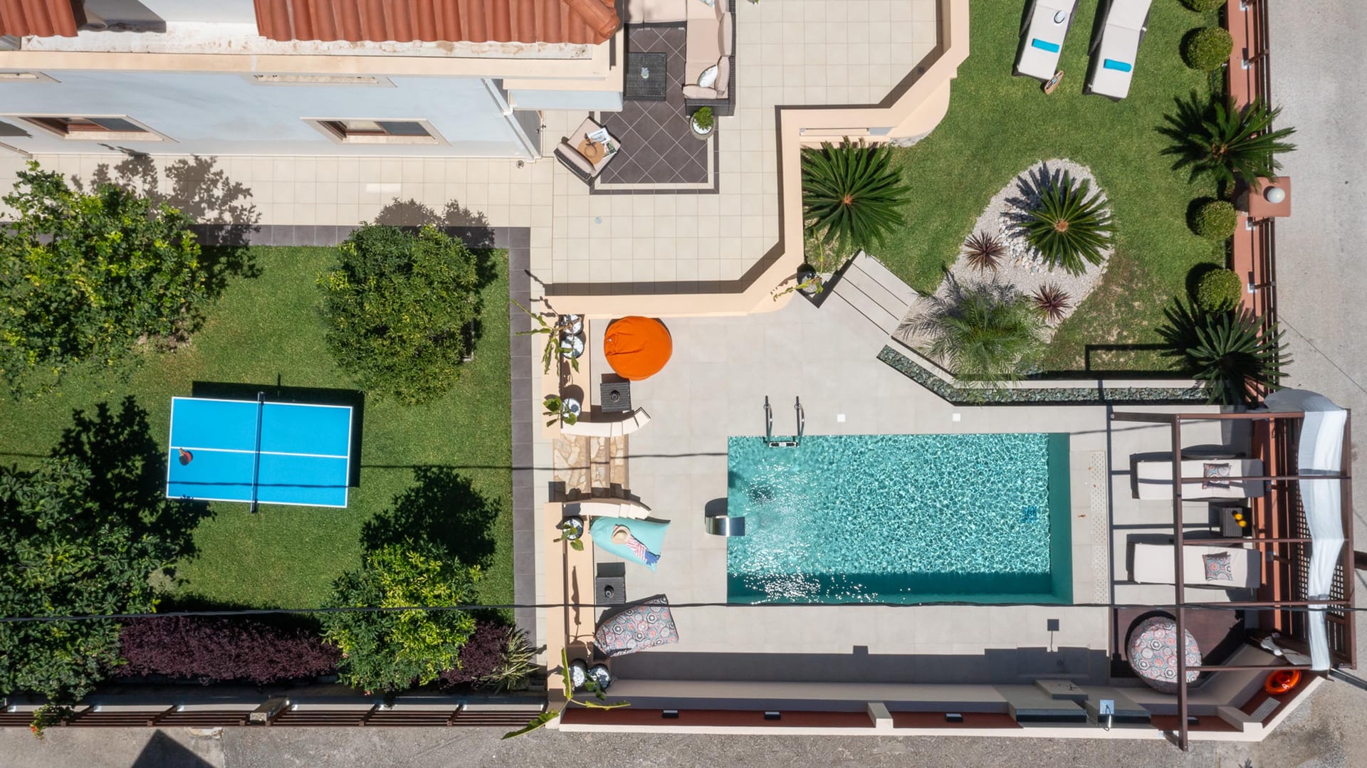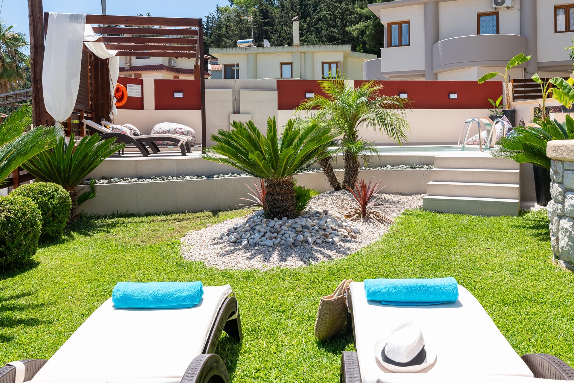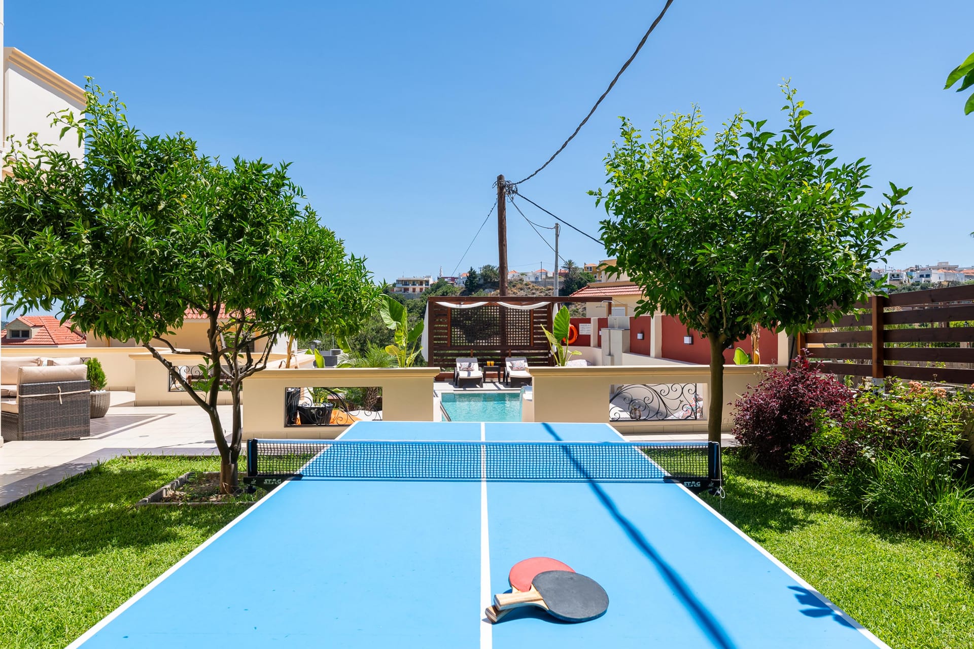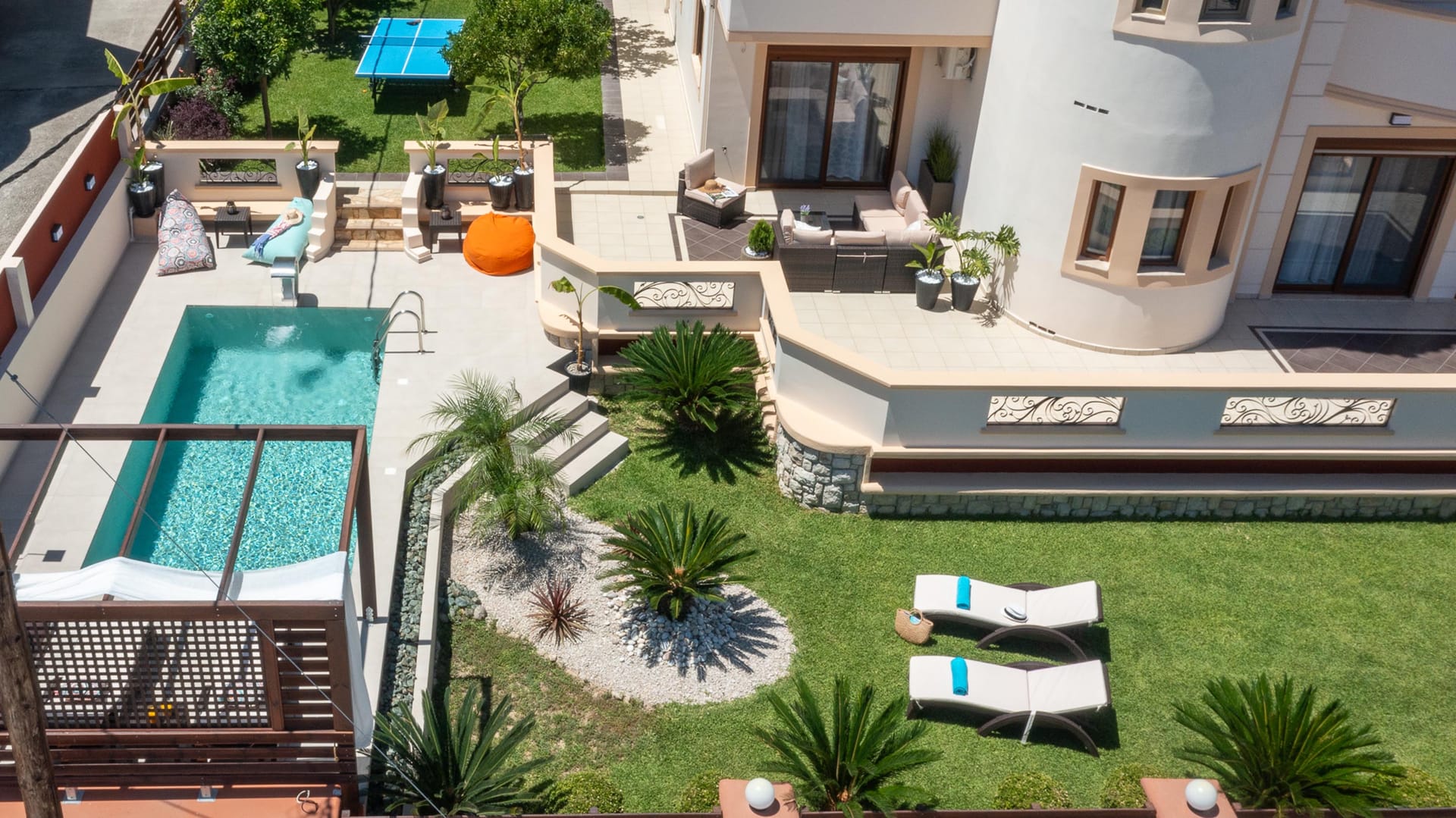 The outdoor area is a true highlight, with a beautiful private swimming pool surrounded by sunbeds. You’ll also find an incredible sitting area and BBQ facilities, perfect for gatherings with friends or family. Amarilia House is ideally located in a stunning natural setting, with lush grass and blooming flowers. The main courtyard provides a peaceful space for complete relaxation, offering a panoramic view of the surroundings.