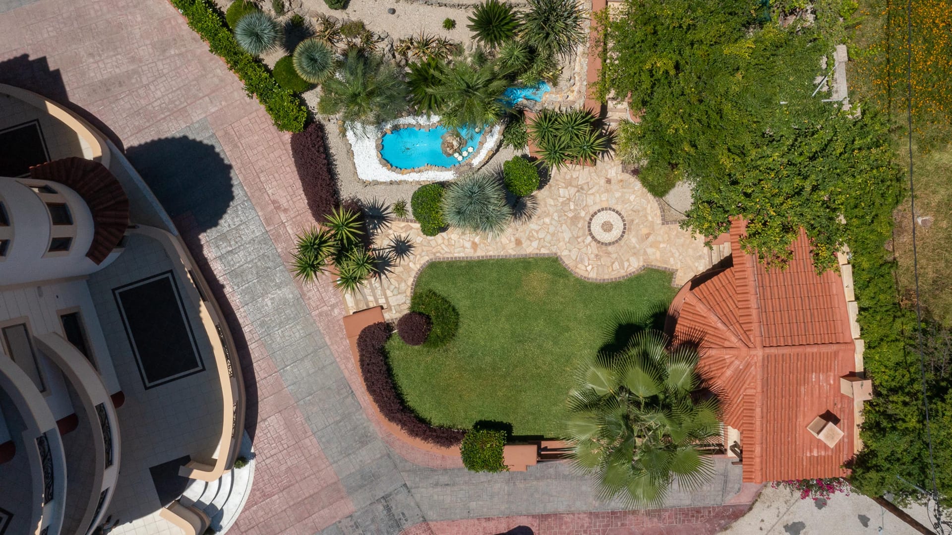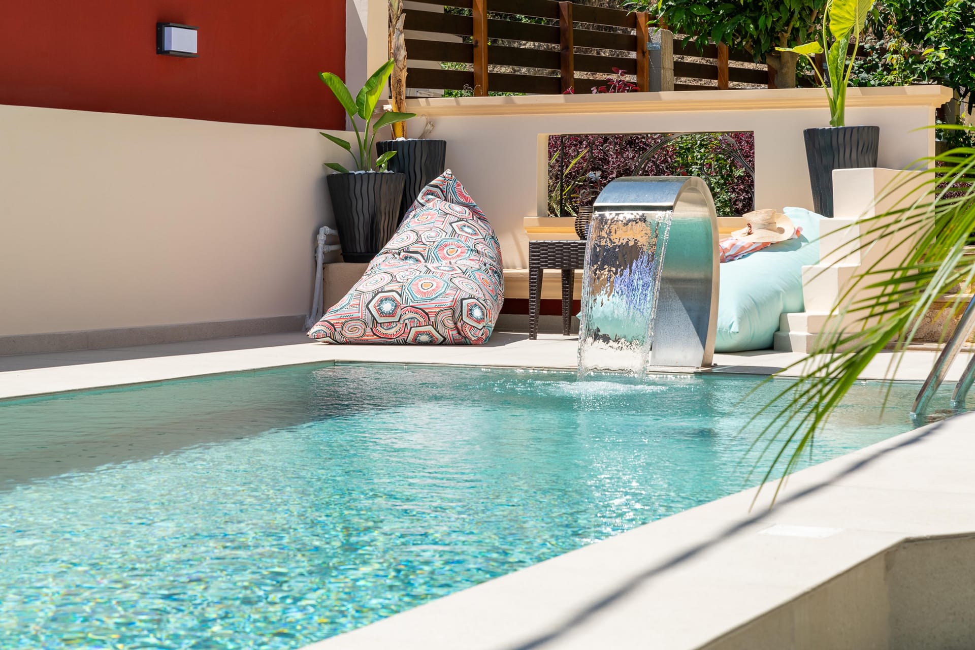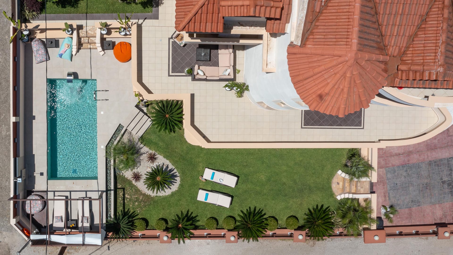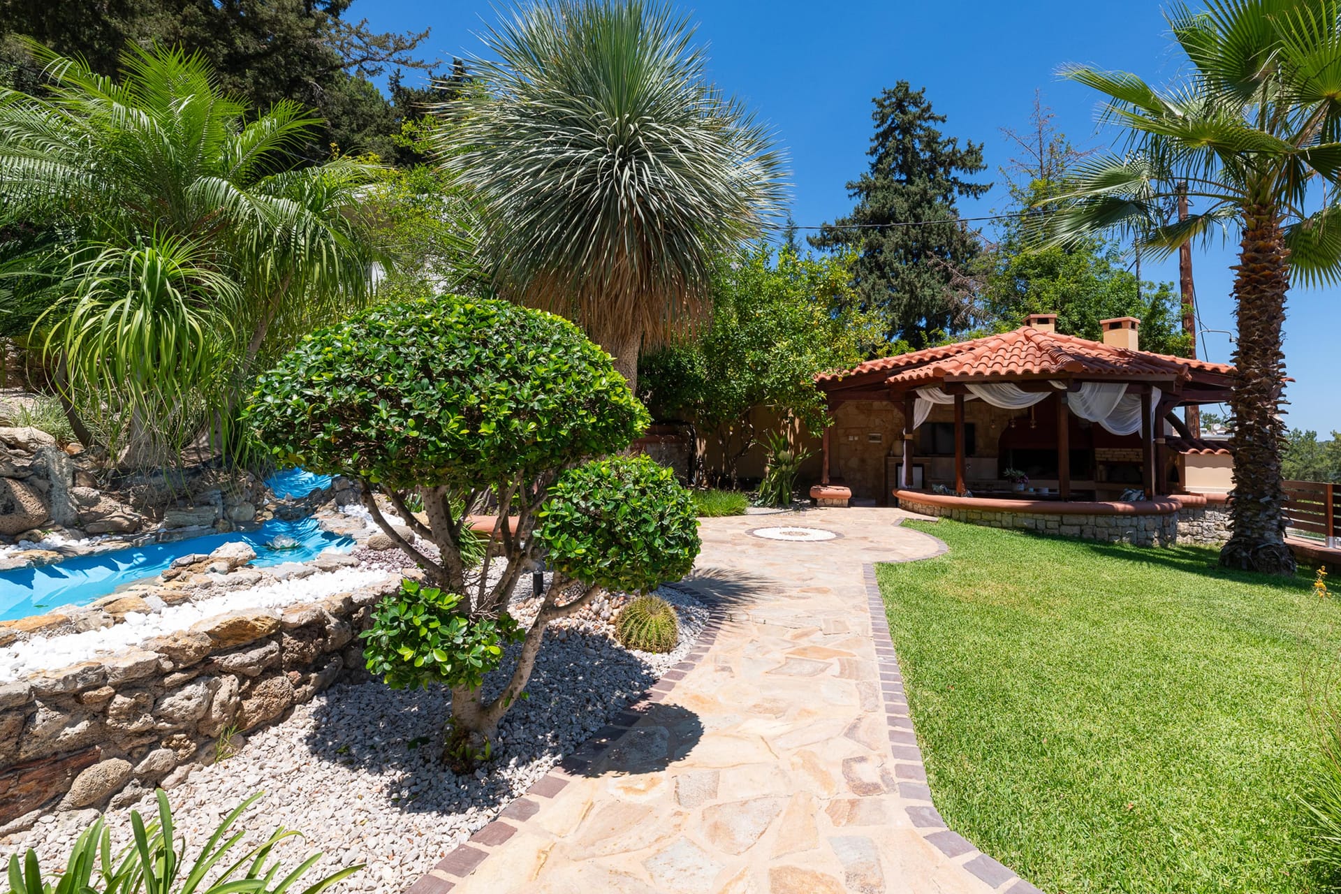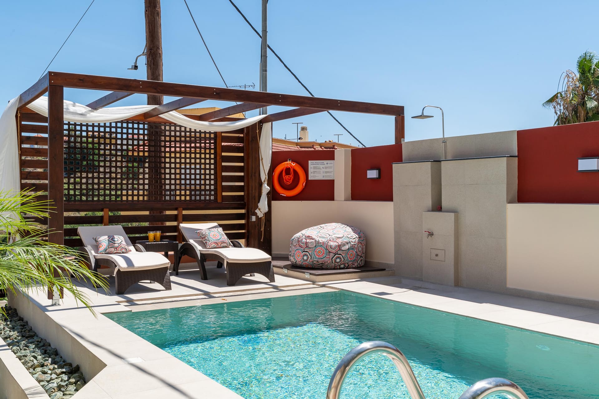 The outdoor area is a true highlight, with a beautiful private swimming pool surrounded by sunbeds. You’ll also find an incredible sitting area and BBQ facilities, perfect for gatherings with friends or family. Amarilia House is ideally located in a stunning natural setting, with lush grass and blooming flowers. The main courtyard provides a peaceful space for complete relaxation, offering a panoramic view of the surroundings.