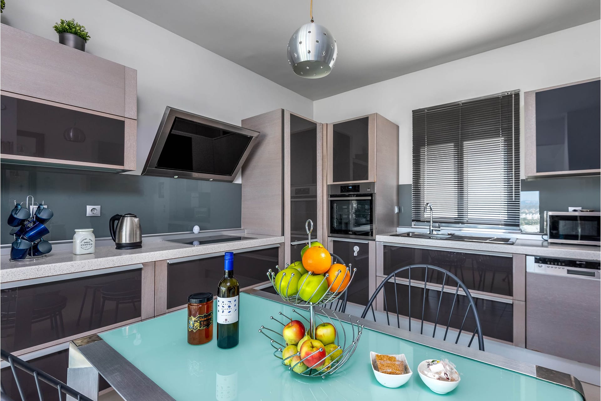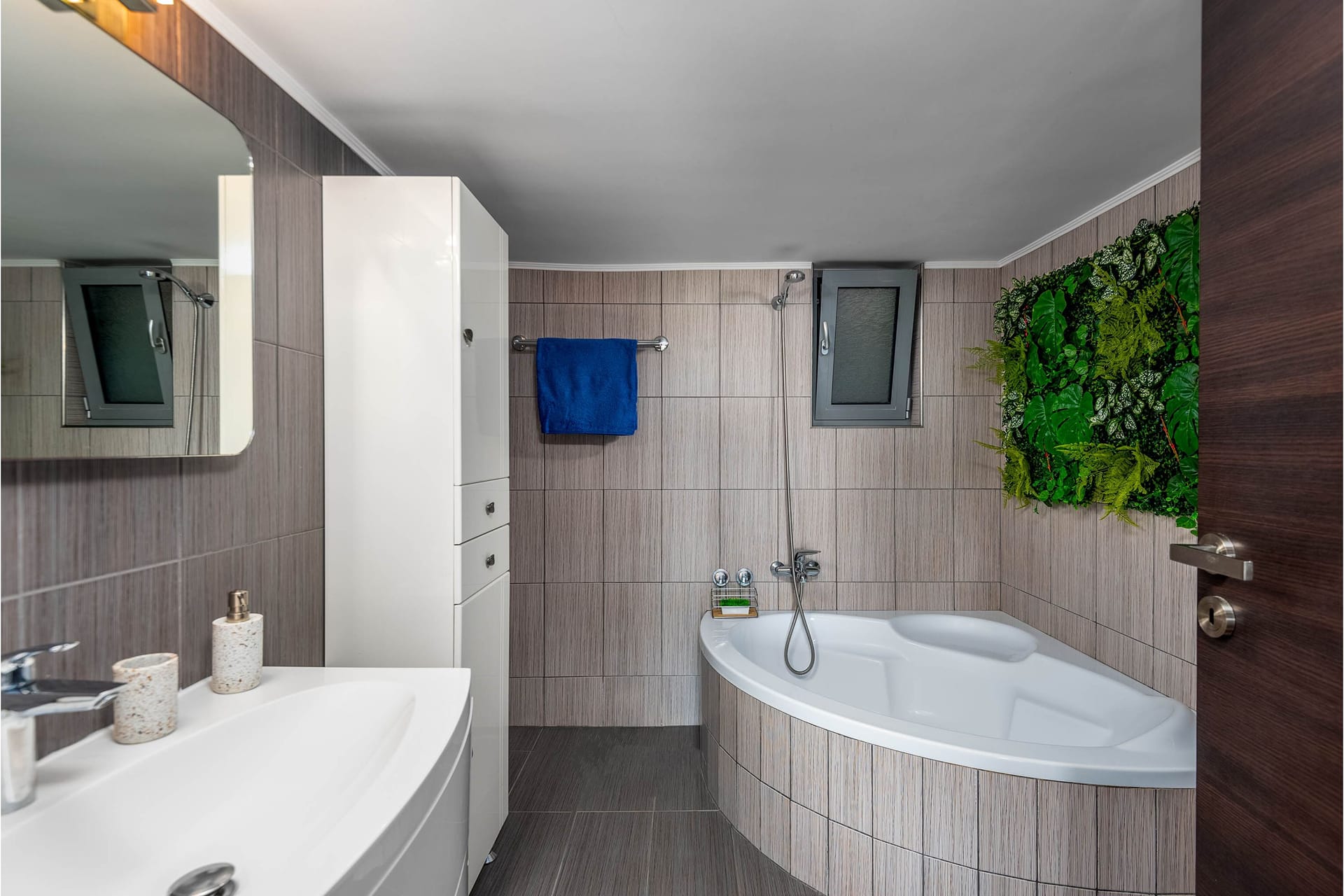 The 4-bedroom villa comprises 3 double-bedded rooms and 1 room with 2 single beds, along with 2 bathrooms featuring both a shower and a bathtub. The ground floor boasts a modern living room and a cozy dining area with inspiring outdoor views. On the top level, you'll find a fully equipped kitchen, additional dining space, and another comfortable living room. The villa is equipped with a flat-screen TV with satellite channels and free Wi-Fi access. Outside, enjoy the private swimming pool with stylish sunbeds to soak up the sun and admire the remarkable view. For those who prefer a tranquil evening, a furnished balcony offers the perfect setting to enjoy fine wine under the starry sky.
