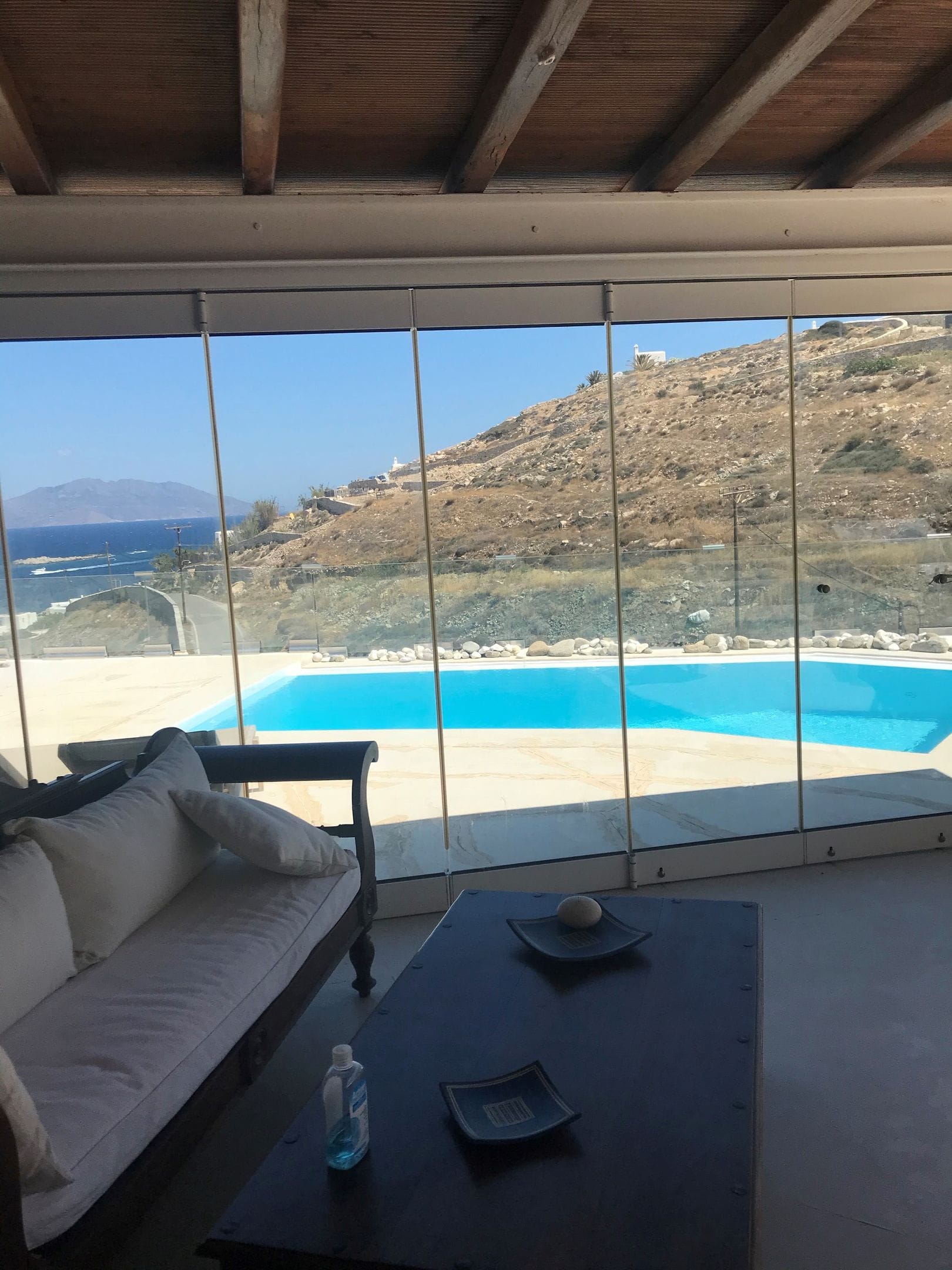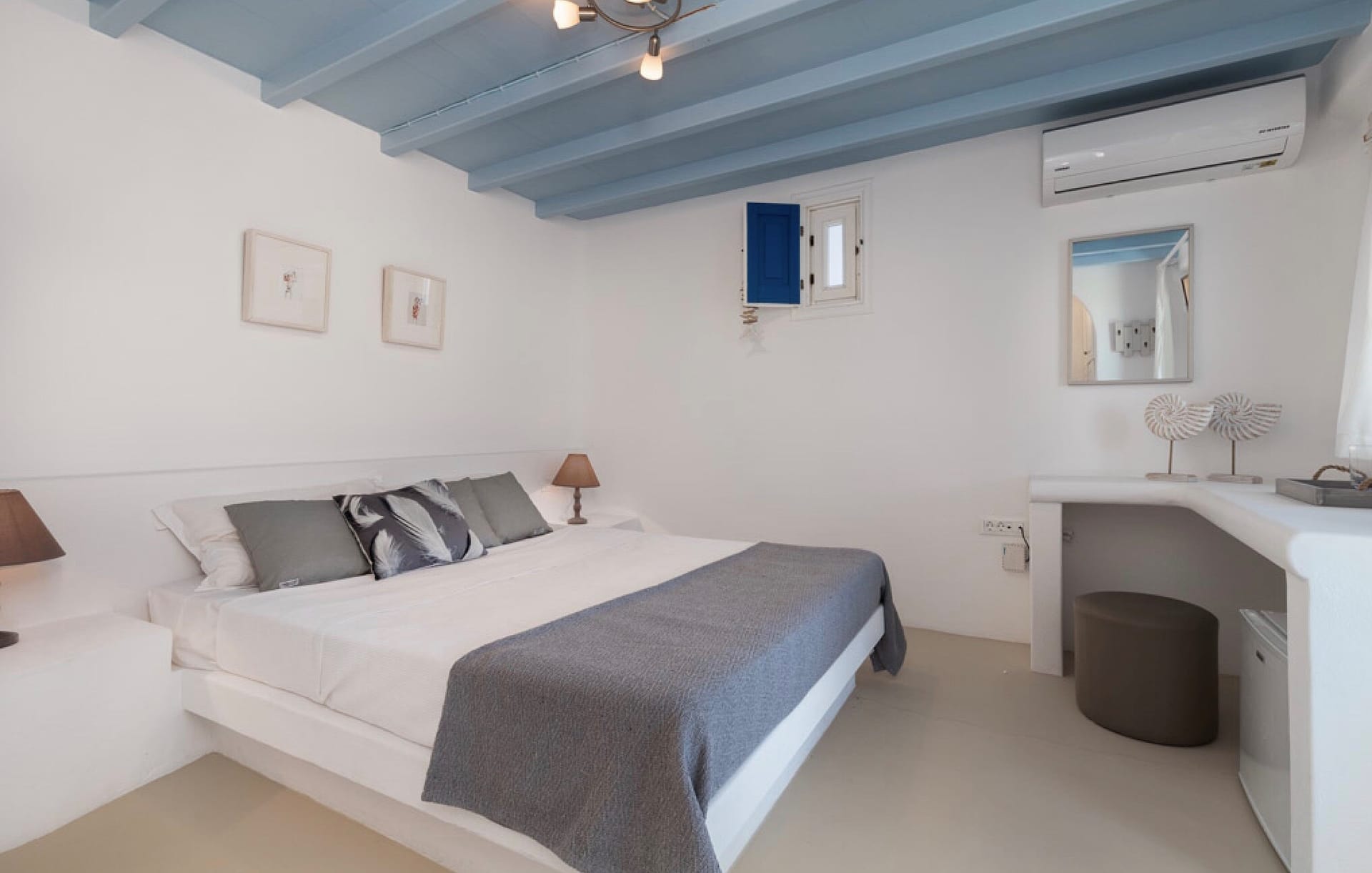 Brillante Villa accommodates up to 7 guests with 3 fully air-conditioned bedrooms, each featuring comfortable double beds and smart TVs. Two of the bedrooms have balconies, providing lovely views. The living room includes a single sofa bed for additional guests. One bedroom features an ensuite luxurious bathroom with a shower.