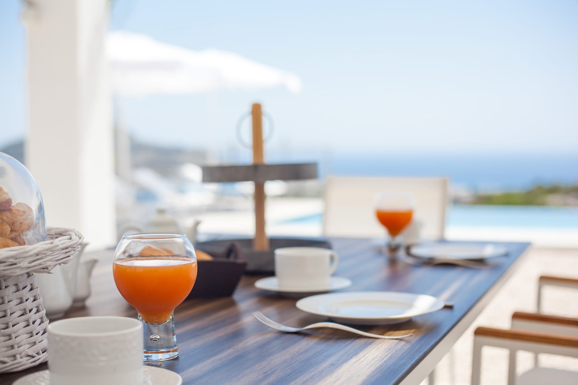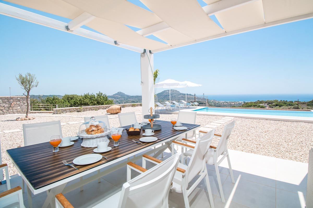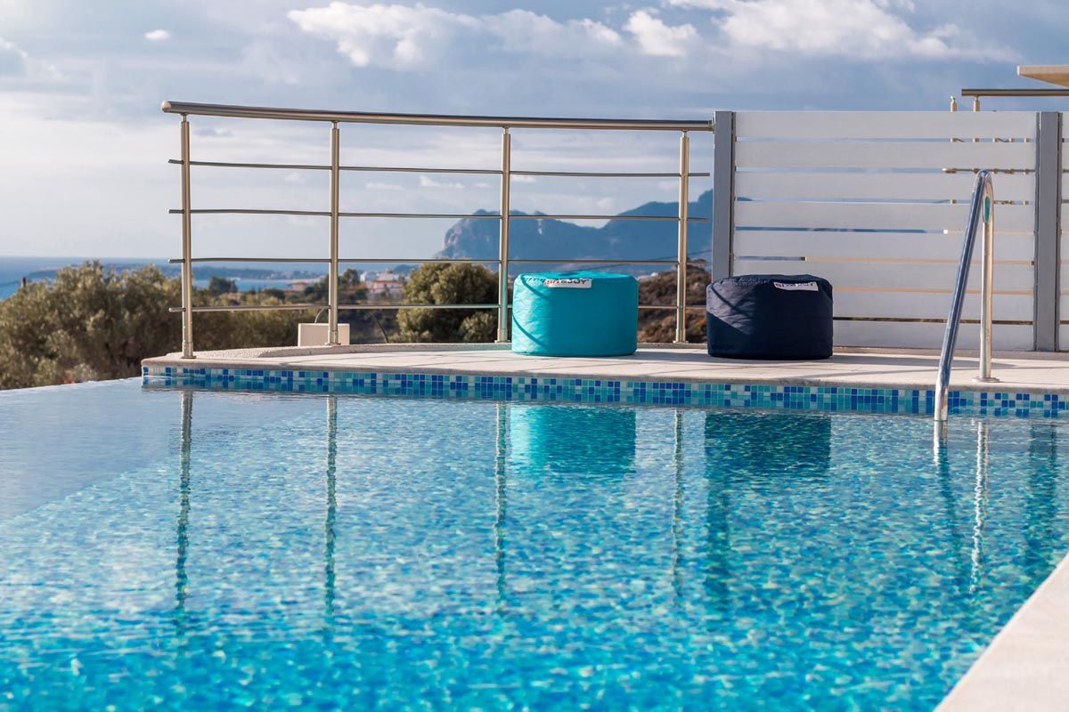 This contemporary villa is designed for comfort and luxury. It boasts a fully equipped kitchen, perfect for any meal preparation, and a spacious open-plan living room furnished with comfortable seating, a flat-screen TV, satellite channels, and a surround sound system for ultimate relaxation. Outside, guests can enjoy a private swimming pool surrounded by sunbeds with breathtaking sea views, and a seating area for gatherings, complete with BBQ facilities ideal for enjoying meals during the golden hours.