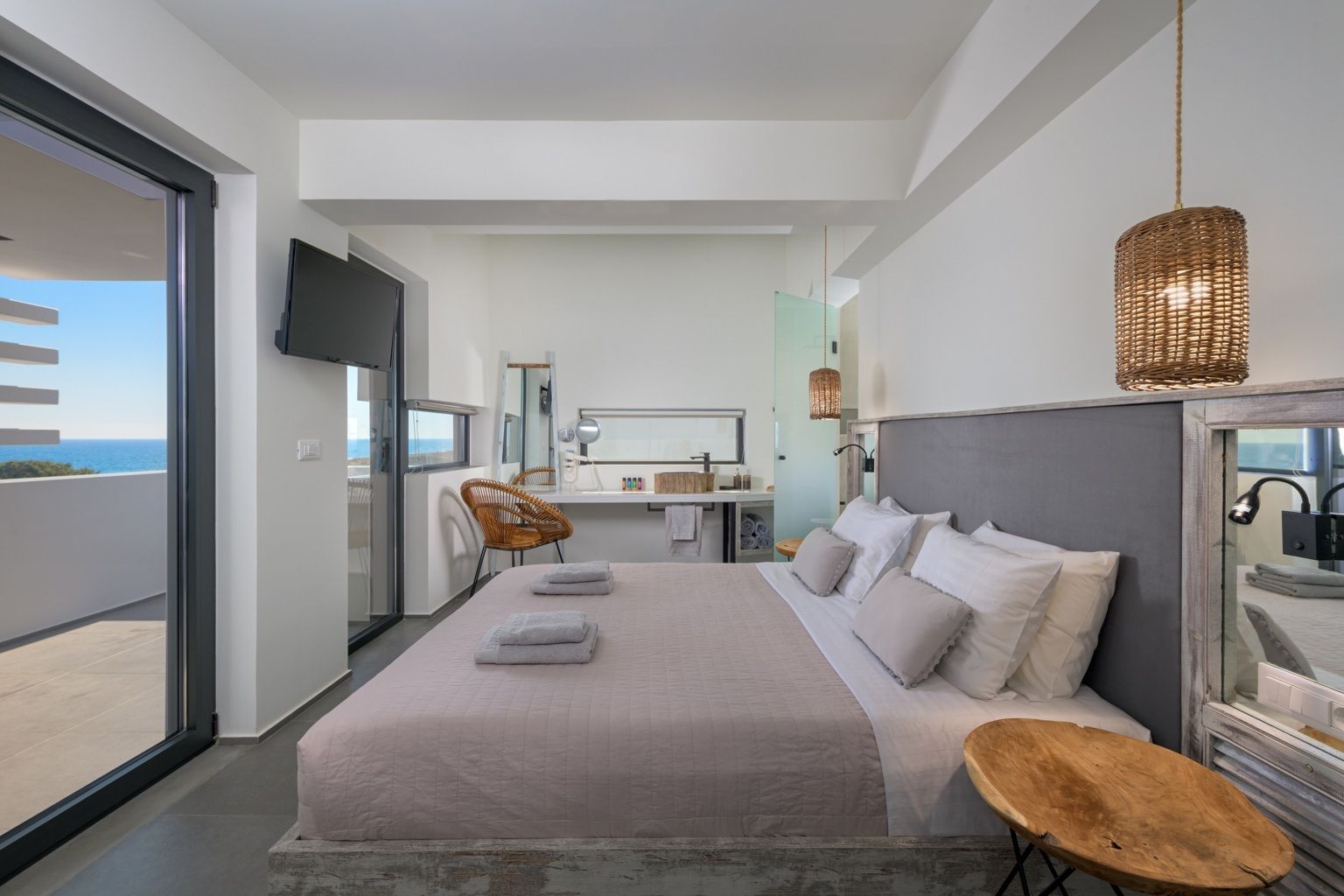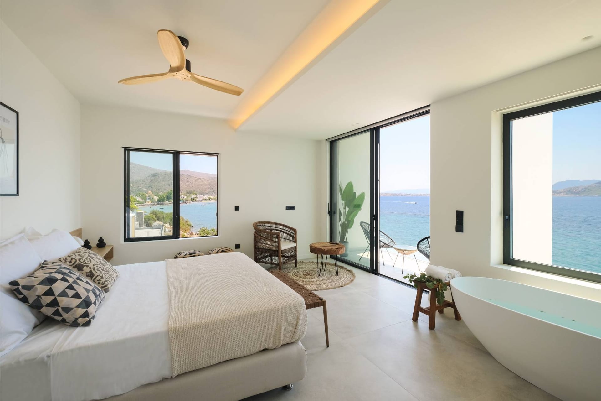 Great Albatross Villa features a magnificent decorating style with elegant Modern Greek details. It offers three fully air-conditioned bedrooms, each with a comfortable double bed, a screen TV, and private balconies boasting mesmerizing views of the sea. All bedrooms are equipped with ensuite bathrooms that feature stylish and contemporary showers.