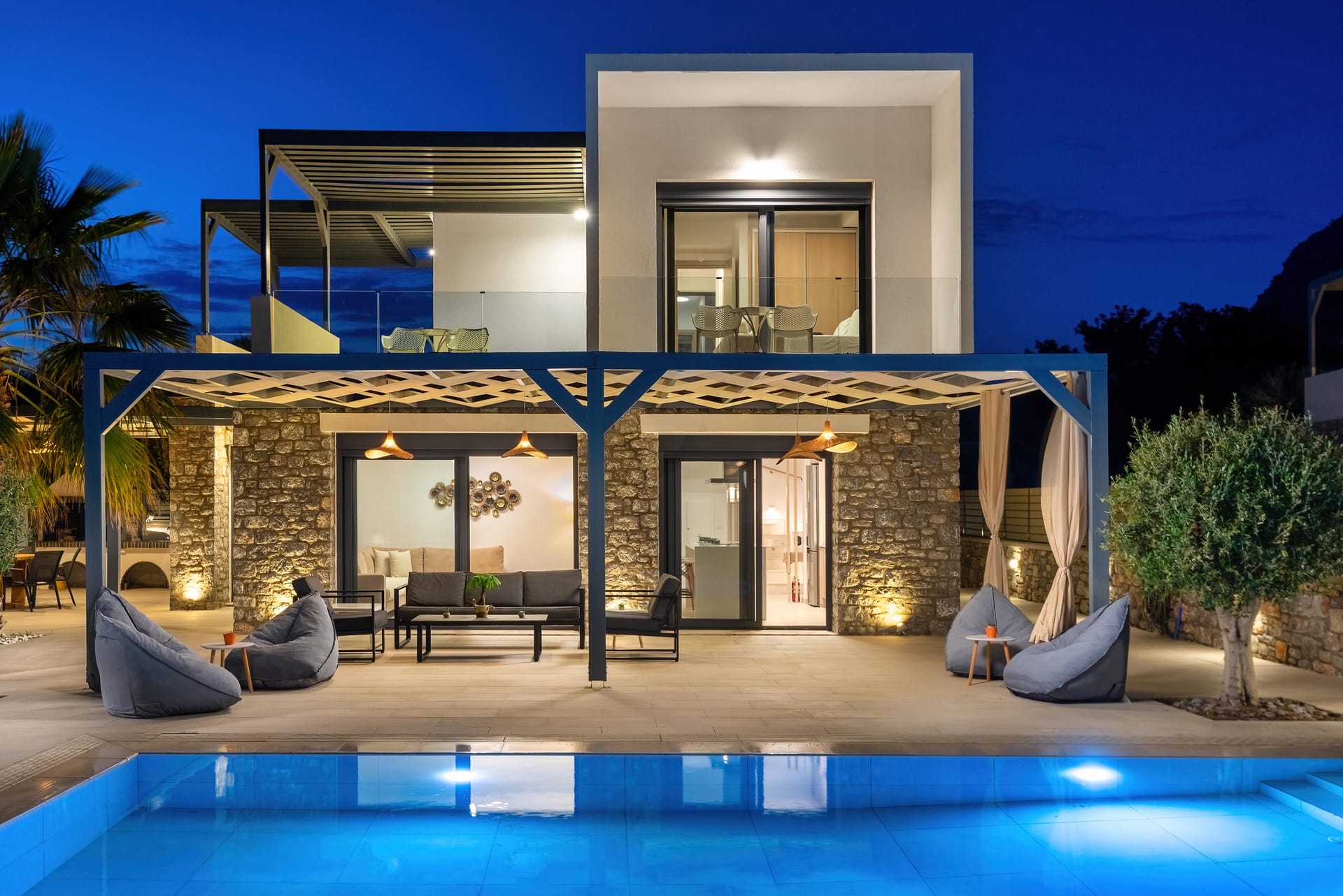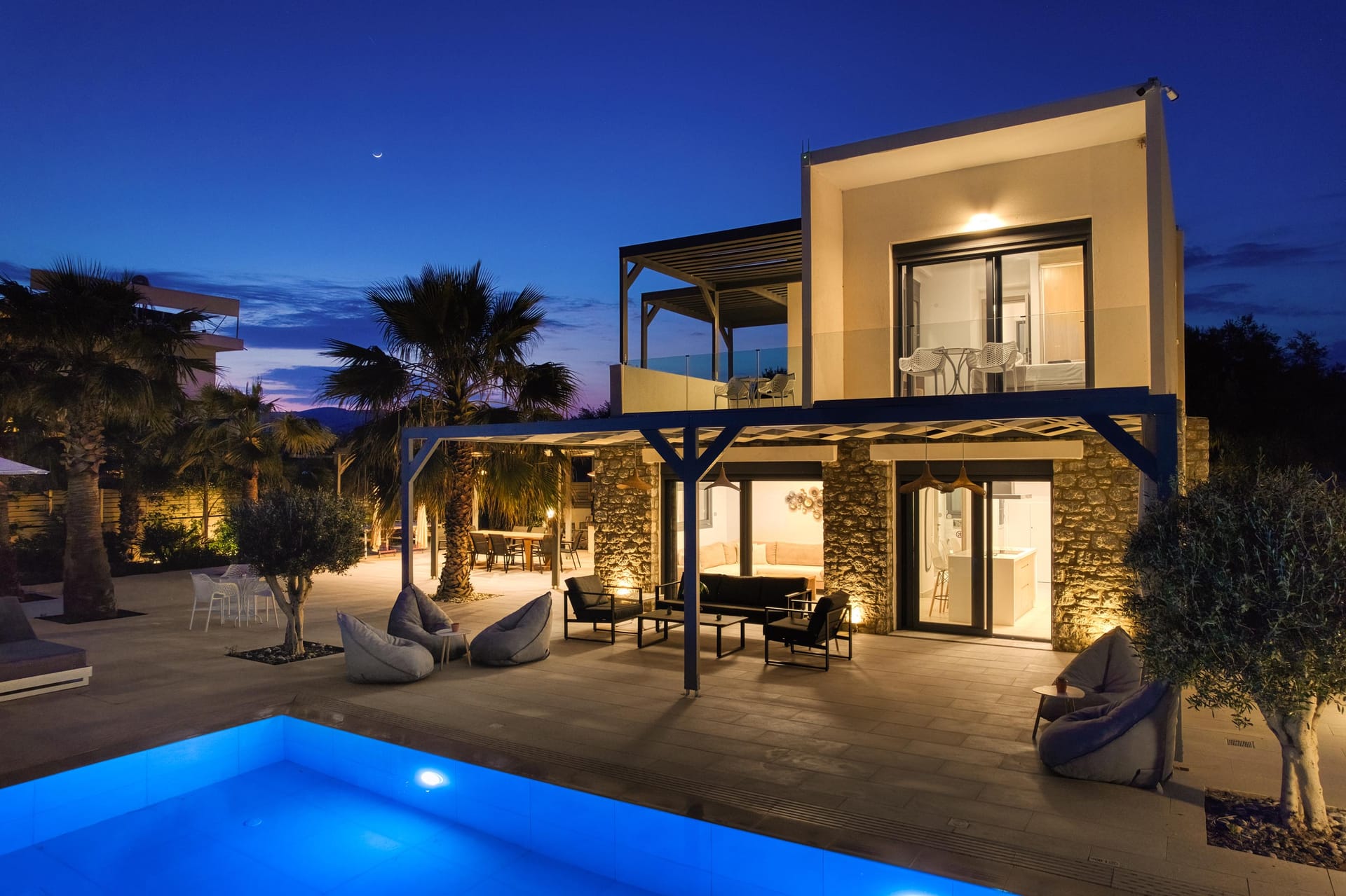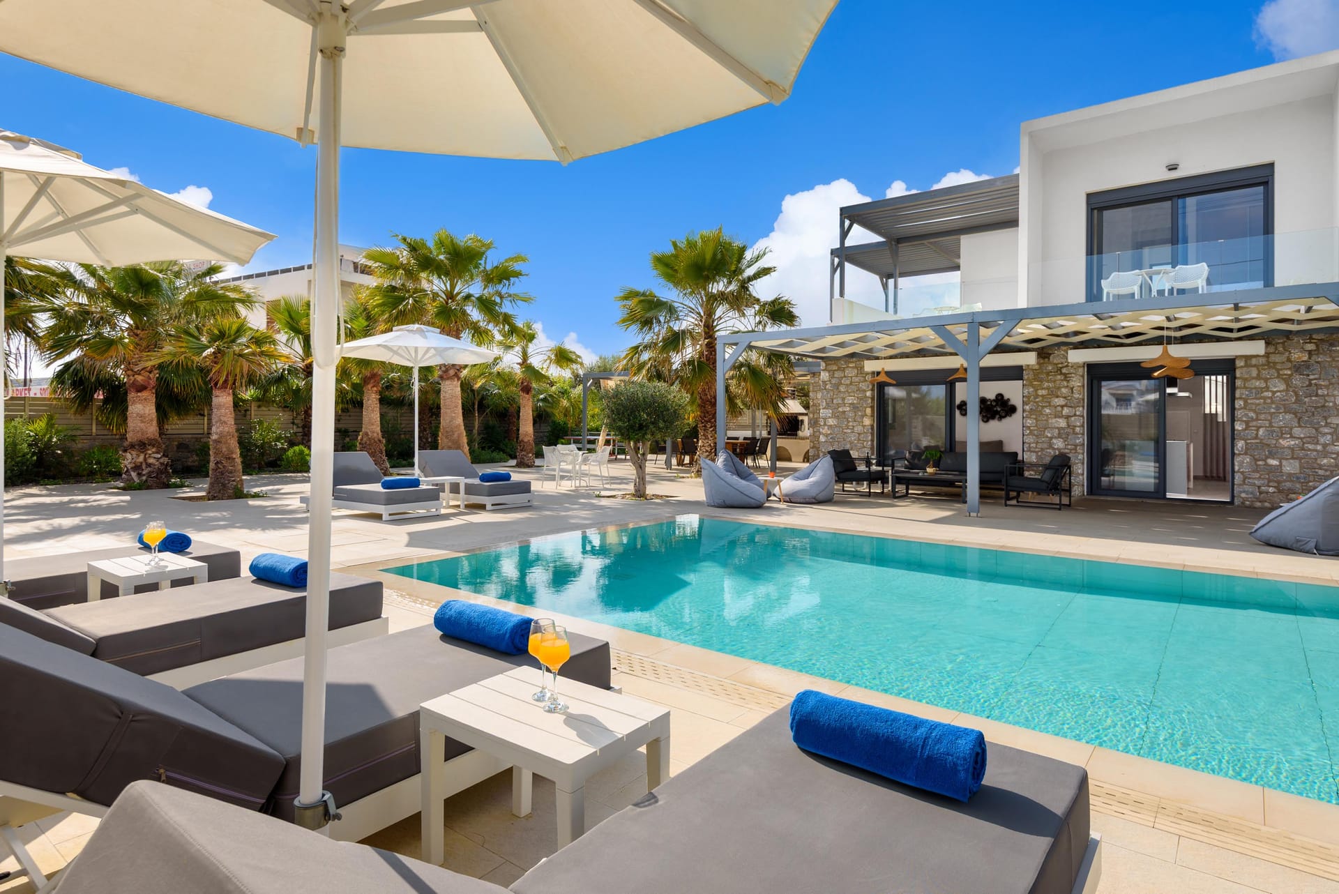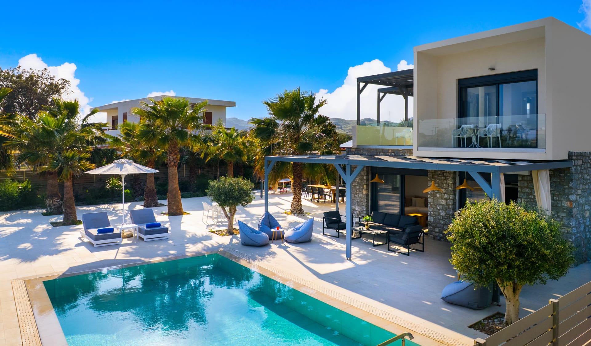 The villas feature an open-plan, fully equipped kitchen designed in a modern style, perfect for any meal preparation. Guests will enjoy a cozy living room and a seating area where they can dine. The sofa easily converts into a comfy single sofa bed to accommodate an additional guest. Free Wi-Fi is available throughout the property. Outdoors, you’ll find a stunning private swimming pool with jets and sunbeds, surrounded by beautiful palm trees and stone-built décor. There is also a furnished area and BBQ facilities for delightful meals with loved ones. The villa includes an electric car charger and adopts eco-friendly practices with solar panels.