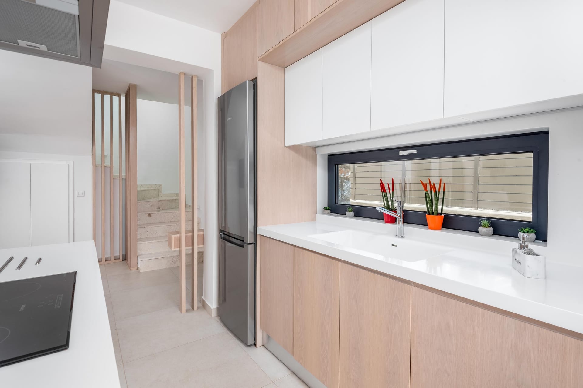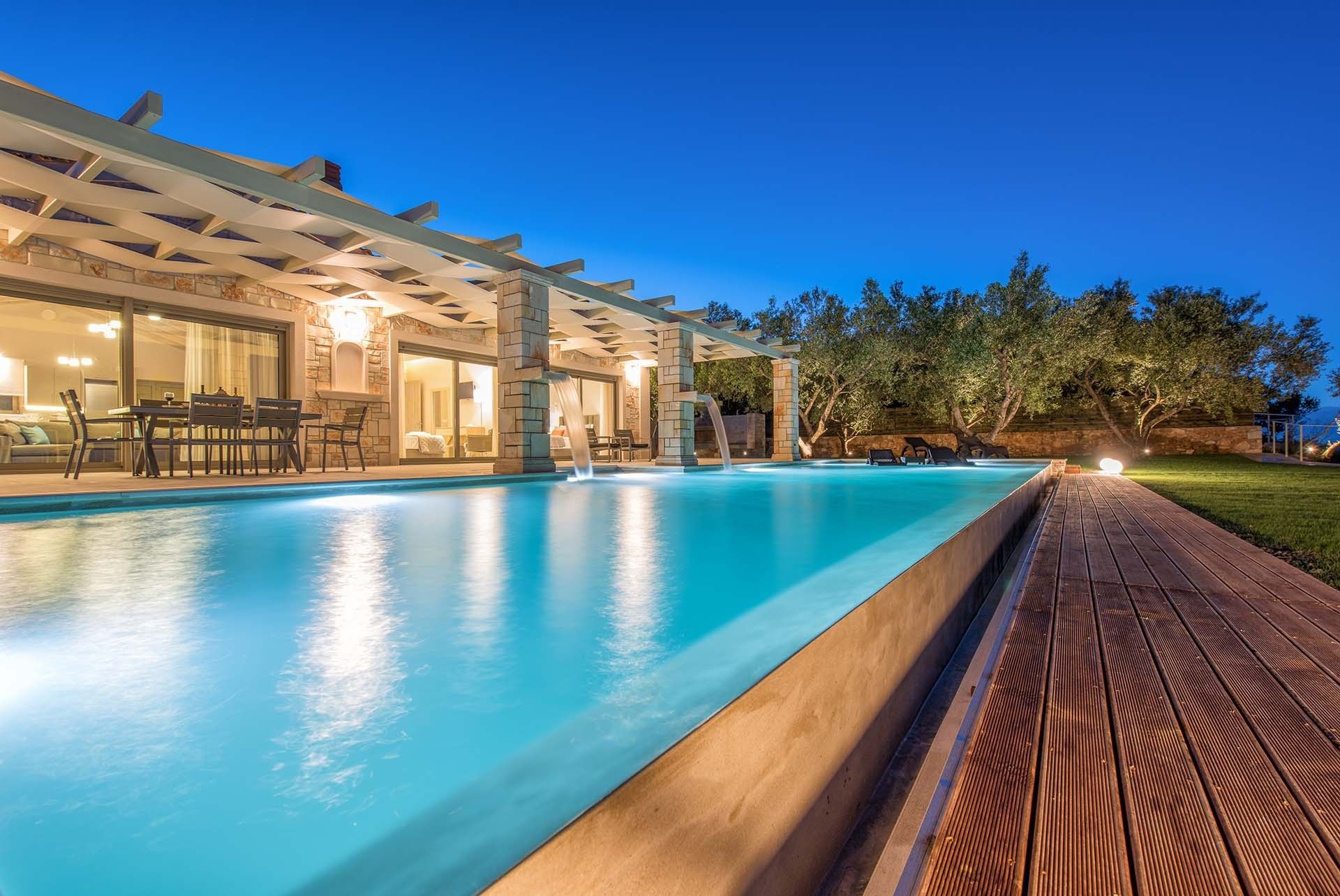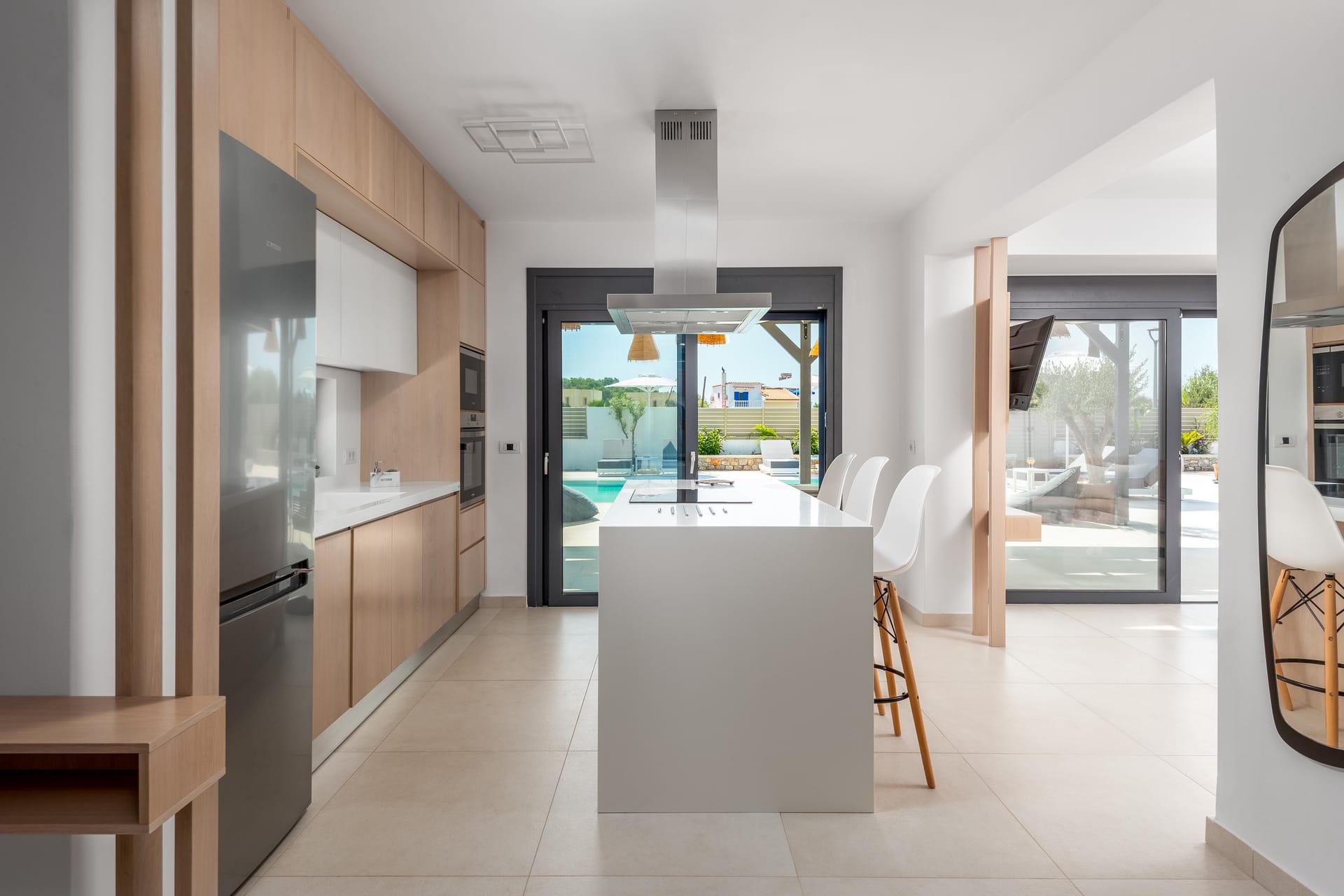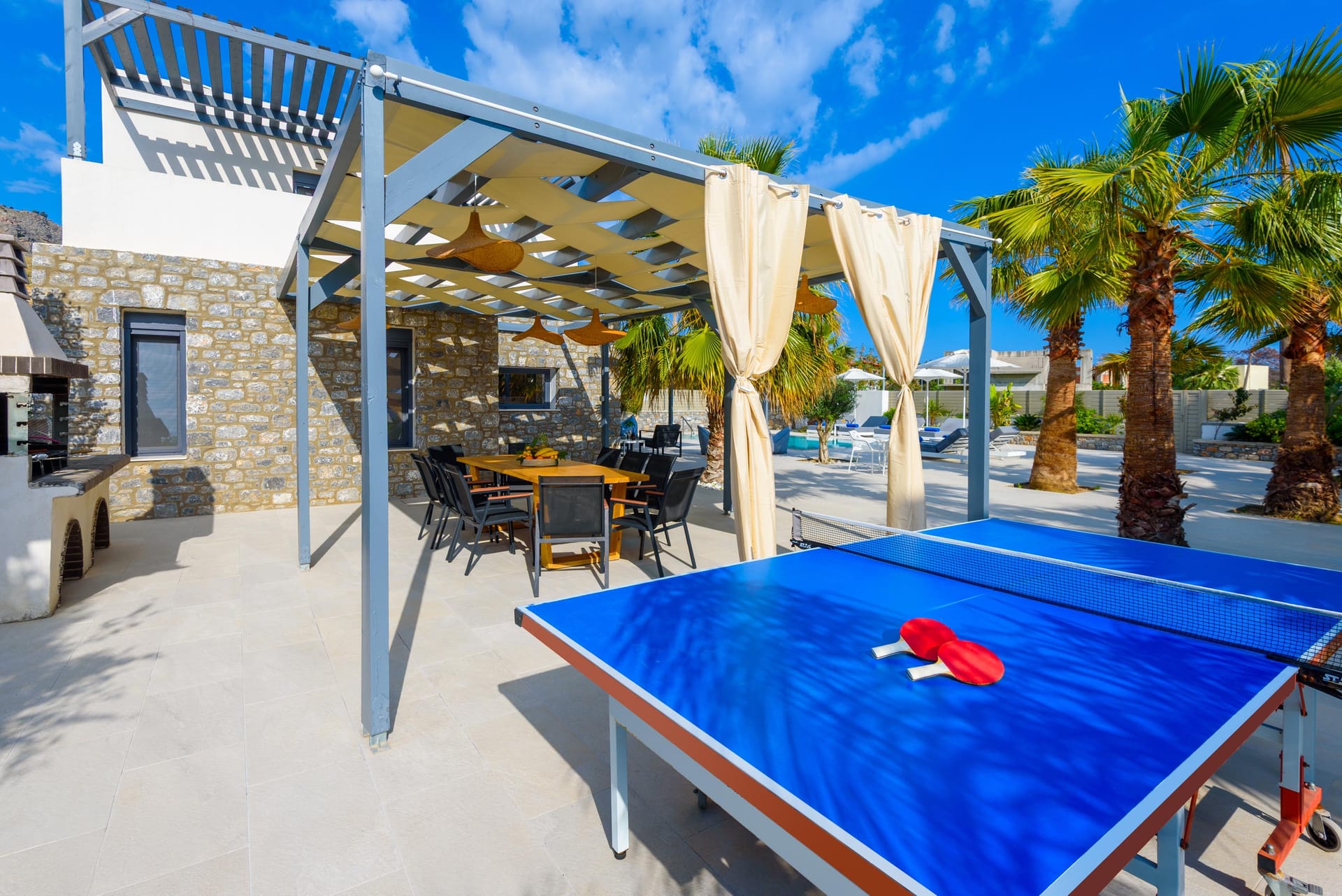 The villas feature an open-plan, fully equipped kitchen designed in a modern style, perfect for any meal preparation. Guests will enjoy a cozy living room and a seating area where they can dine. The sofa easily converts into a comfy single sofa bed to accommodate an additional guest. Free Wi-Fi is available throughout the property. Outdoors, you’ll find a stunning private swimming pool with jets and sunbeds, surrounded by beautiful palm trees and stone-built décor. There is also a furnished area and BBQ facilities for delightful meals with loved ones. The villa includes an electric car charger and adopts eco-friendly practices with solar panels.