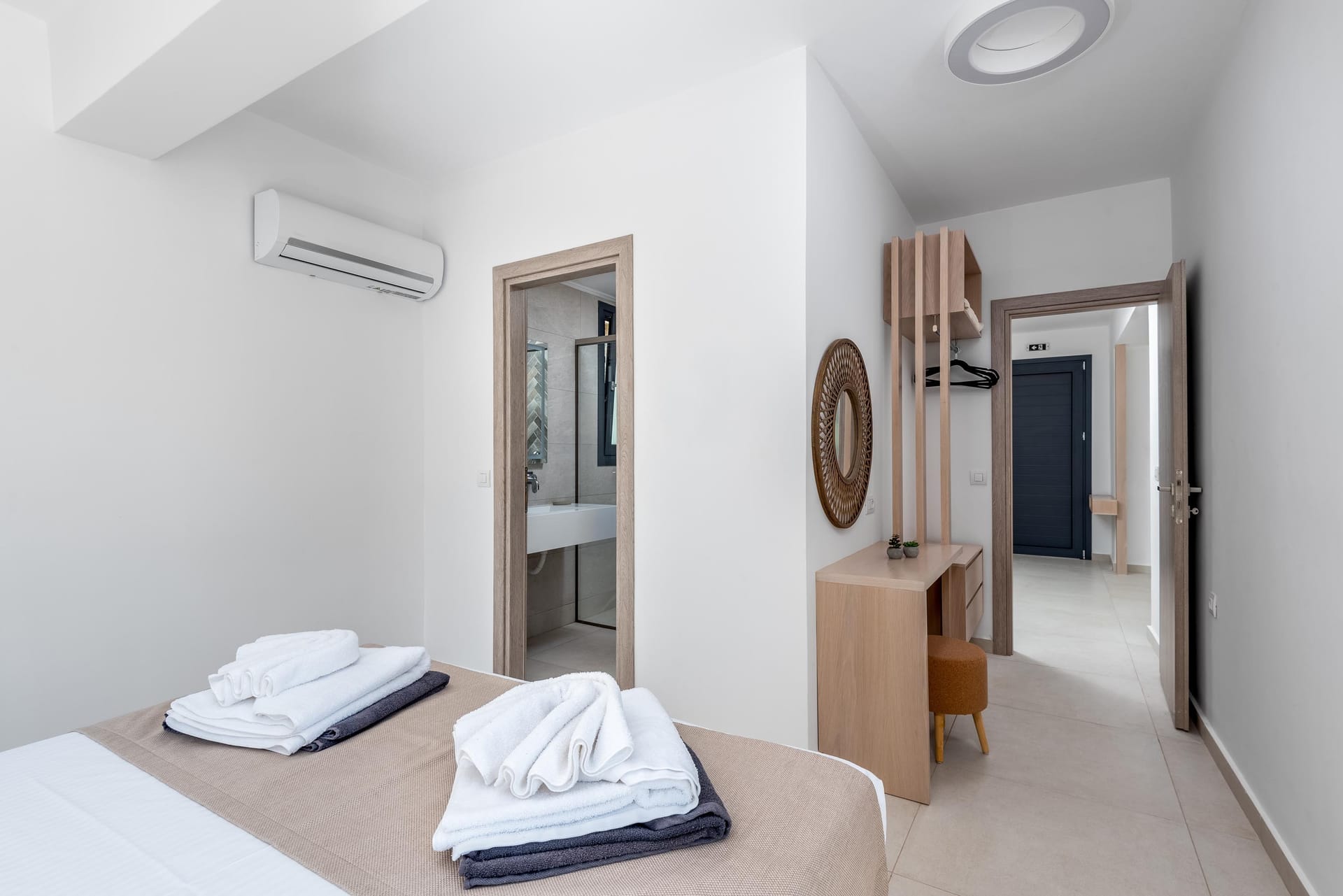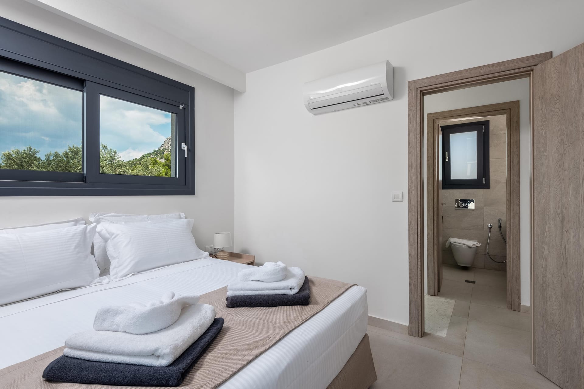 Lindian Palms Villas consist of two private green villas, Apollo and Artemi, each accommodating up to 7 guests. Artemi Villa offers 3 fantastic bedrooms, each fully air-conditioned and featuring a balcony or terrace. Two of the bedrooms have double beds, and the third one has a double bed as well. The ground floor bedroom includes an ensuite bathroom with a shower, while there is another bathroom with a shower and a WC.