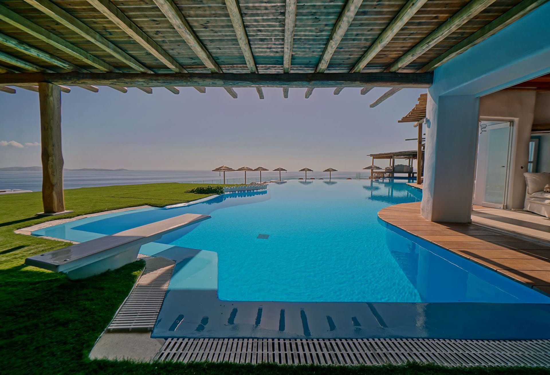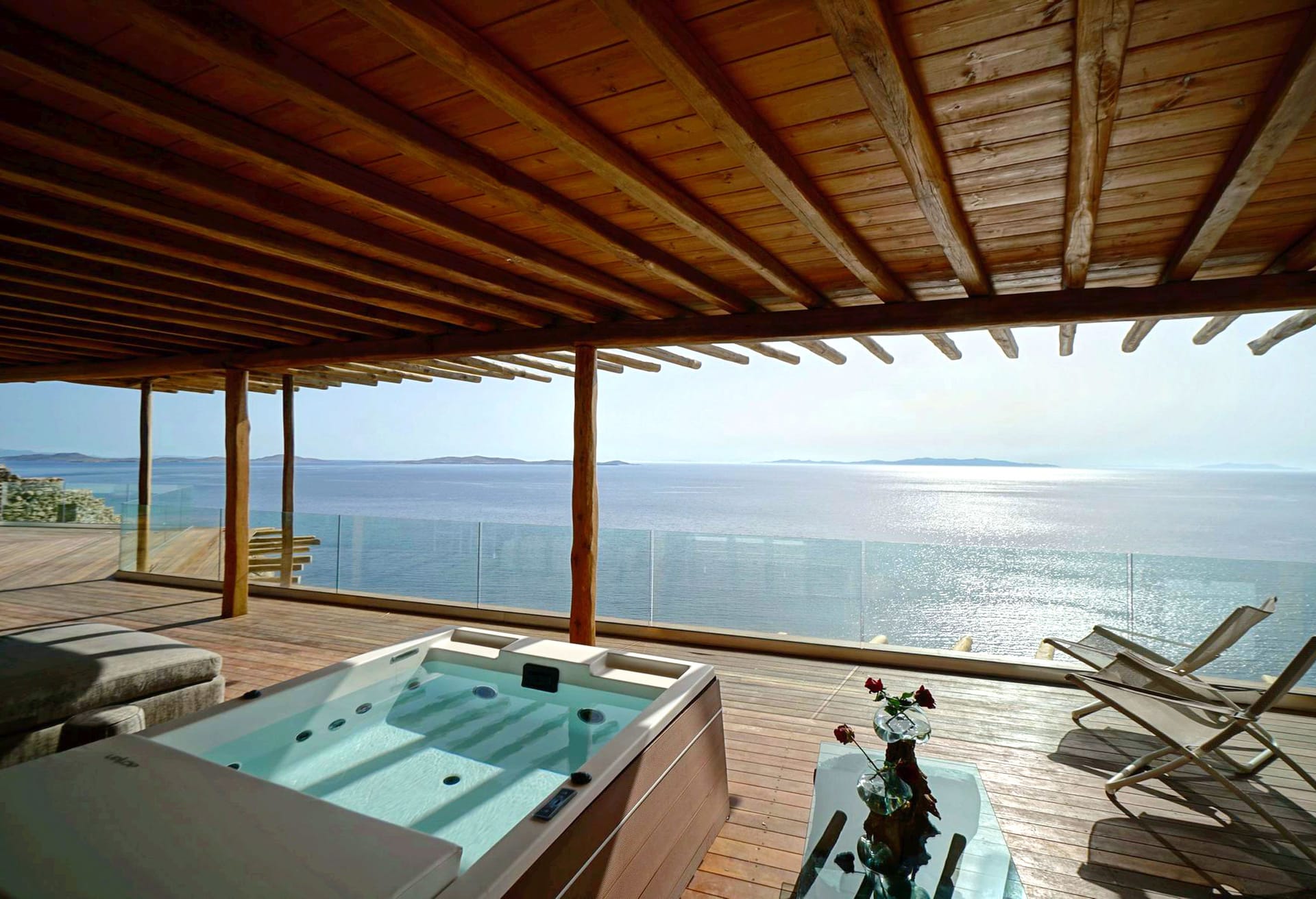 Outdoors, you’ll find a private pool & private heated jacuzzi surrounded by sunbeds, offering an outstanding view of the deep blue Aegean. The spacious terrace includes outdoor furniture, as well as an outdoor kitchen with a BBQ, perfect for enjoying al fresco dining against the backdrop of breathtaking sunsets.