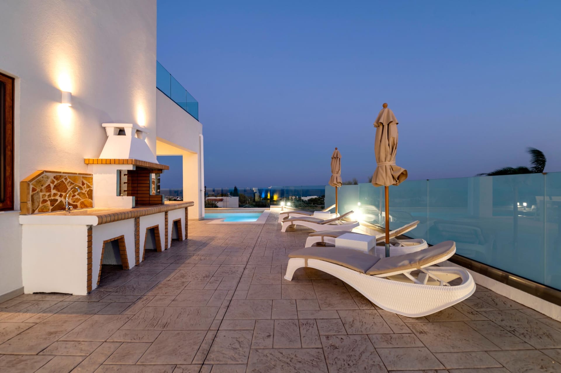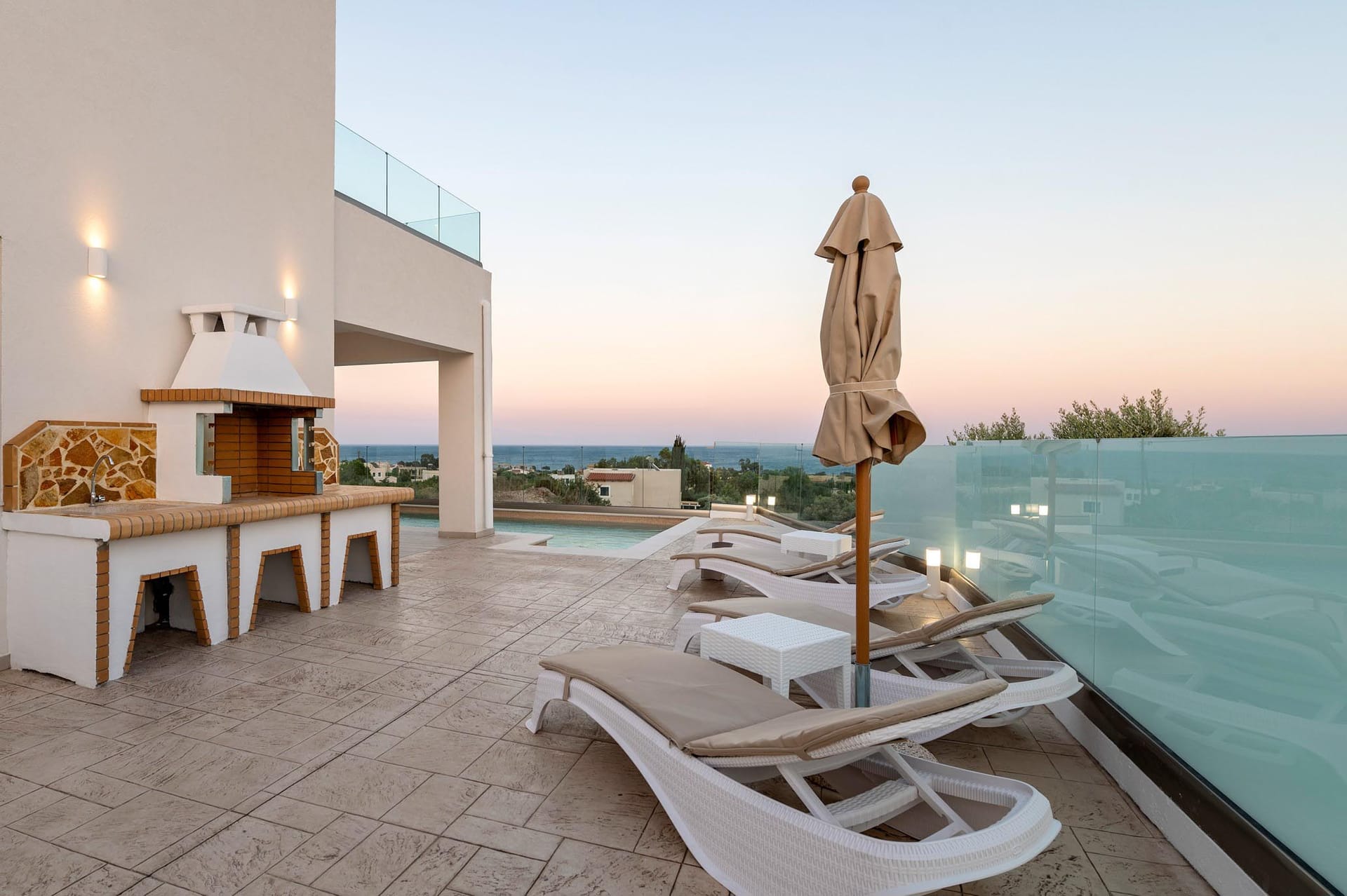 Outdoors, there’s the wonderful private swimming pool with stylish sunbeds. Be ready to feel the ultimate relaxation while gazing at the exquisite panoramic view of the beach. There are BBQ facilities with a sitting area allowing you to enjoy a gathering with your loved ones.