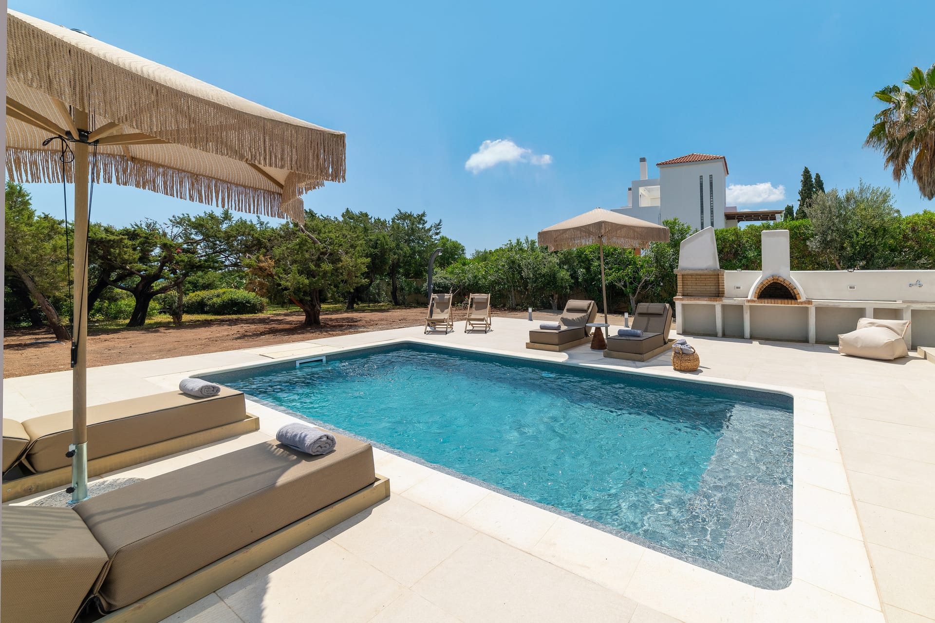 Outside, you’ll find direct access to a quiet beach, a private swimming pool, and lovely gardens. There’s also a stone oven, barbecue area, and outdoor dining spaces where you can enjoy meals with a view. The villa includes fast Wi-Fi, smart technology, and a flat-screen TV for your entertainment. Whether you want to relax by the sea or explore Rhodes, Villa Paradiso is the perfect place for a special getaway.
