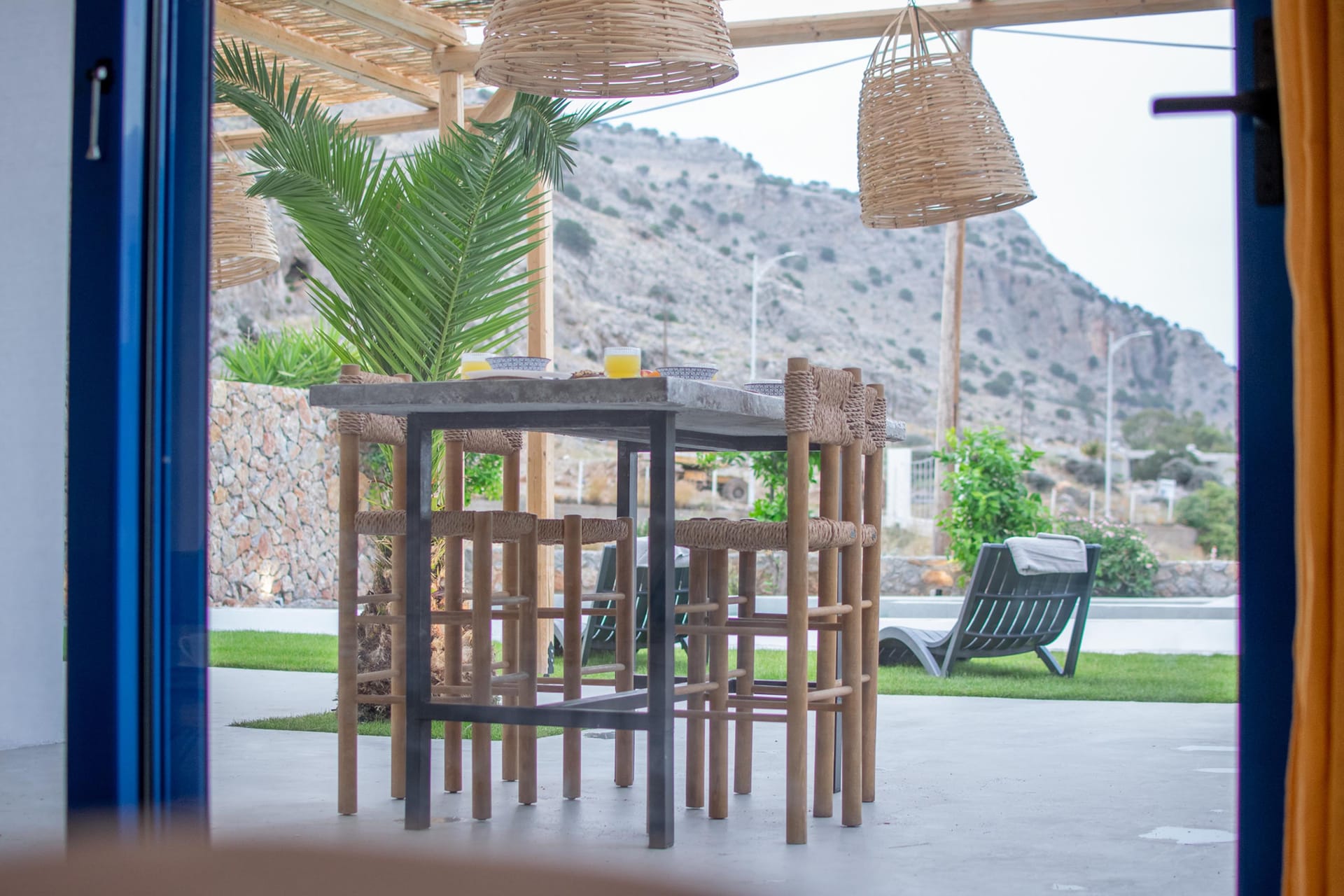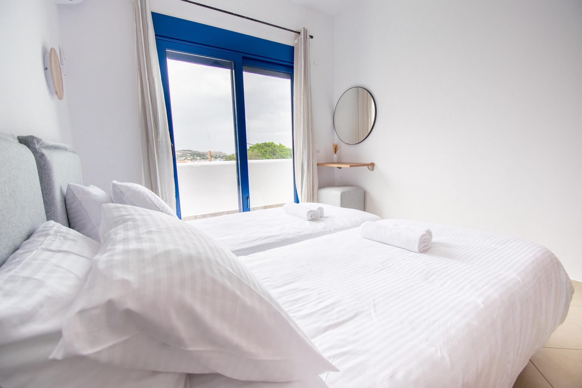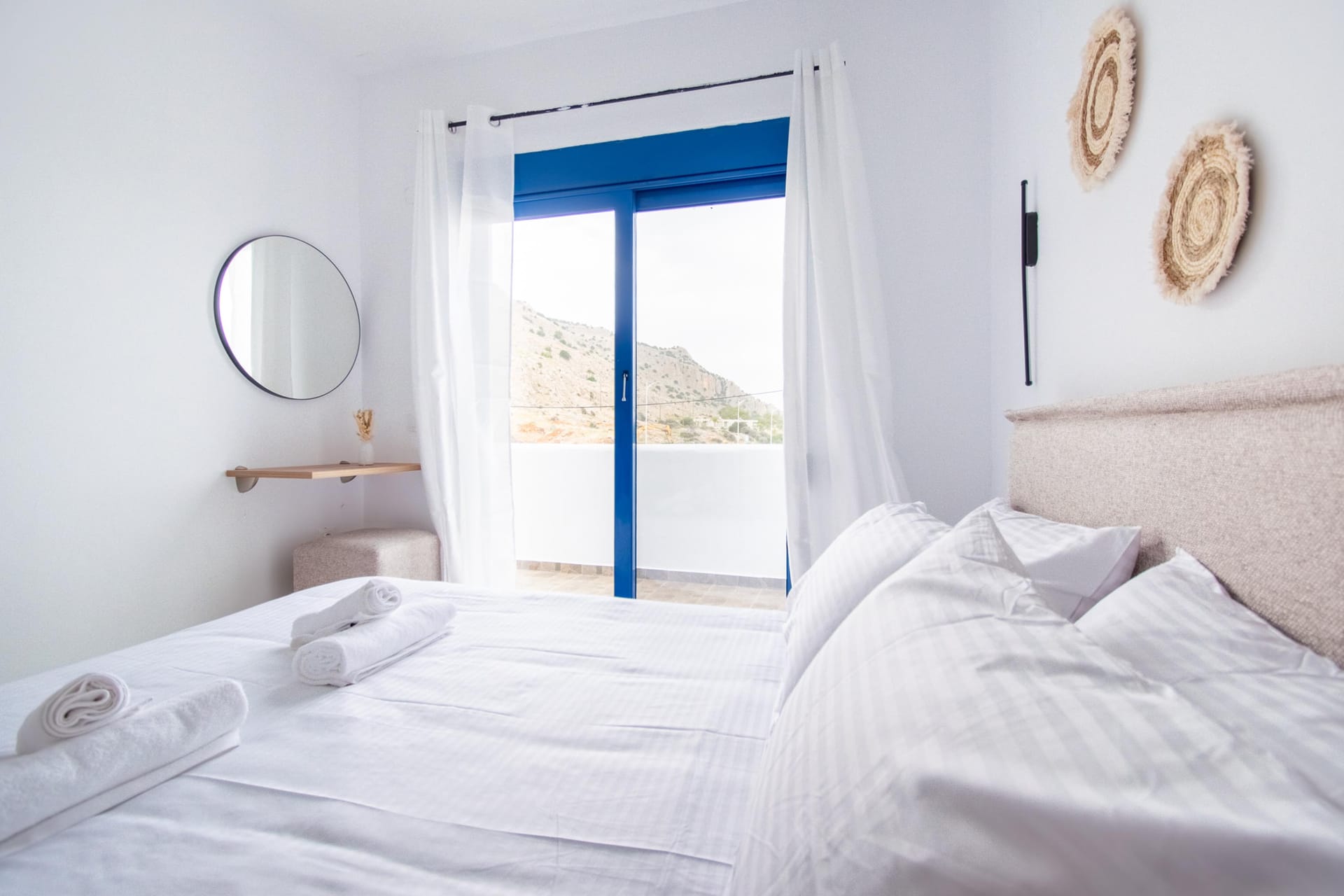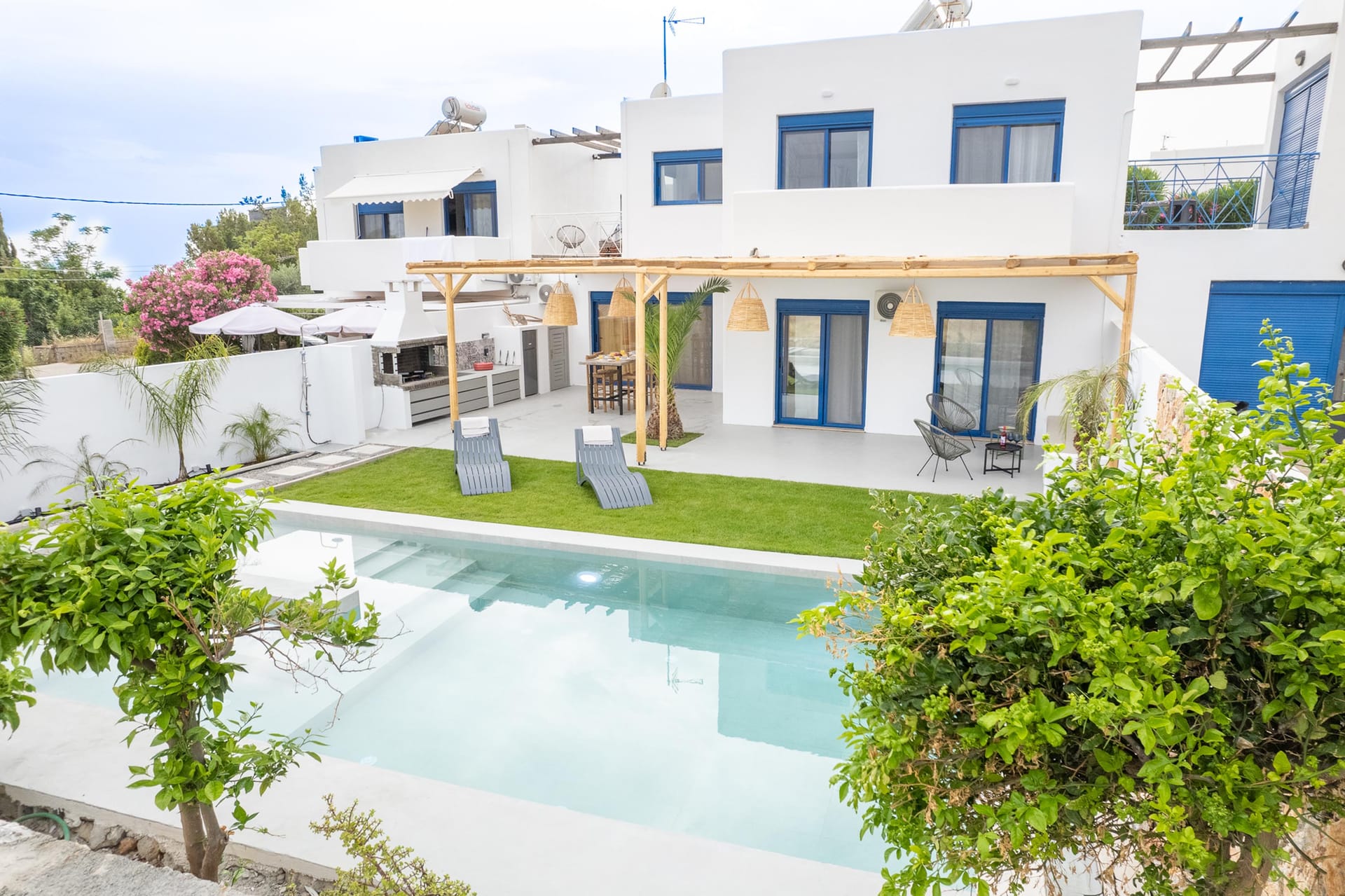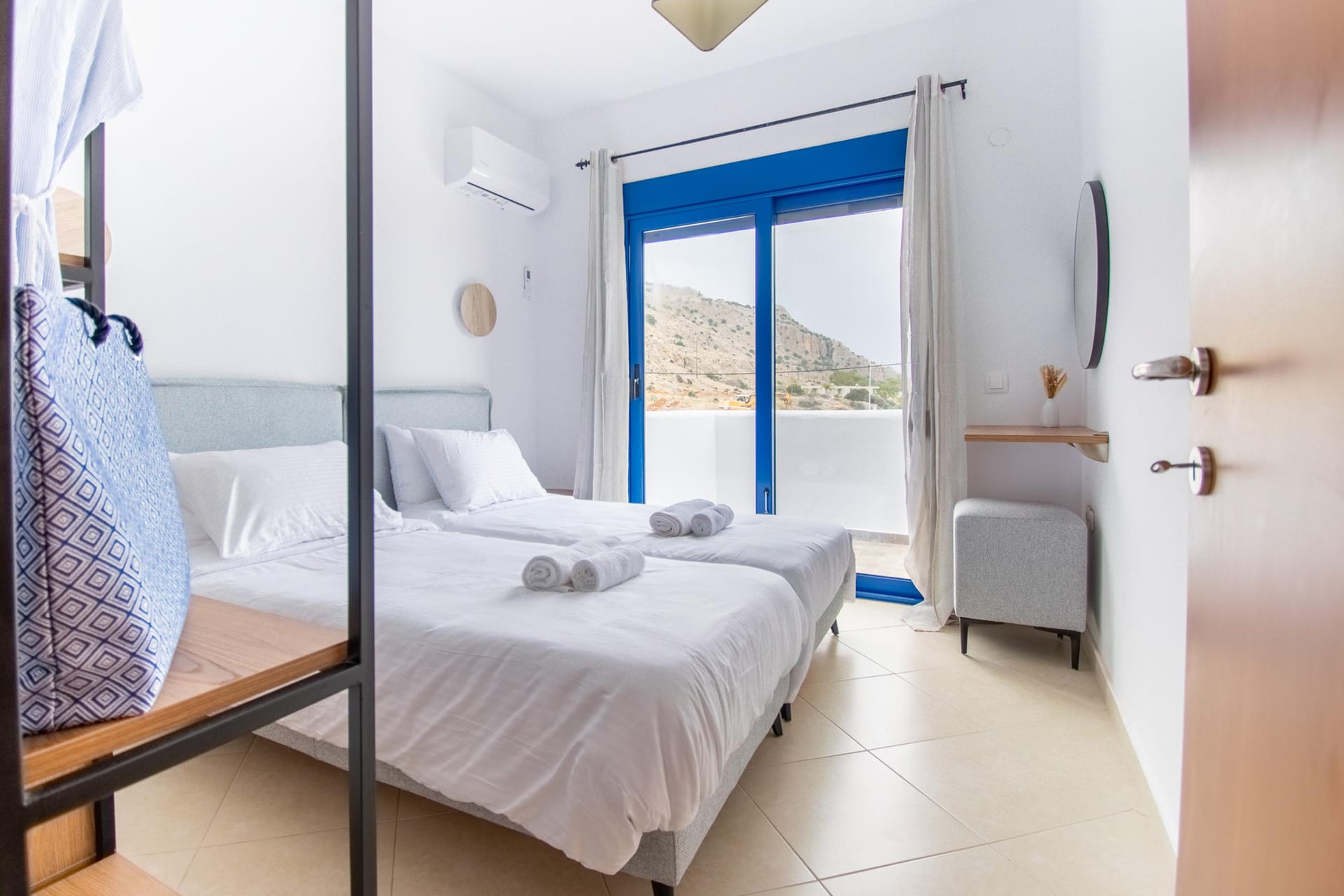 The villa has 3 lovely bedrooms. One bedroom has a double bed and a view of the road. The second bedroom also has a double bed, with a nice view of the hills. The third bedroom has two single beds, perfect for kids or friends. All rooms are bright and welcoming.