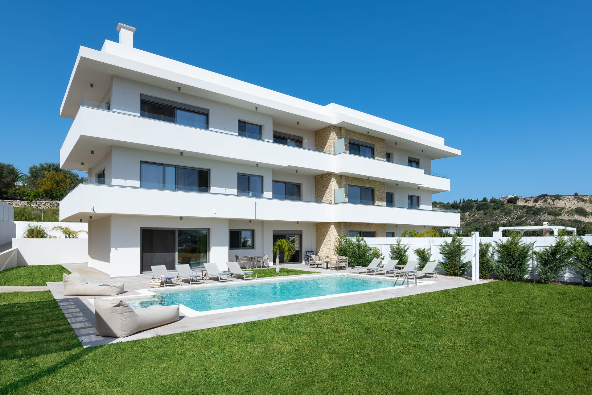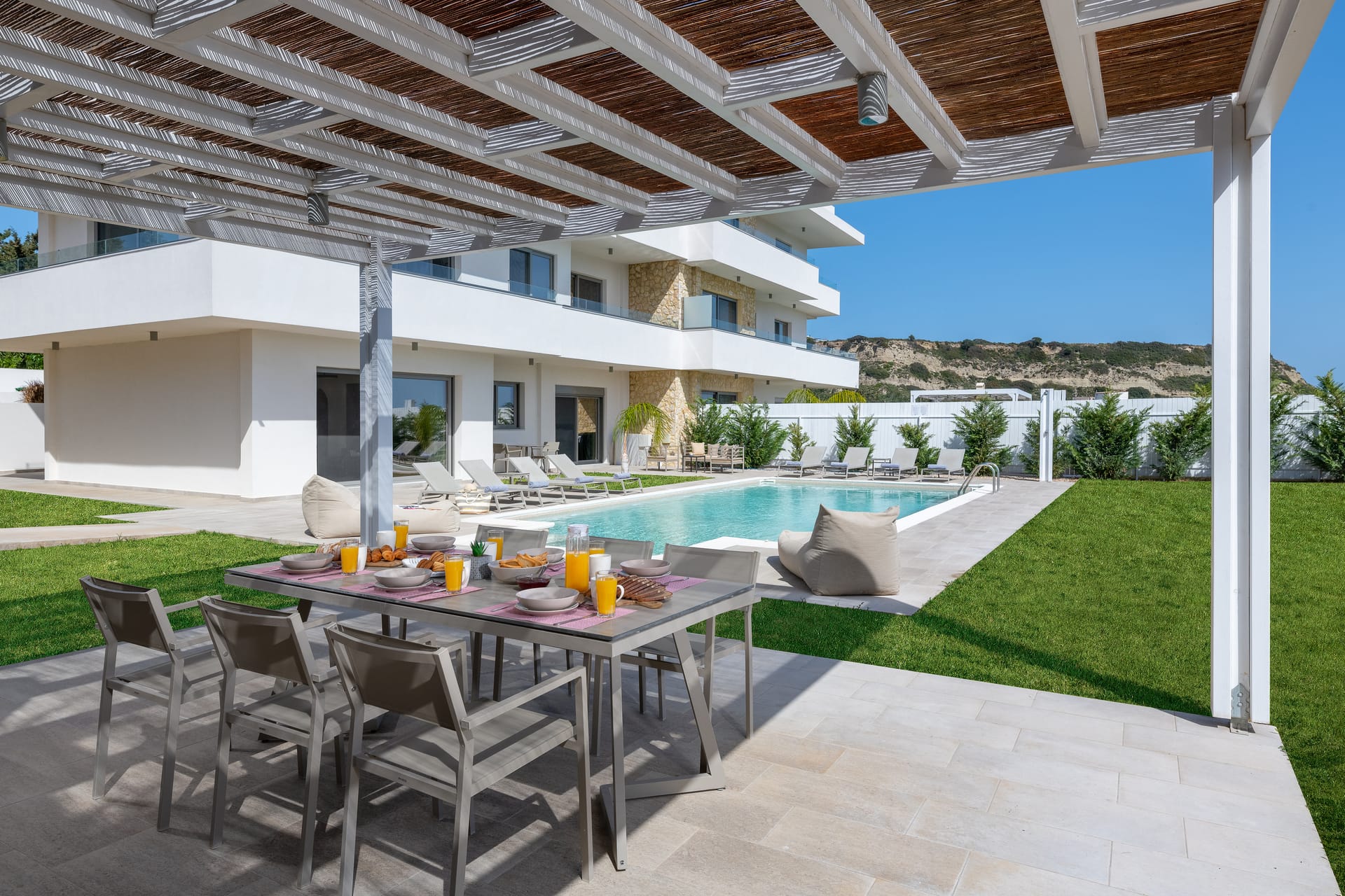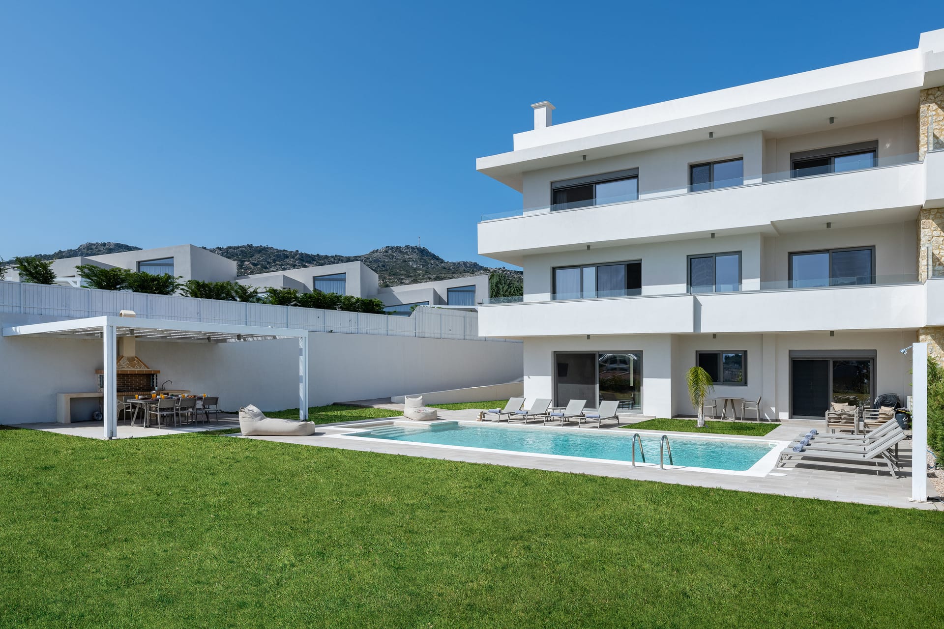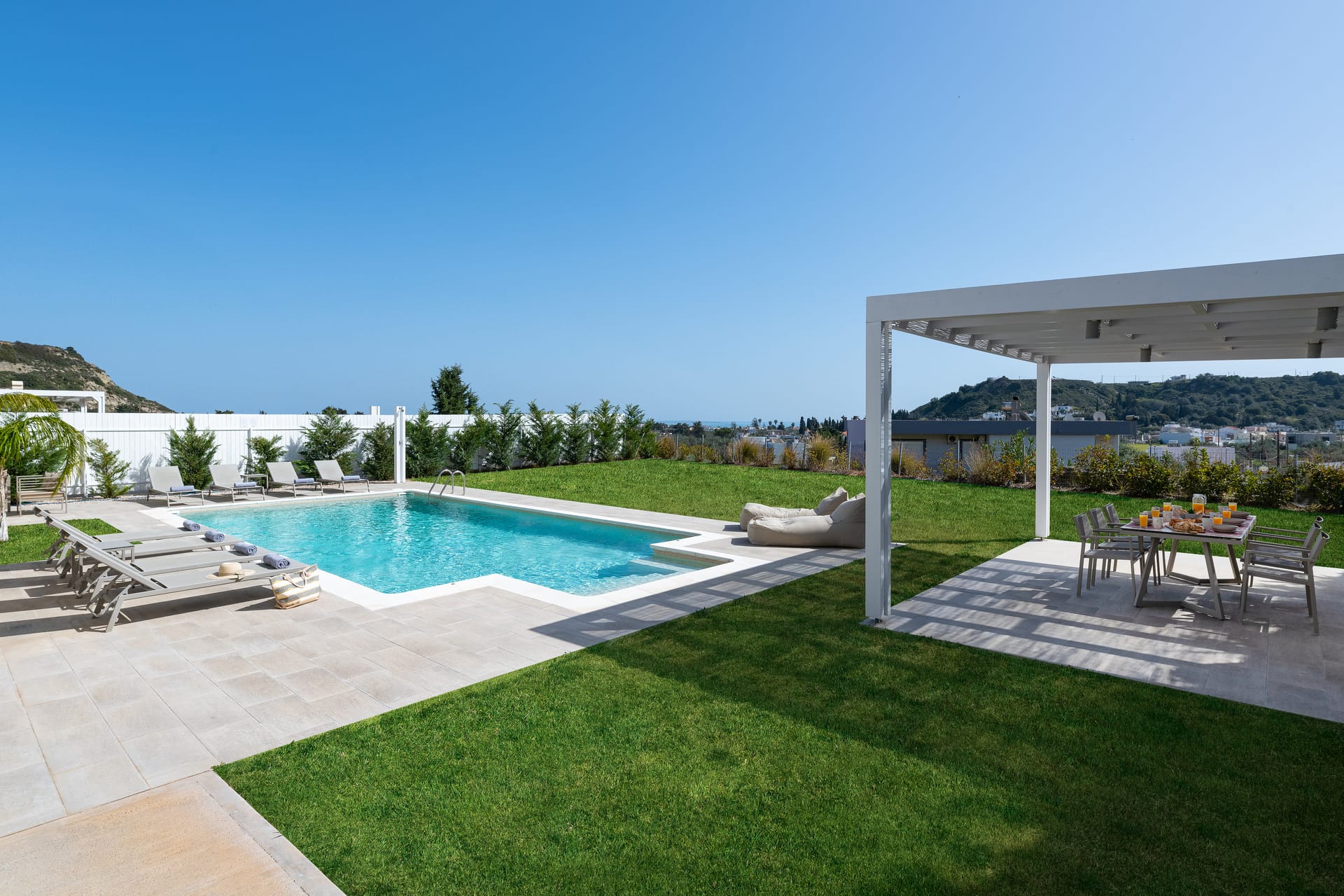 The villa is conveniently located with all essential amenities nearby. The nearest beach is just a few meters away, while a supermarket is only 500 meters from the villa. A pharmacy is located 1.5 km away, making daily shopping and errands simple. Rhodes International Airport is approximately 50 km away, with a drive time of around 45 to 50 minutes.