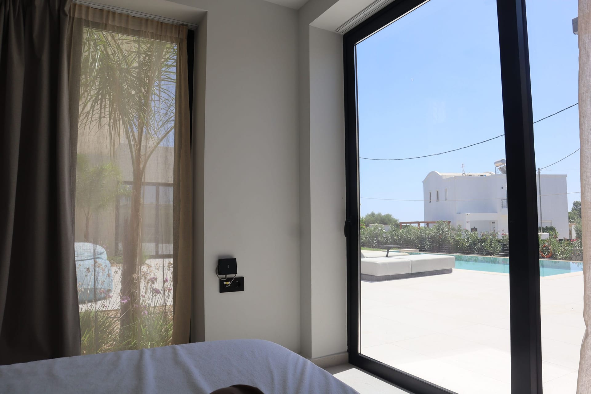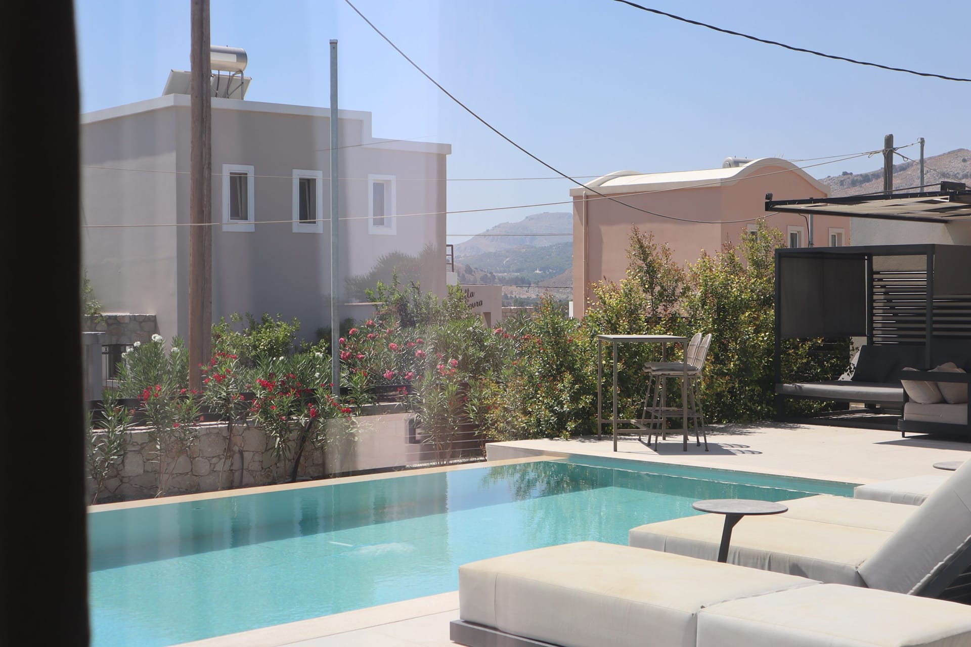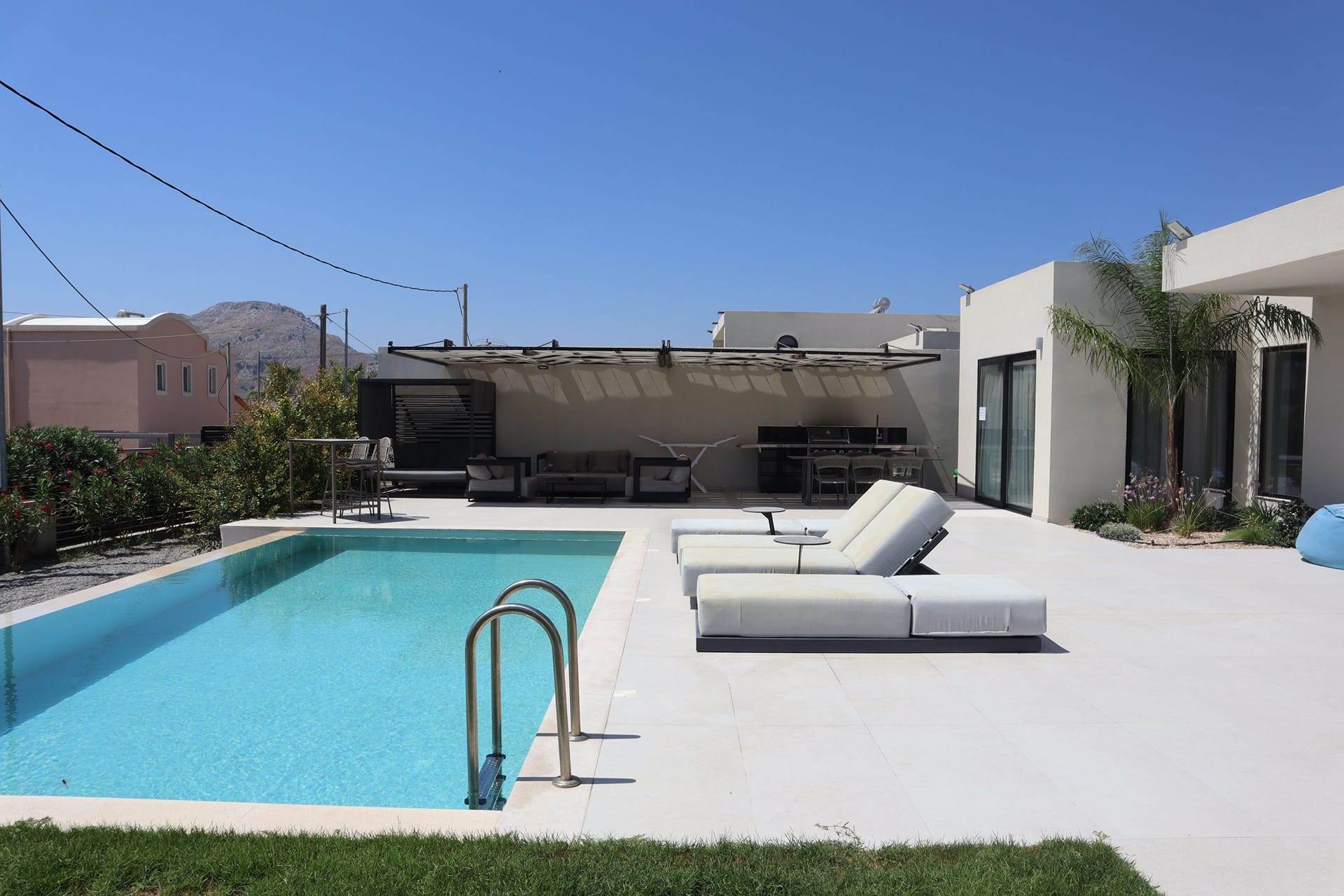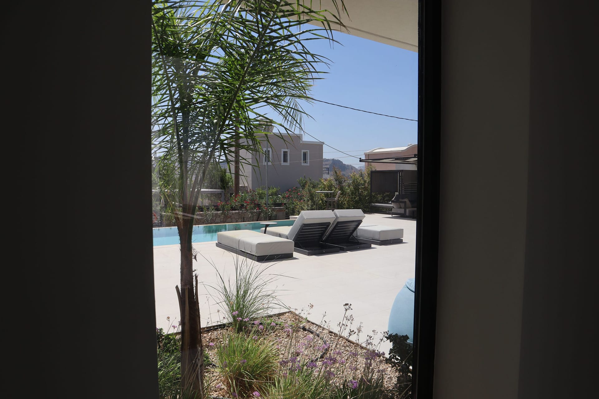 There’s a fully equipped kitchen in warm colors, suitable for any meal preparation accompanied by the seating area and the living room. There’s a smart TV and free WIFI access throughout the property. Outdoors, there’s a private swimming pool and jacuzzi with sunbeds and a seating area where you can relax under the rays of the Aegean sun. You can spend your time by your private swimming pool or enjoy a fresh meal prepared in the BBQ installation. Additionally, there is a shared outdoor gym, so you can stay fit throughout your holidays in Rhodes. For your entertainment, you will find a sharing ping pong table, mini golf, and pool table.
