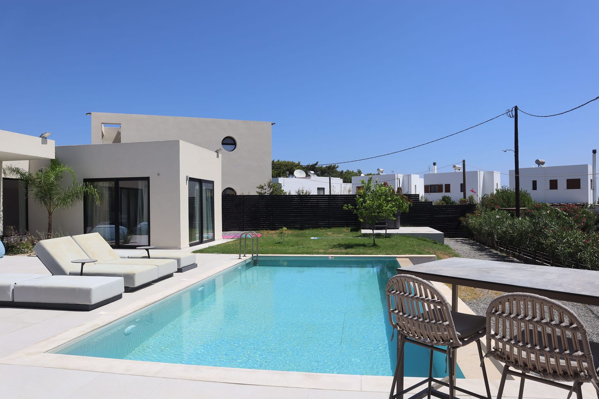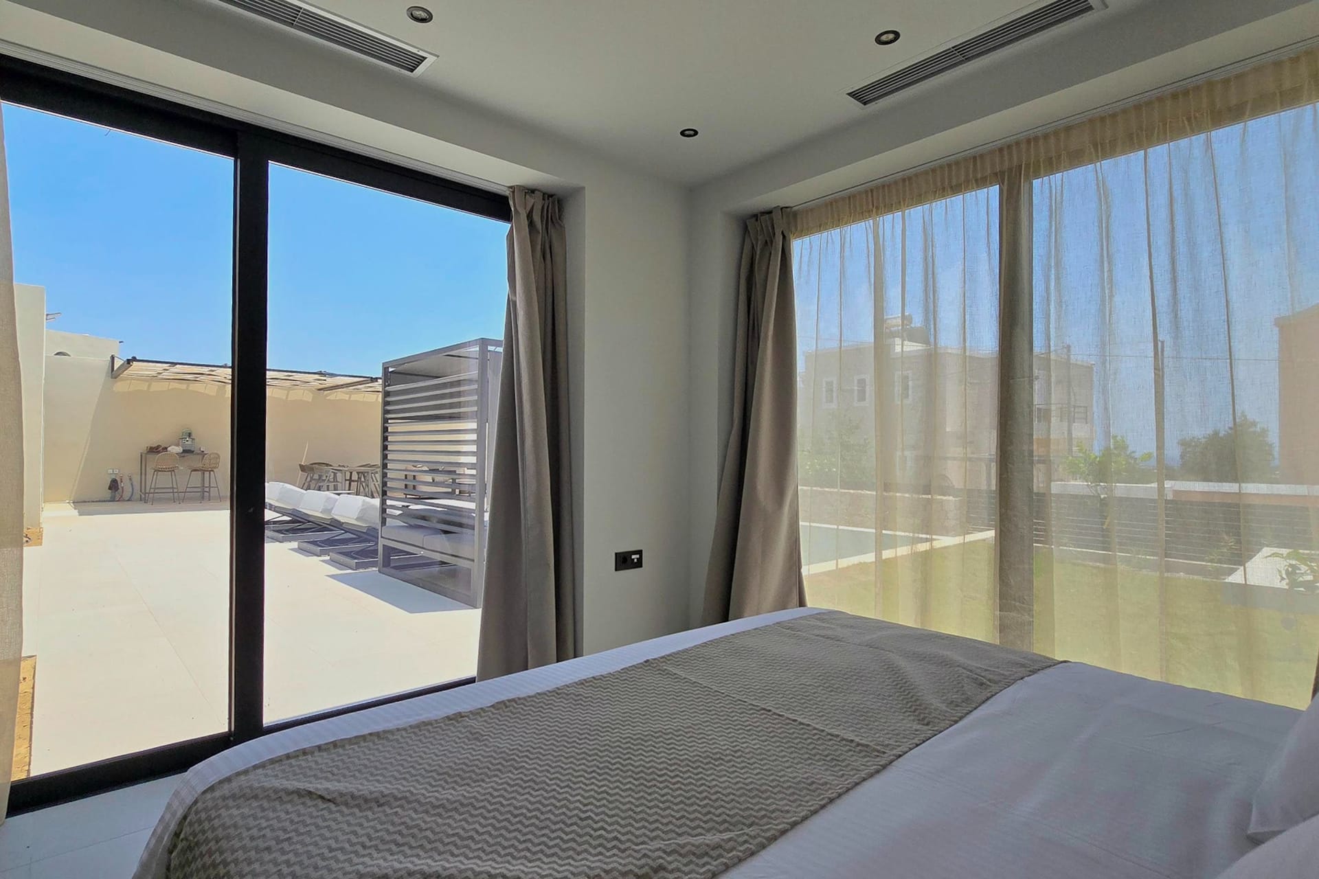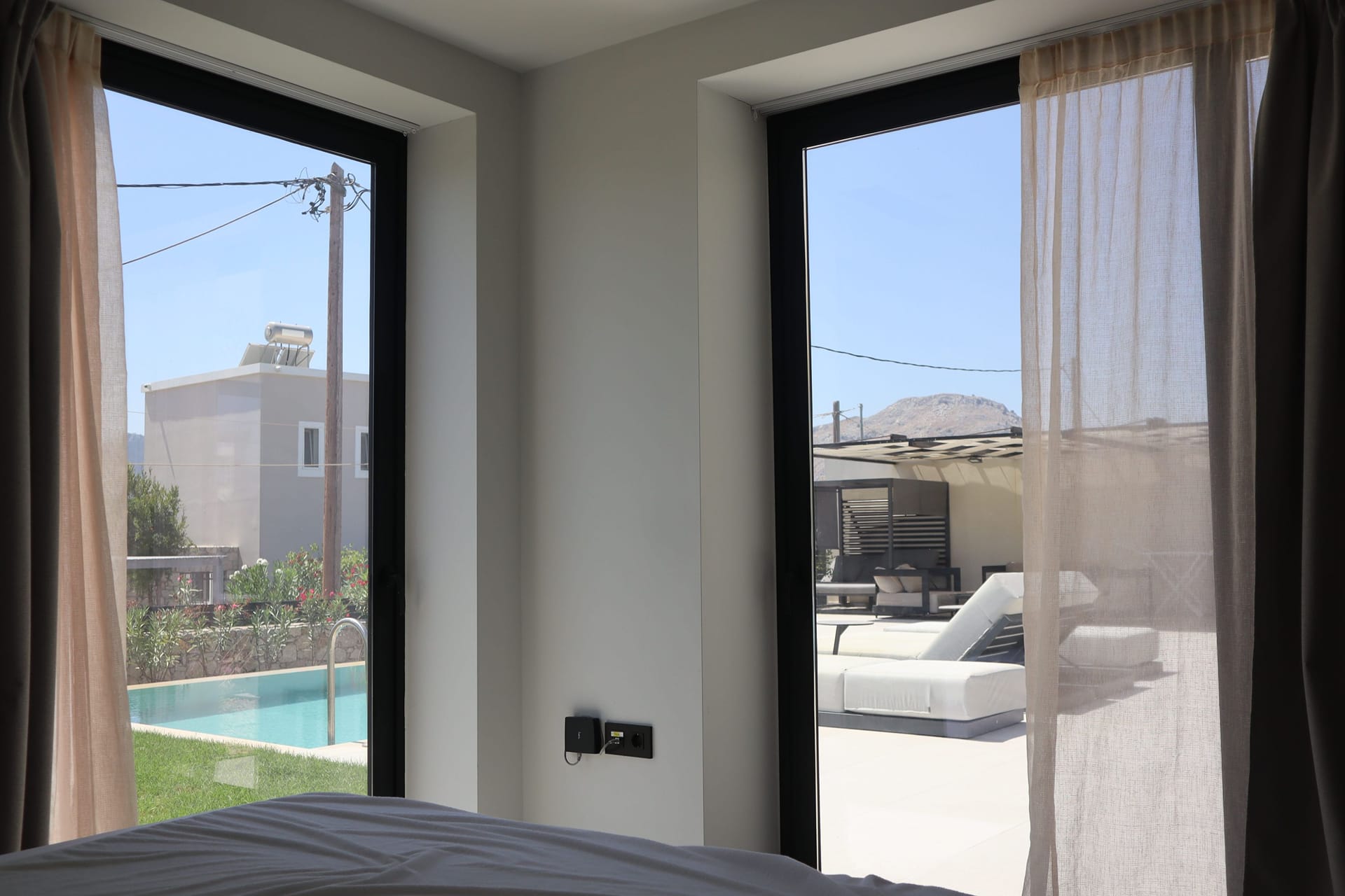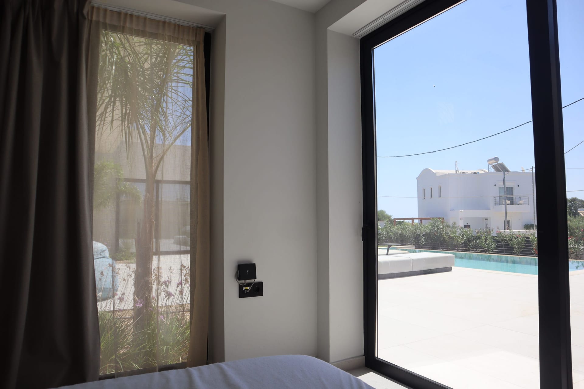 There’s a fully equipped kitchen in warm colors, suitable for any meal preparation accompanied by the seating area and the living room. There’s a smart TV and free WIFI access throughout the property. Outdoors, there’s a private swimming pool and jacuzzi with sunbeds and a seating area where you can relax under the rays of the Aegean sun. You can spend your time by your private swimming pool or enjoy a fresh meal prepared in the BBQ installation. Additionally, there is a shared outdoor gym, so you can stay fit throughout your holidays in Rhodes. For your entertainment, you will find a sharing ping pong table, mini golf, and pool table.