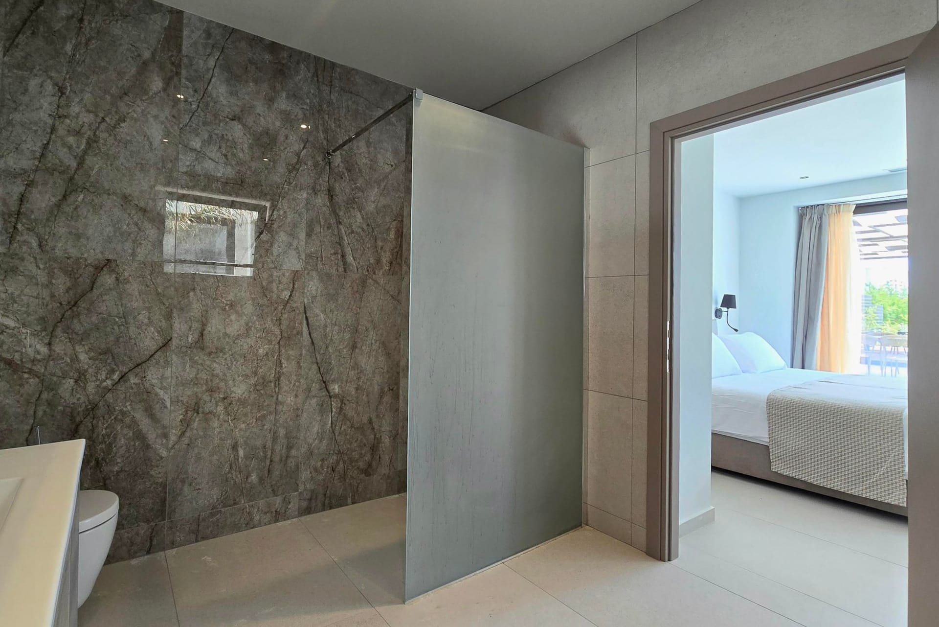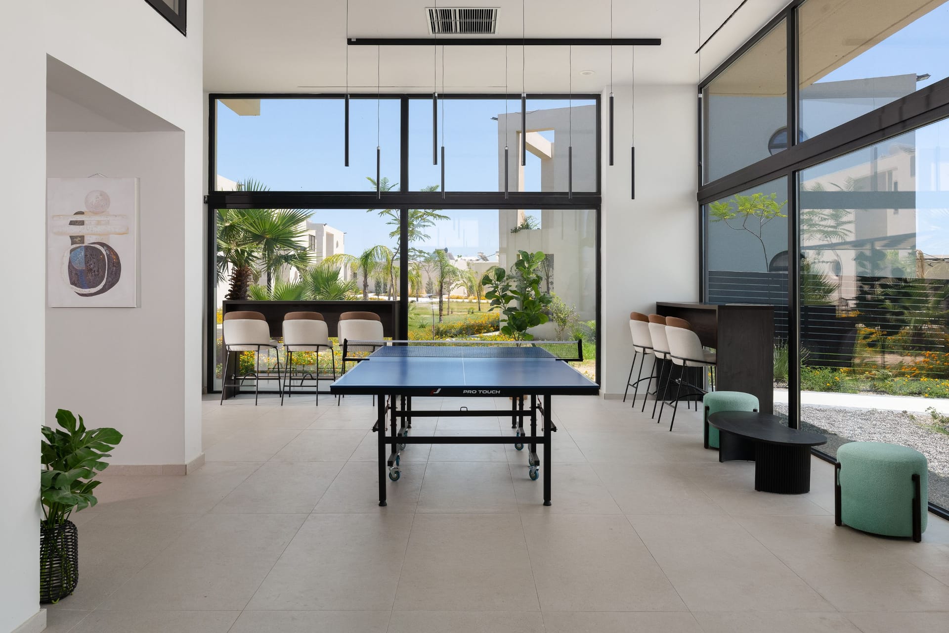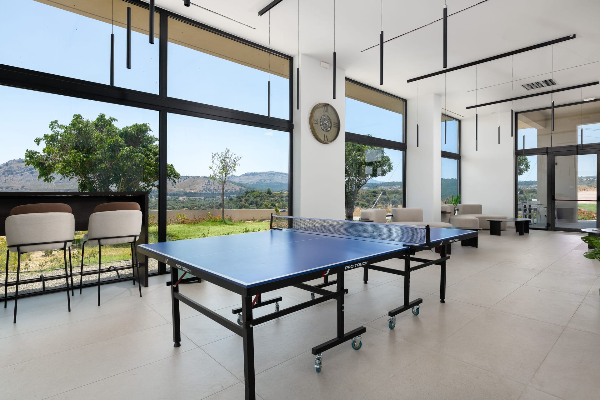 There’s a fully equipped kitchen in warm colors, suitable for any meal preparation accompanied by the seating area and the living room. There’s a smart TV and free WIFI access throughout the property. Outdoors, there’s a private swimming pool and jacuzzi with sunbeds and a seating area where you can relax under the rays of the Aegean sun. You can spend your time by your private swimming pool or enjoy a fresh meal prepared in the BBQ installation. Additionally, there is a shared outdoor gym, so you can stay fit throughout your holidays in Rhodes. For your entertainment, you will find a sharing ping pong table, mini golf, and pool table.