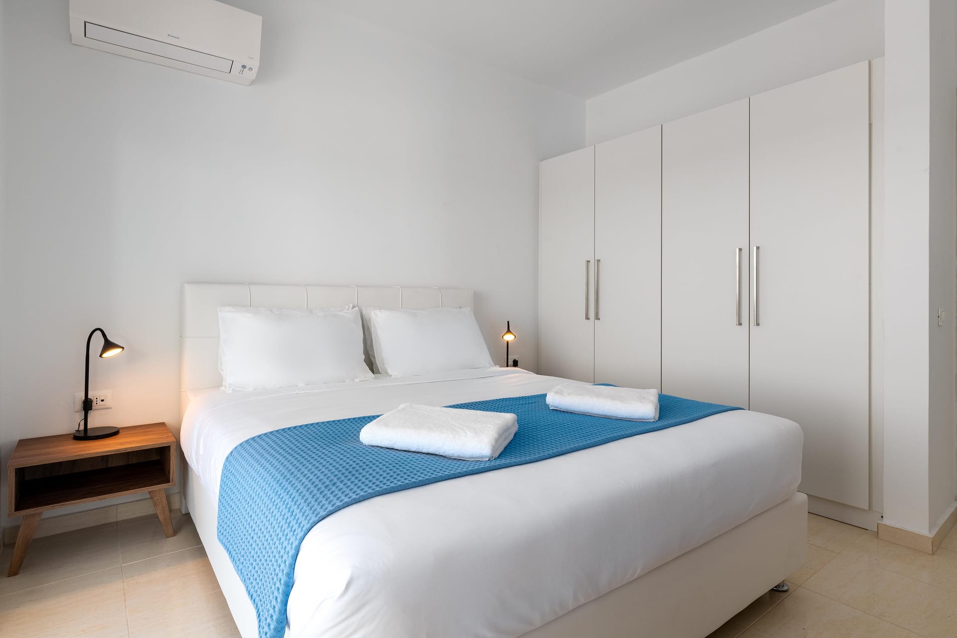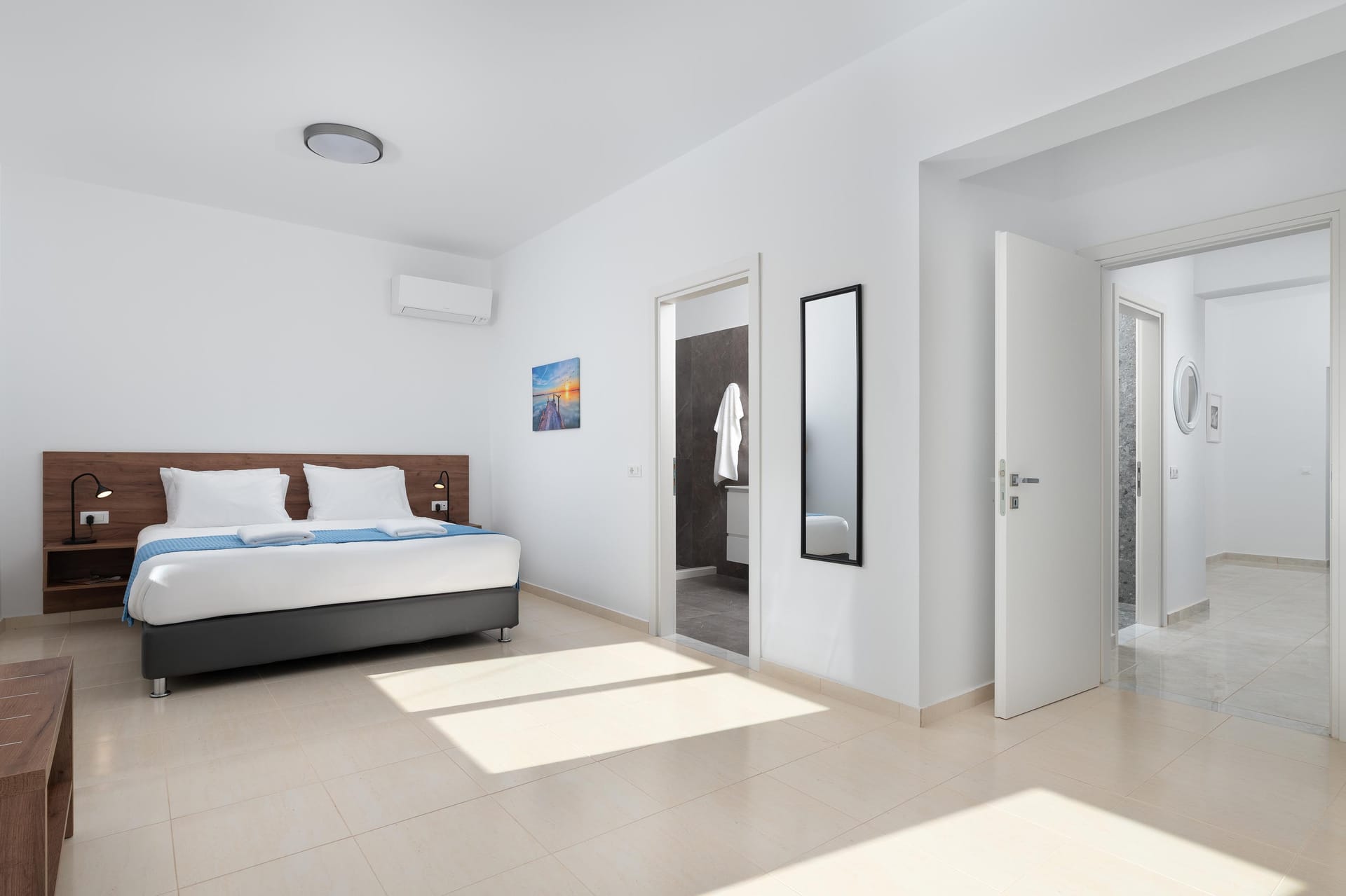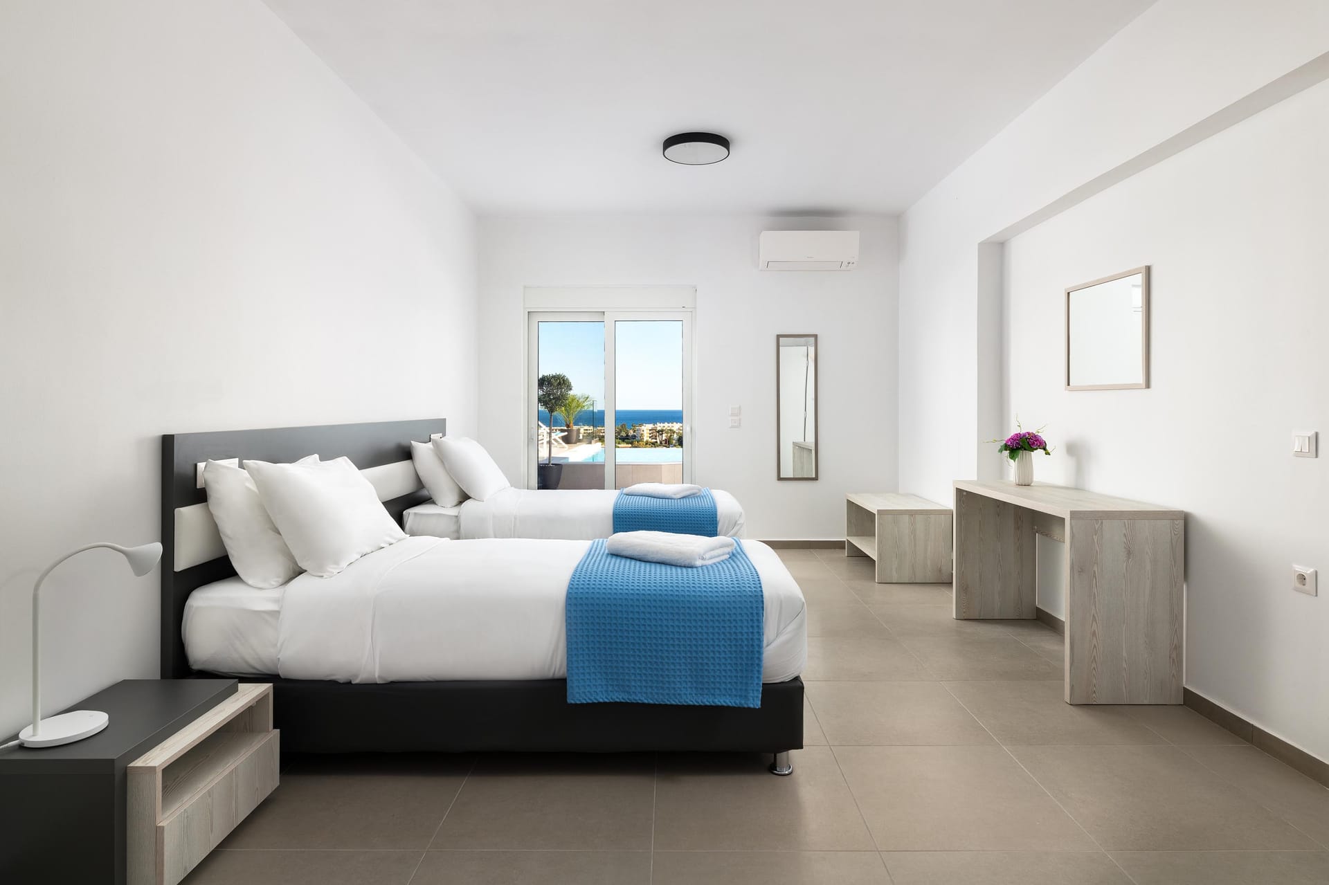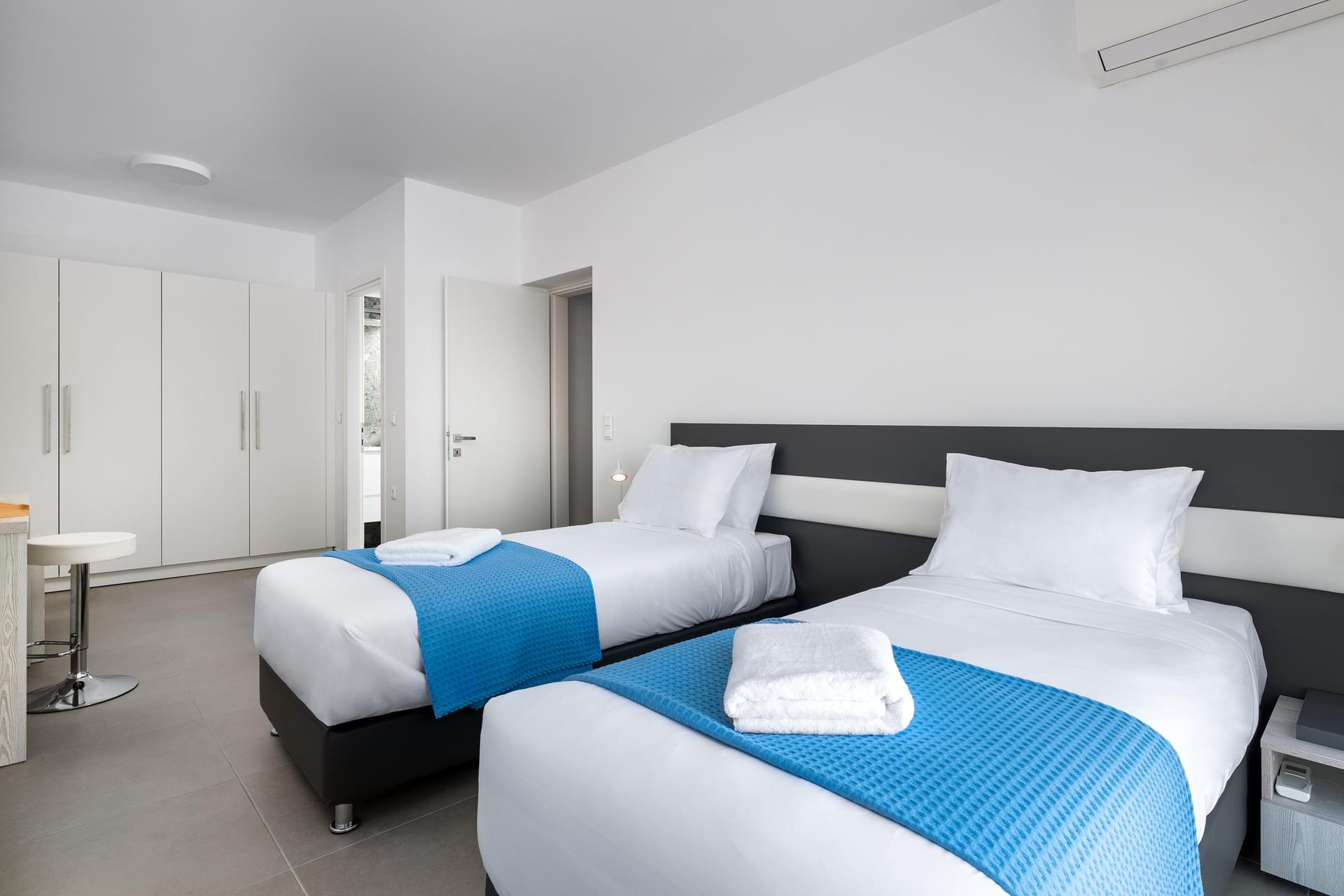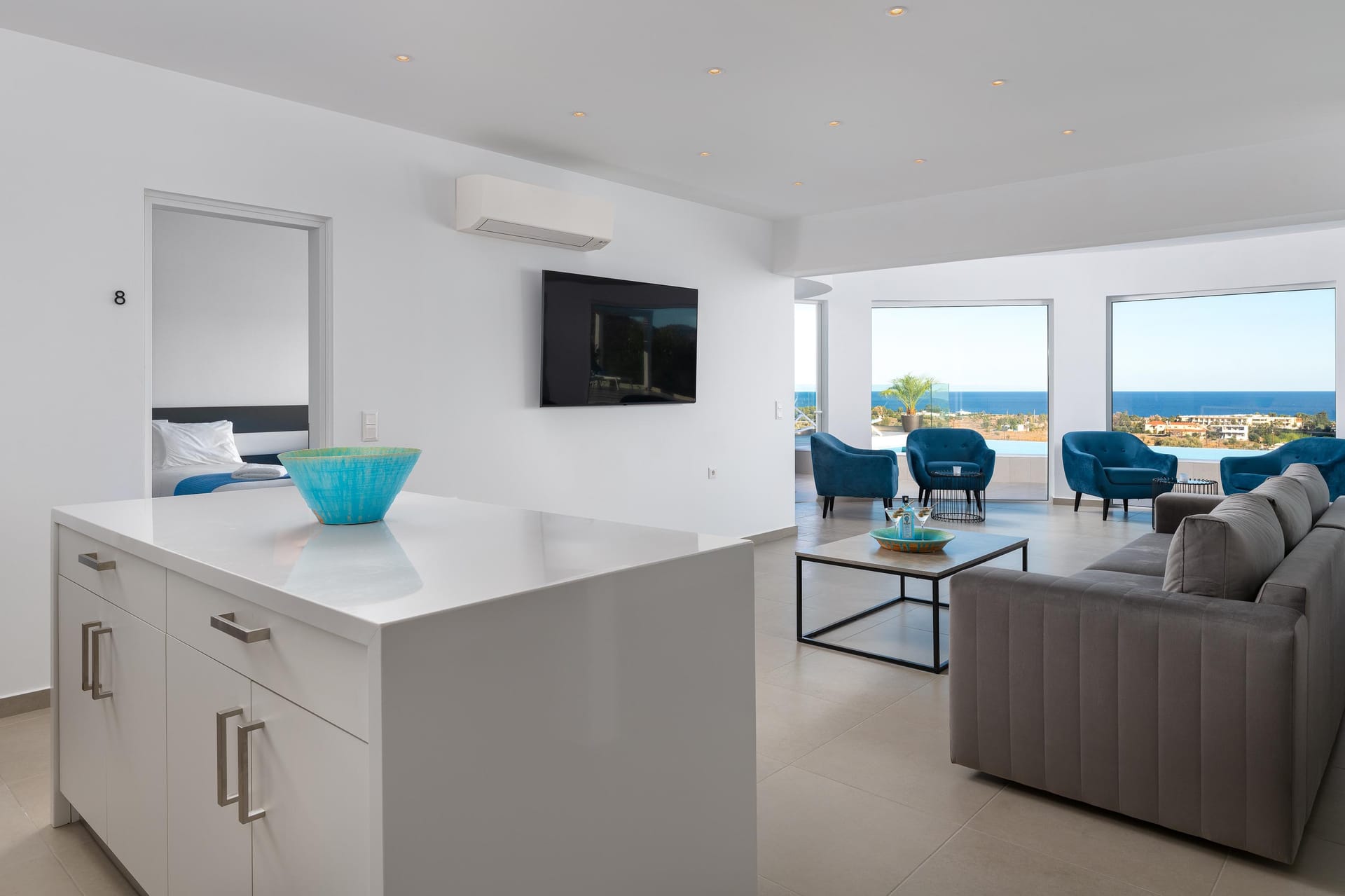 Villa Zoe Blu offers spacious living with luxurious comforts, making it feel like home. The villa has 9 bedrooms in total: 4 on the upper floor and 5 on the pool level. On the upper floor, there are 4 bedrooms with king-size beds, two of which have ensuite bathrooms. The pool level has two king-size bedrooms and three rooms with two single beds in each, all with ensuite bathrooms. In total, there are 7 bathrooms, all equipped with showers—5 of which are attached to the bedrooms.
