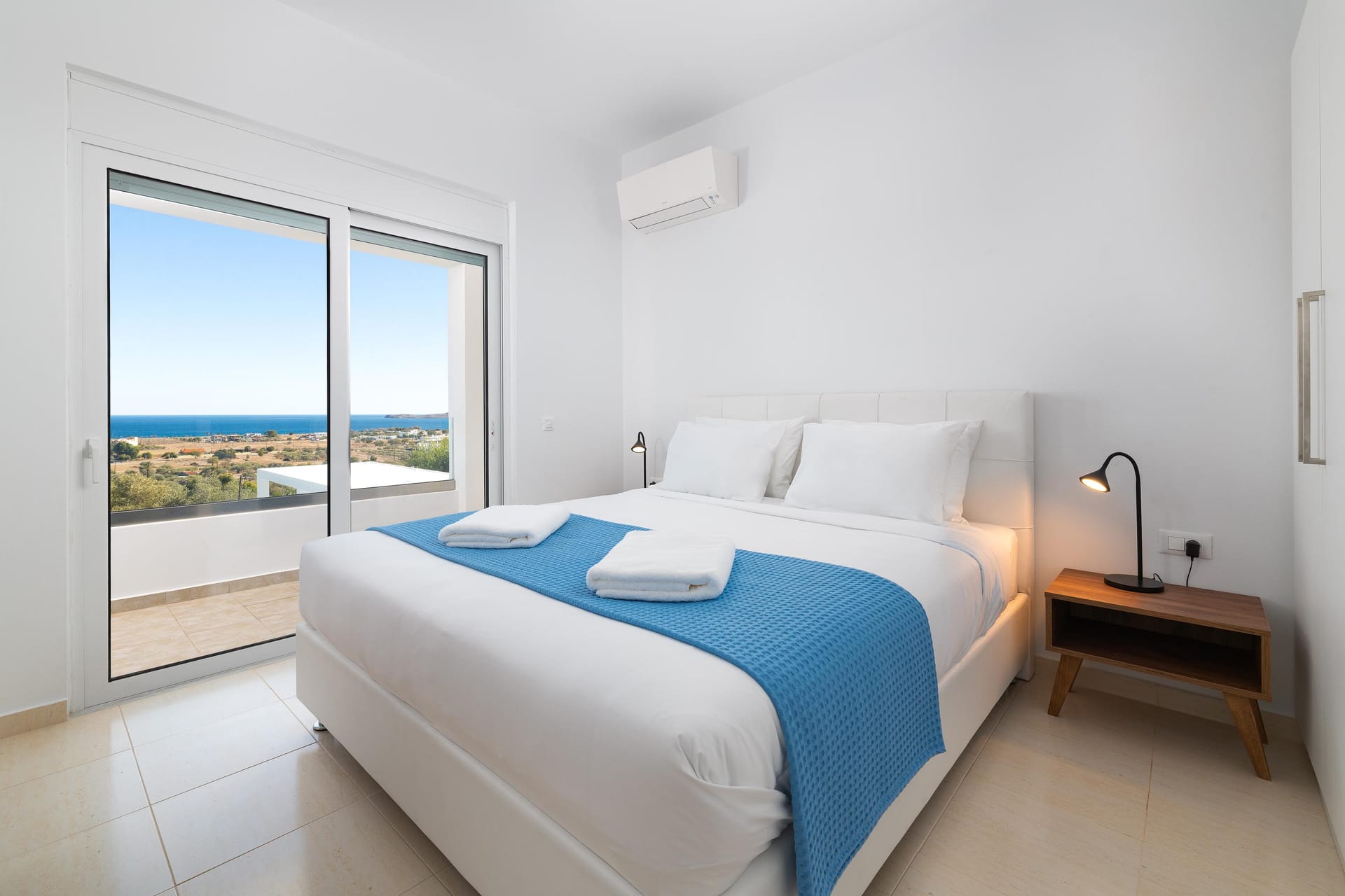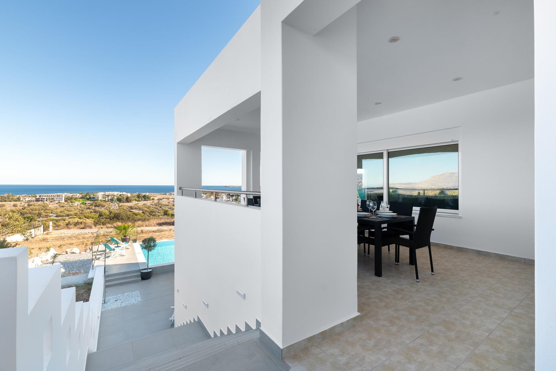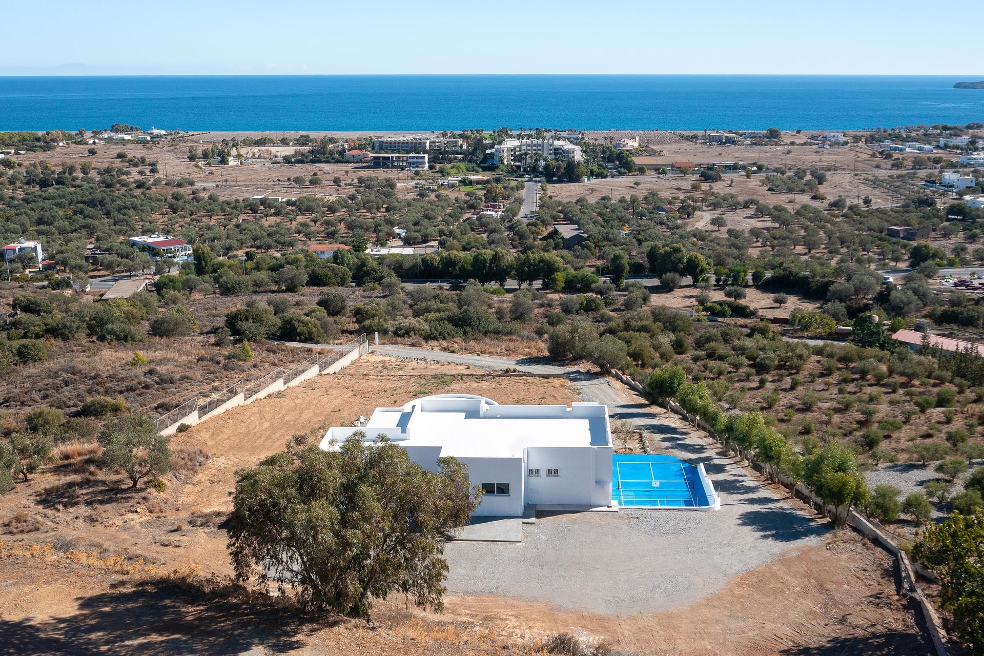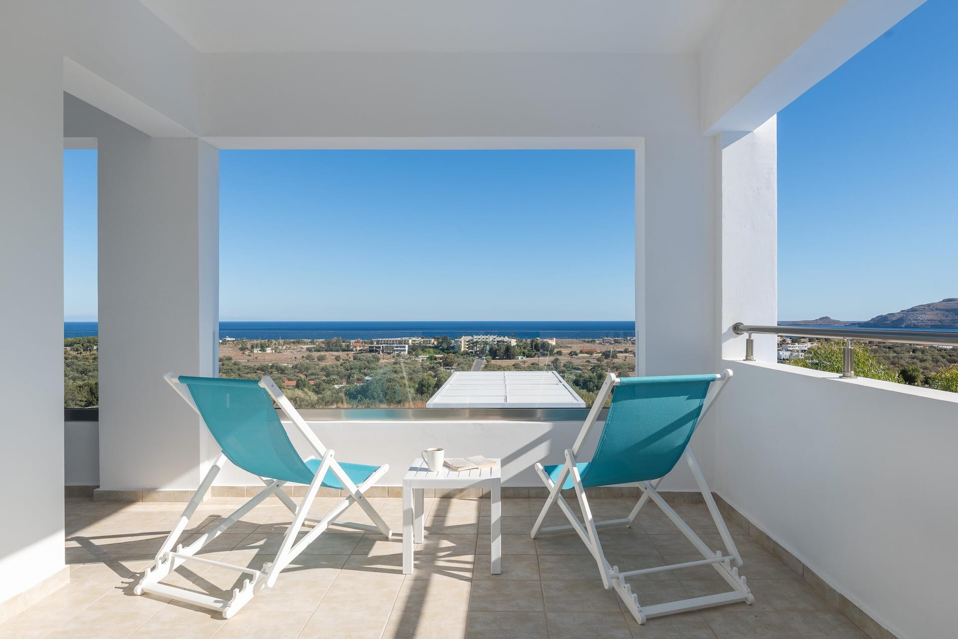 Outdoors, you’ll find a private swimming pool with stunning sea views, an outdoor BBQ, a dining area, and a comfortable sitting area for relaxing. For extra fun, there’s a pickleball court, the first of its kind on Rhodes. Whether you’re lounging by the pool, enjoying the balcony vi