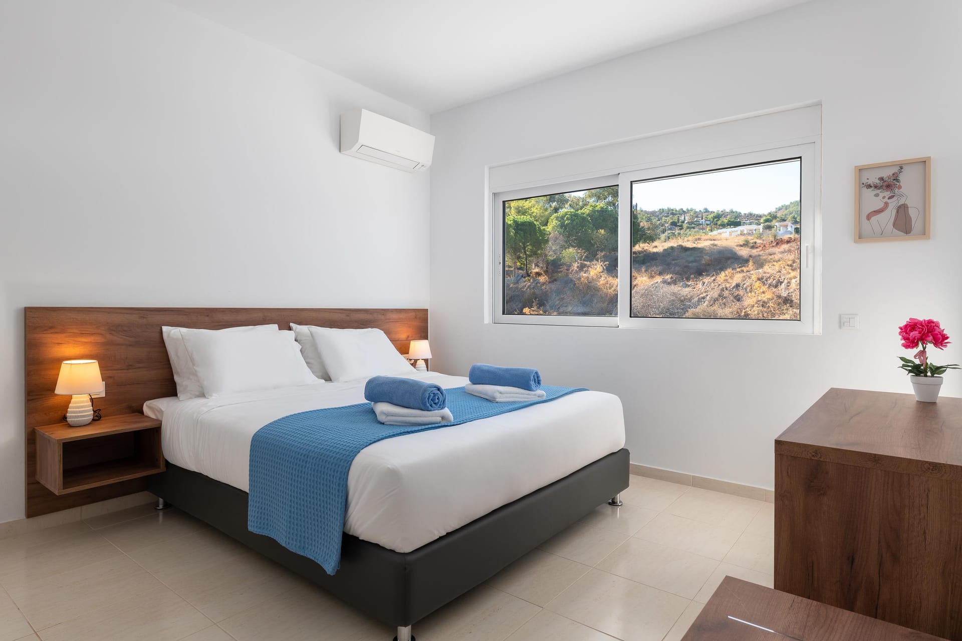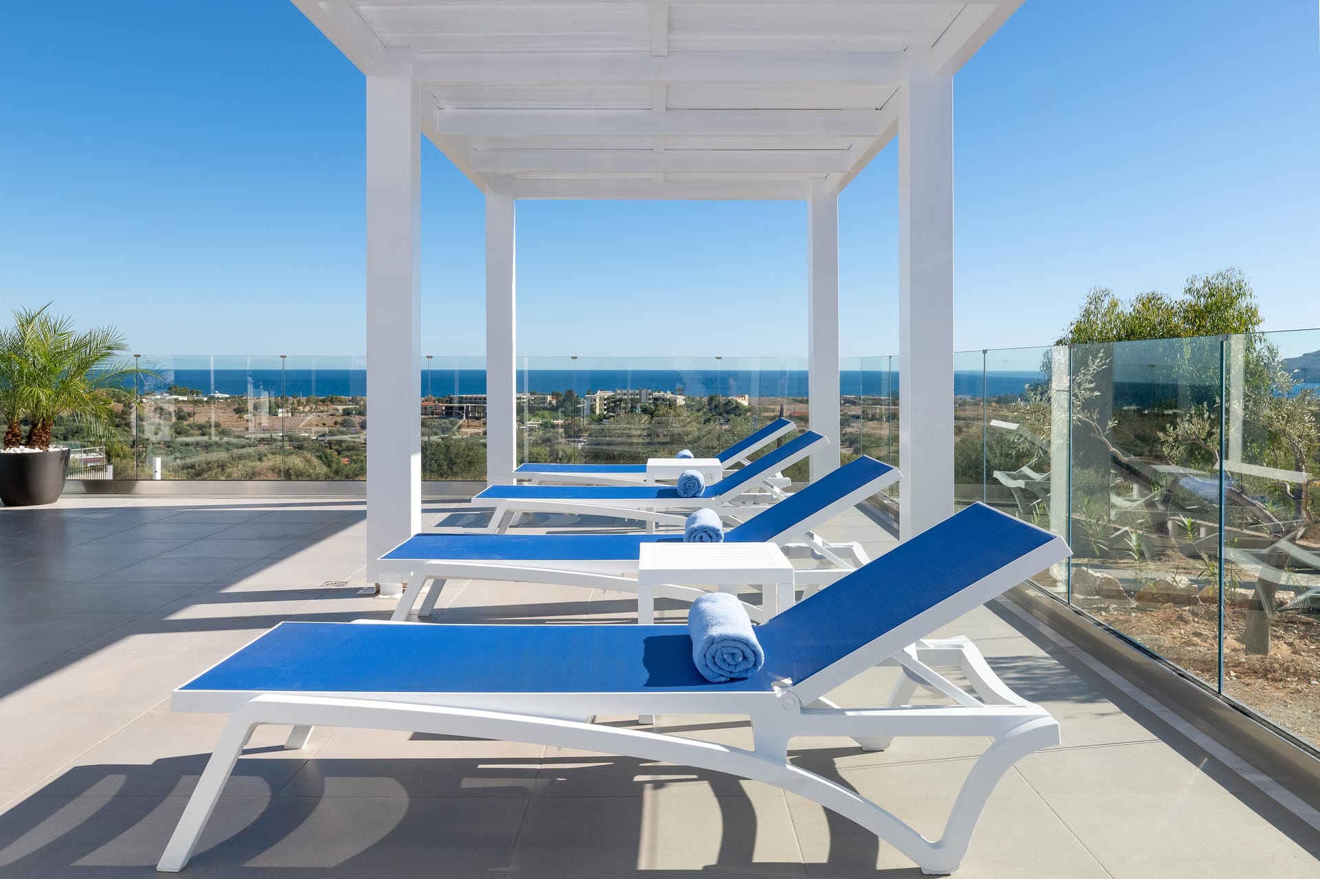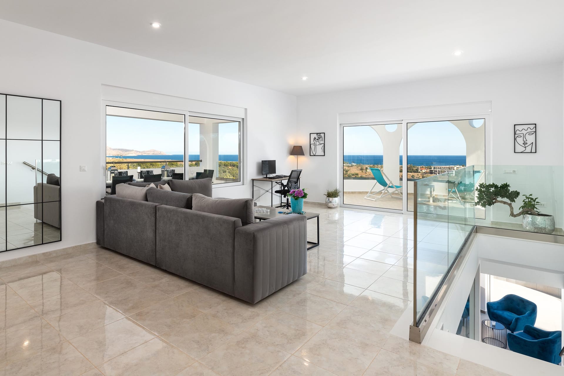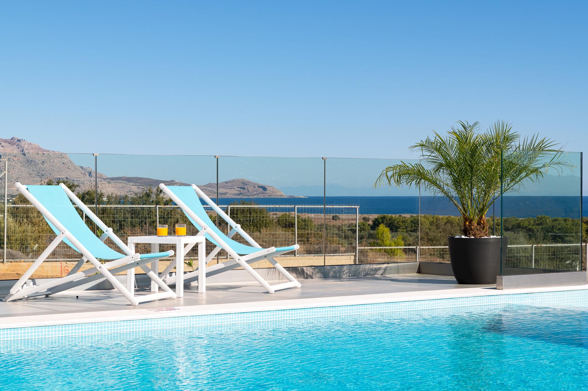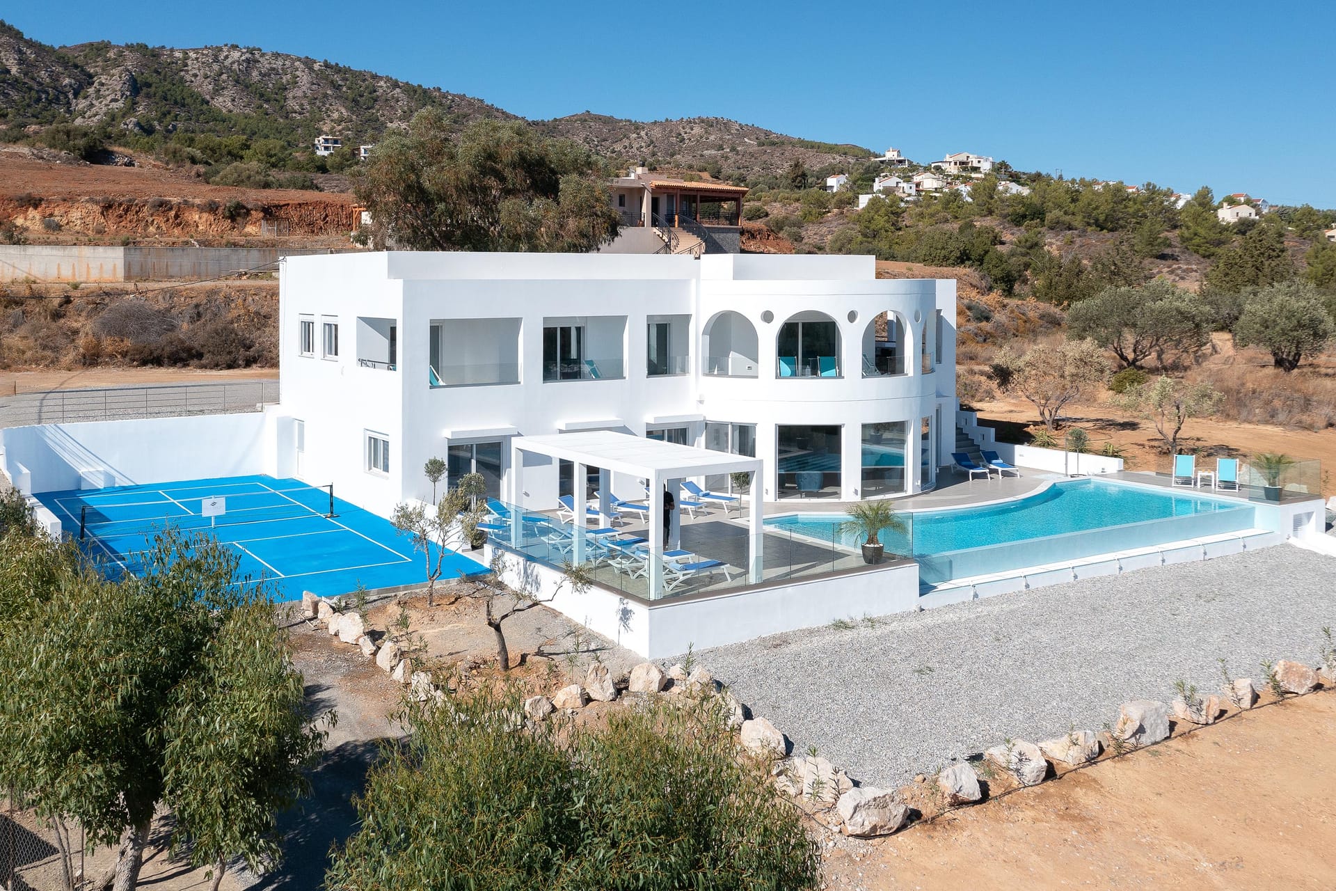 Outdoors, you’ll find a private swimming pool with stunning sea views, an outdoor BBQ, a dining area, and a comfortable sitting area for relaxing. For extra fun, there’s a pickleball court, the first of its kind on Rhodes. Whether you’re lounging by the pool, enjoying the balcony vi