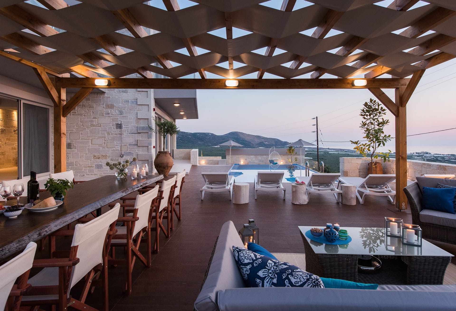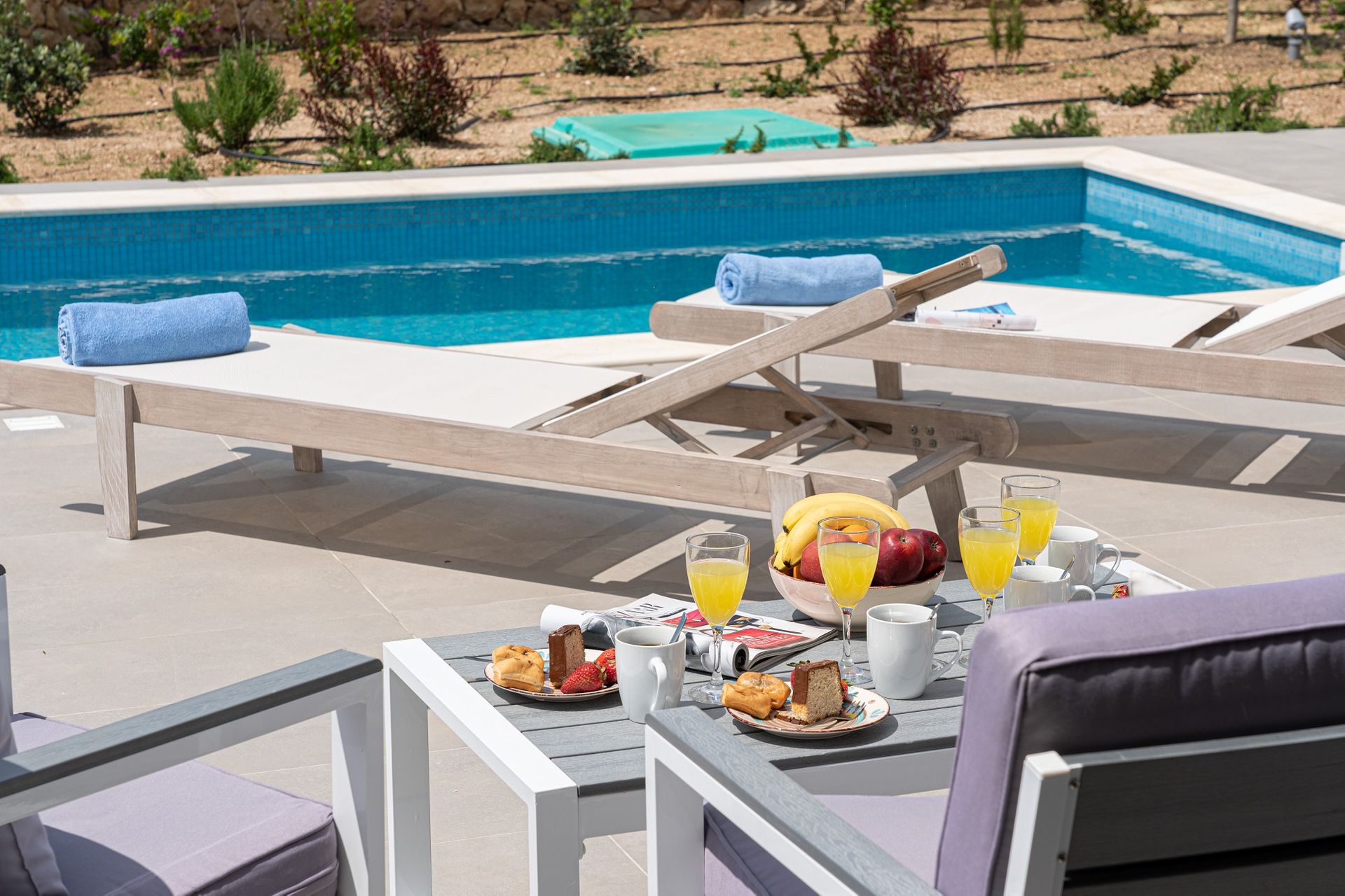 Stepping outside you are taken to the extensive tiled patio areas, leading to the stunning private swimming pool, all finished with gleaming mosaic tiles and a solid stone surround. The casual Al Fresco seating area allows you to relax and enjoy morning breakfast or maybe evening cocktails and luxurious sun beds are available for those lazy summer days where you literally need to do nothing other than swim and sunbathe all day long. The delightful garden areas are all laid to soil with feature shrubs and trees and an array of beautiful flowers complete the whole package of what Pessadiana Retreat has to offer it’s lucky guests both internally & externally.