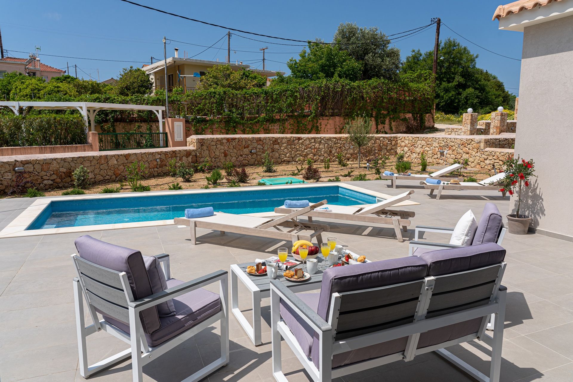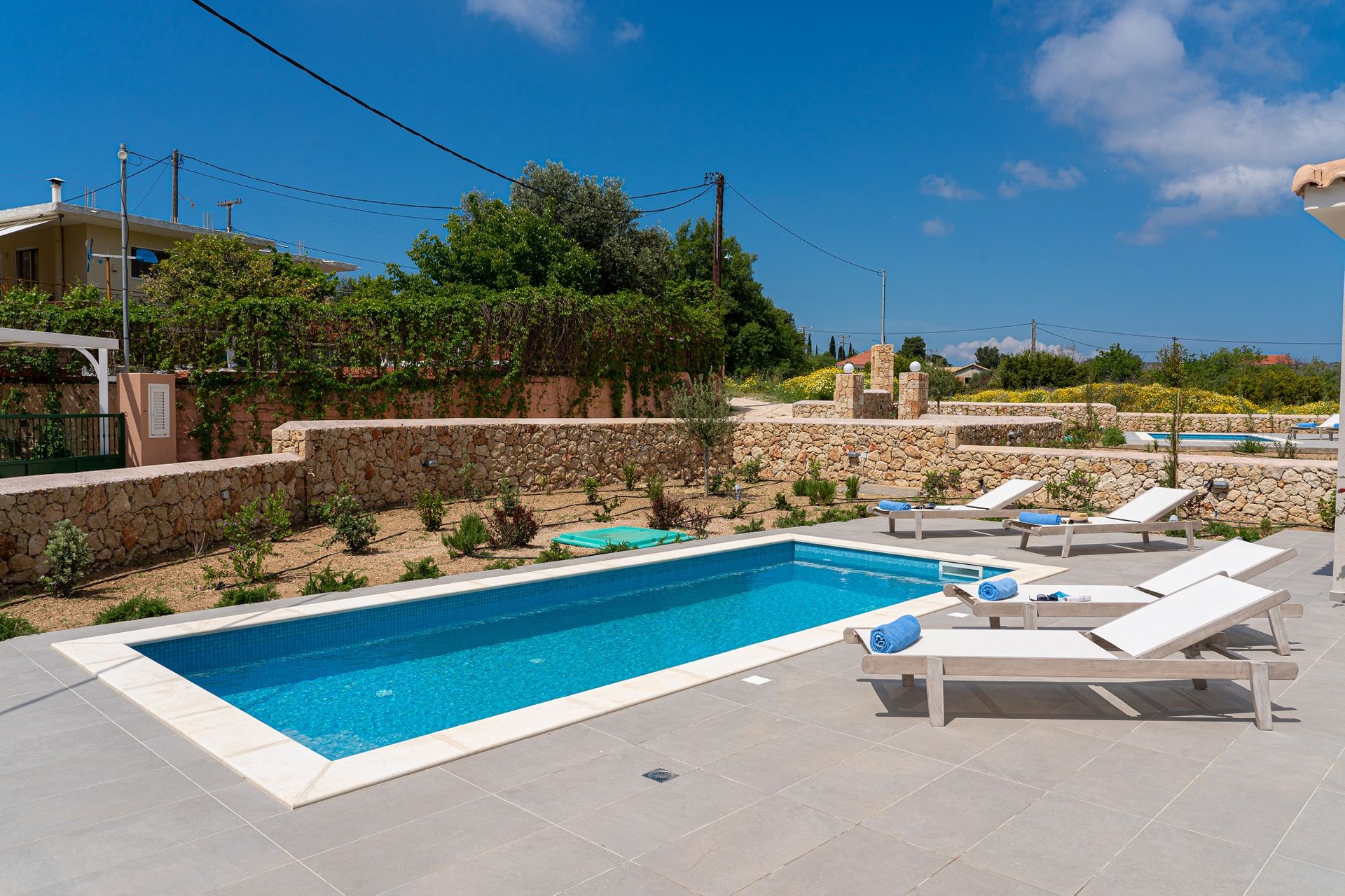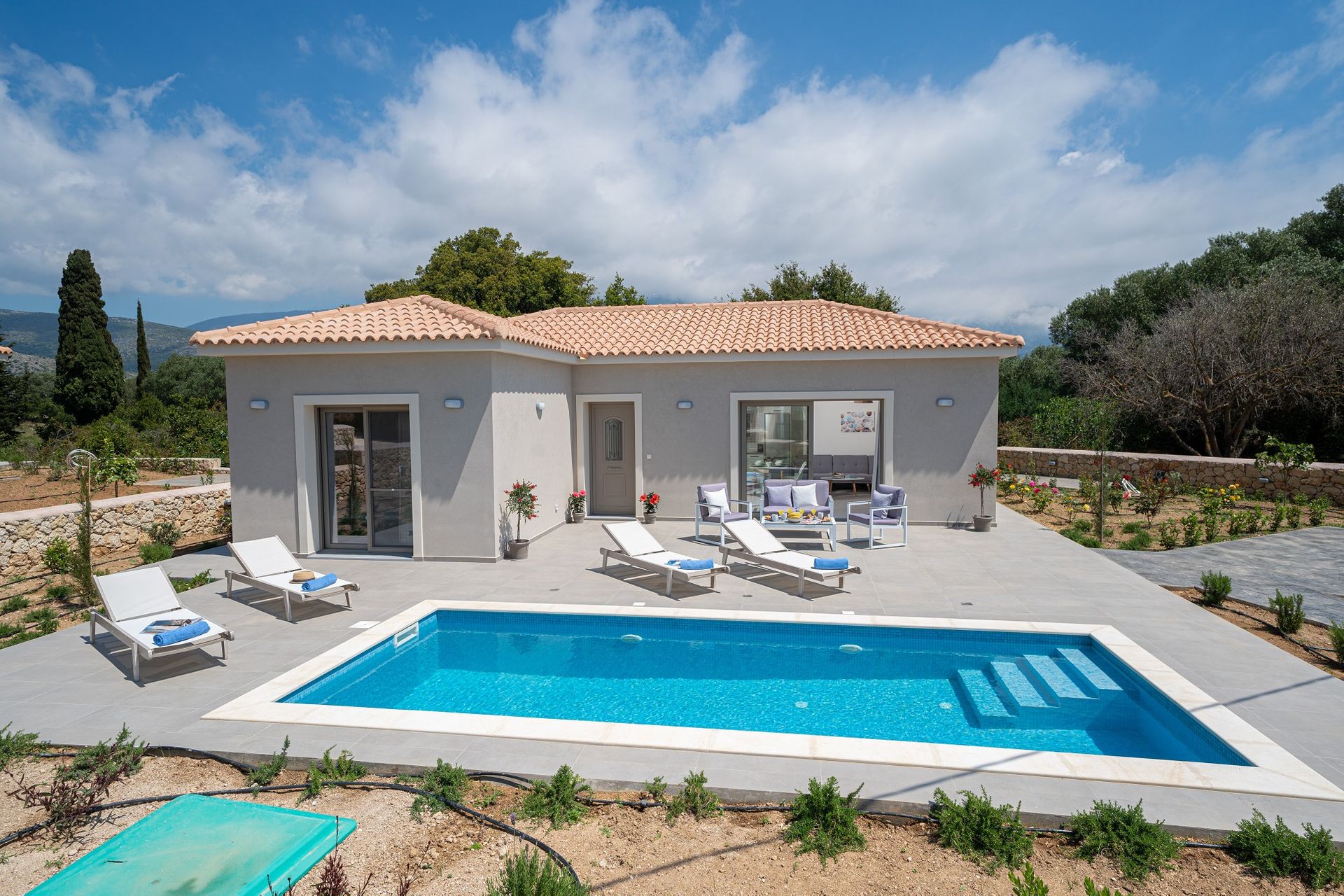 This very peaceful and idyllic holiday retreat is built to the very highest of standards & finishes throughout, in a modernistic fashion, whilst still managing to keep aspects of traditional styling, allowing the perfect blend of new & traditional Kefalonian architecture.