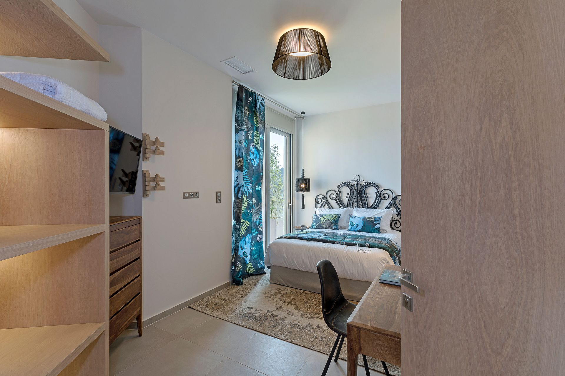 Imagine a bedroom in Santorini that feels as if it's been carved from the very rock of the island itself. bathed in the warm, golden light of the Aegean sun. The double bed, dressed in crisp white linens, is the centerpiece, inviting you to relax.