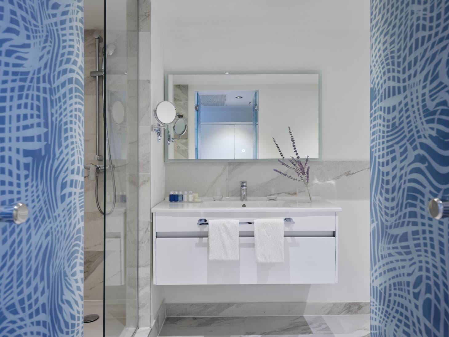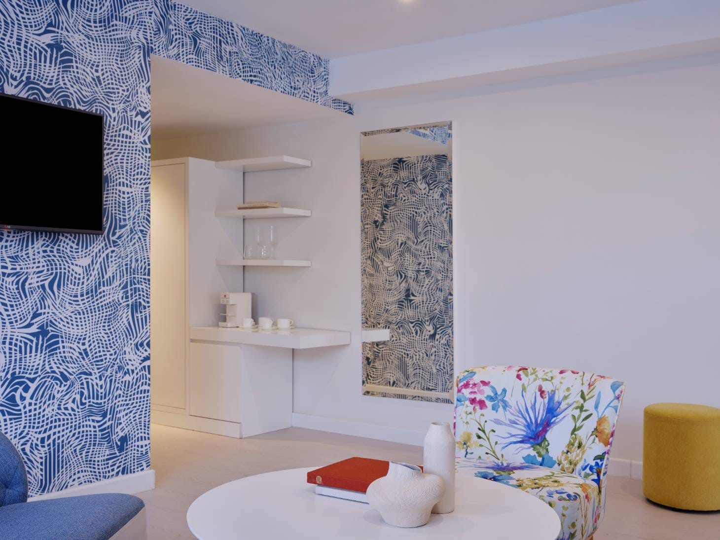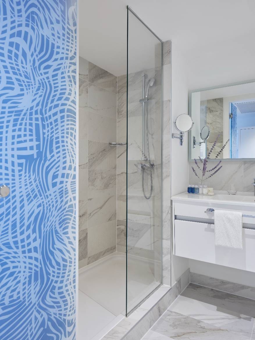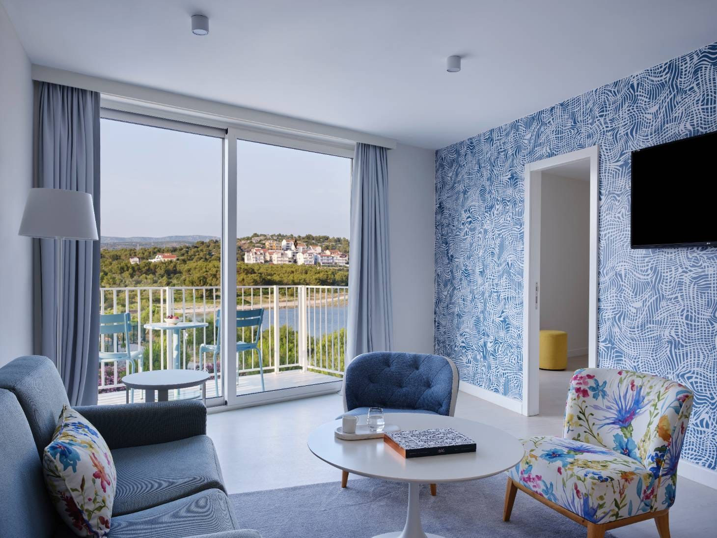 Soak in sweeping sea views from two furnished private balconies in this sunlit family suite. With a separate bedroom for adults, a fun-filled bunk-bed room for kids, and a cozy living area, the suite blends privacy and togetherness with seamless style. Bold patterns and soft coastal hues bring a fresh Dalmatian vibe, while two flat-screen TVs, a sleek bathroom, and abundant natural light enhance every moment. Whether sharing stories in the lounge or enjoying quiet moments in your own room, this spacious retreat is designed for relaxing days, heavenly sleeps, and meaningful family connection.