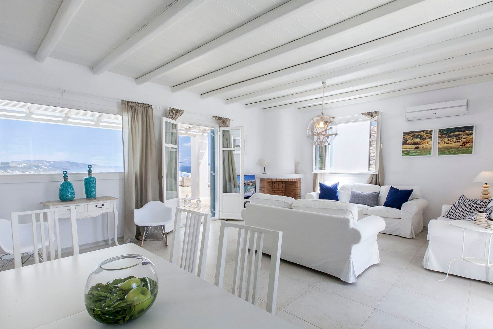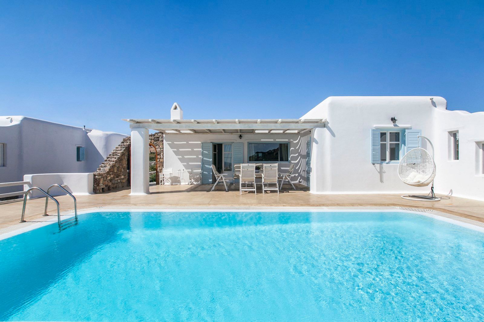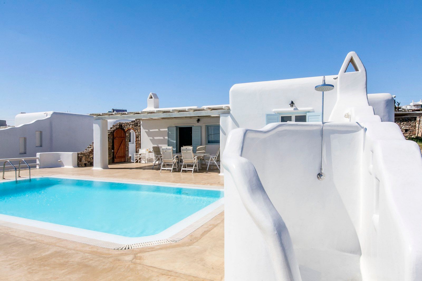 Outside, a covered veranda offers al-fresco dining and shaded seating, while the pool deck with sunbeds overlooks the valley and sea. The inviting swimming pool is perfect for cooling off, and a large communal pool is also available.