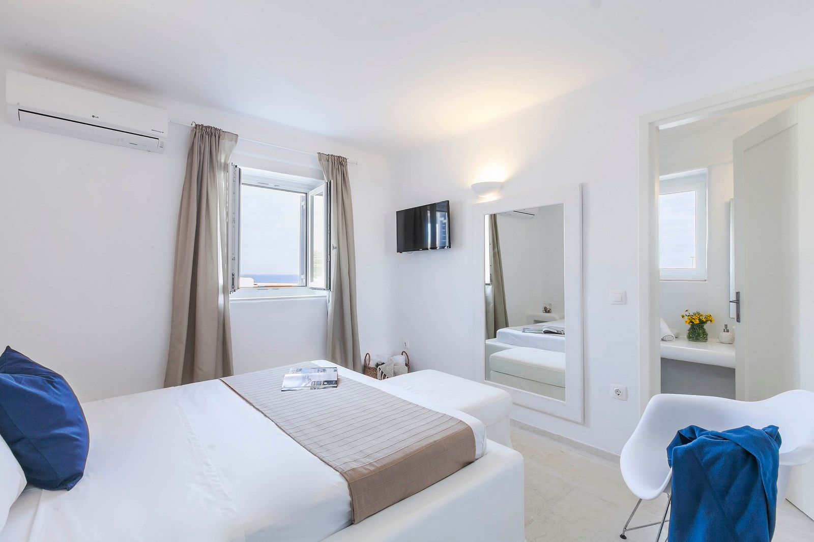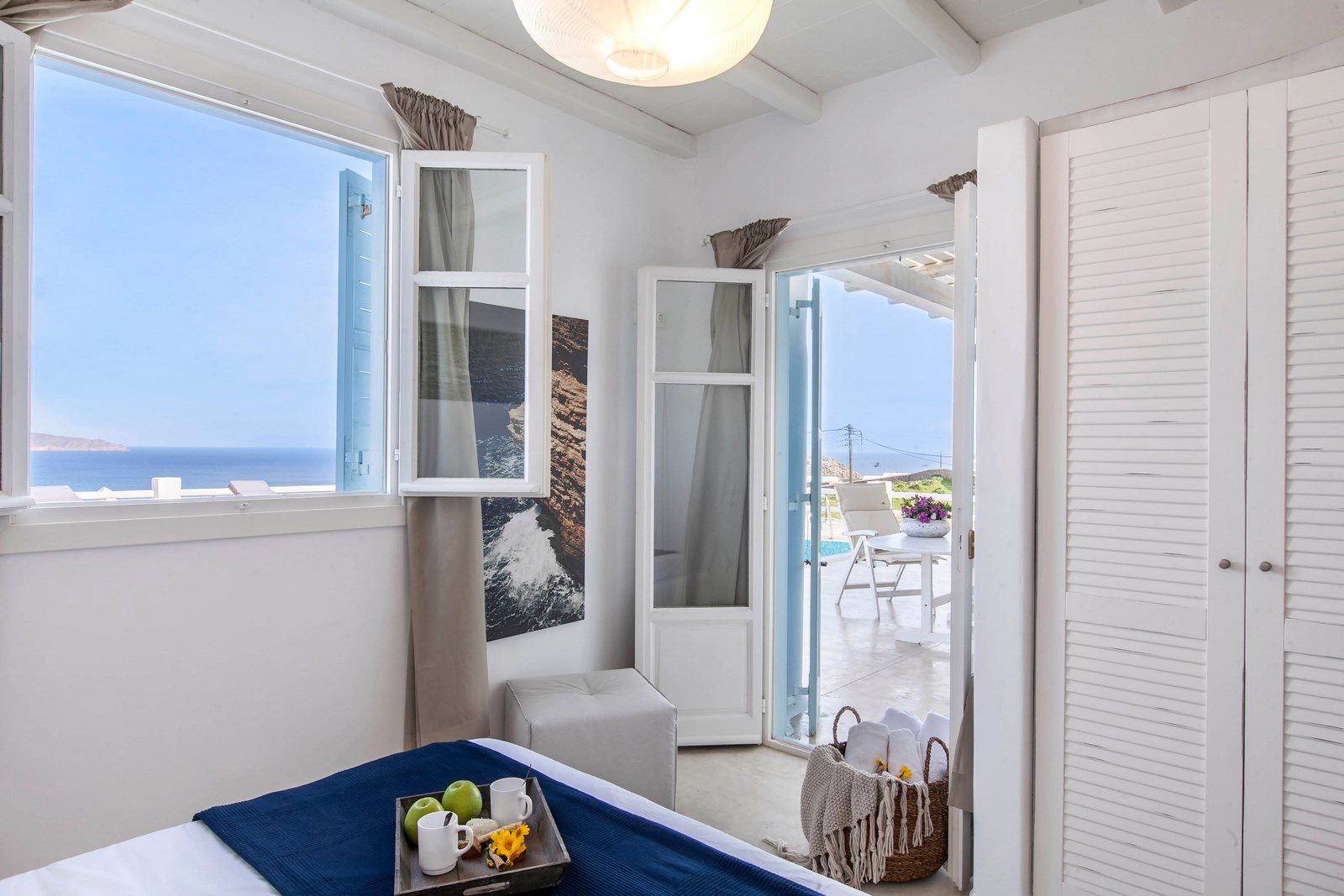 Two bedrooms are on the ground floor: one with a Double bed and en-suite bathroom with double washbasins, opening onto the pool terrace; the other a twin with en-suite shower room. Both bedrooms feature fresh, neutral décor.Upstairs, the master suite has a Double bed, high pitched ceiling, spacious en-suite bathroom with bath, shower, and double washbasins, plus a private balcony and large furnished terrace overlooking the sparkling sea.
