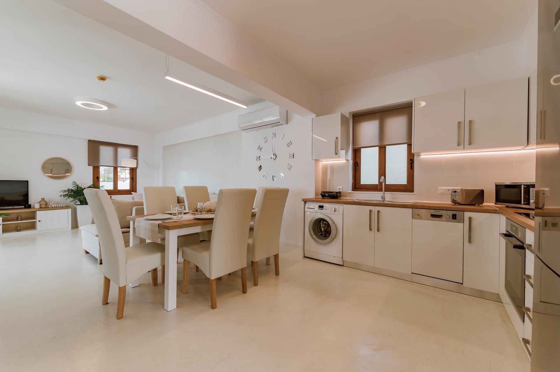 Set on one level, the villa features a spacious open-plan layout with modern furnishings, concealed air conditioning, and a fully equipped kitchen. The master bedroom has a double bed and en-suite shower room, while two twin bedrooms (convertible to doubles) share a second bathroom with shower.